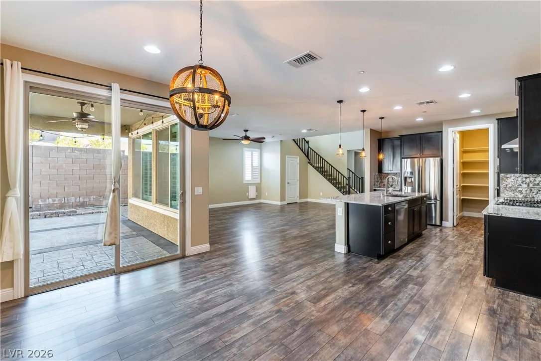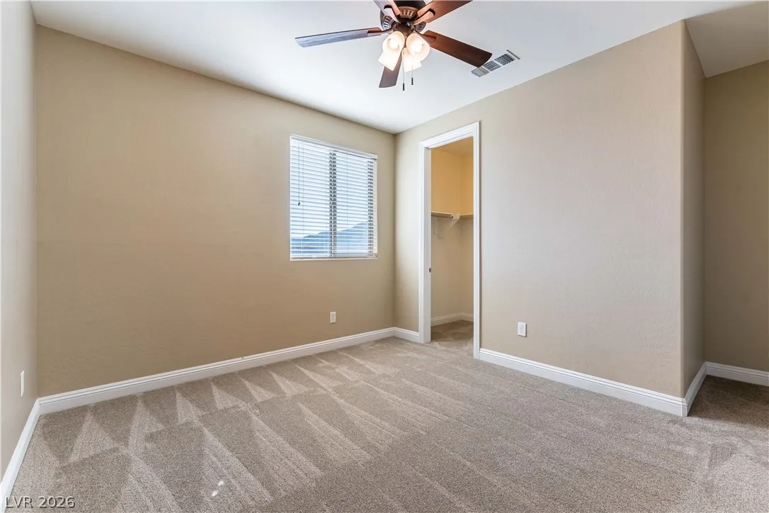 Welcome to this 2-story, 3-bedroom home designed for both comfort and style. Step inside to an open-concept layout featuring wood-look tile throughout the main living areas & carpeted bedrooms for added warmth. The kitchen is ideal for both everyday living & entertaining, featuring granite countertops, stainless steel appliances, and dual sinks. A dedicated wine bar with a mini wine fridge adds a unique touch, creating the perfect space to host guests or unwind at the end of the day. Upstairs, the spacious primary suite offers a relaxing retreat with a walk-in closet, walk-in shower, dual sinks, and tasteful upgrades throughout. Additional bedrooms include walk-in closets & ceiling fans that enhance comfort & functionality. Enjoy a beautiful, private backyard with LANDSCAPING INCLUDED in the rent. Located in a desirable Henderson community just minutes from Interstate 11, this home offers a balance of convenience, thoughtful finishes, and comfortable living. Schedule a showing today.