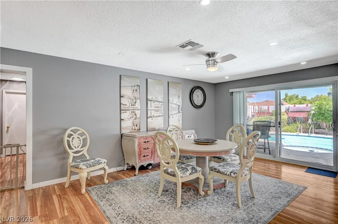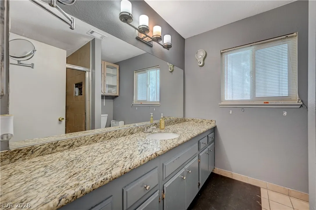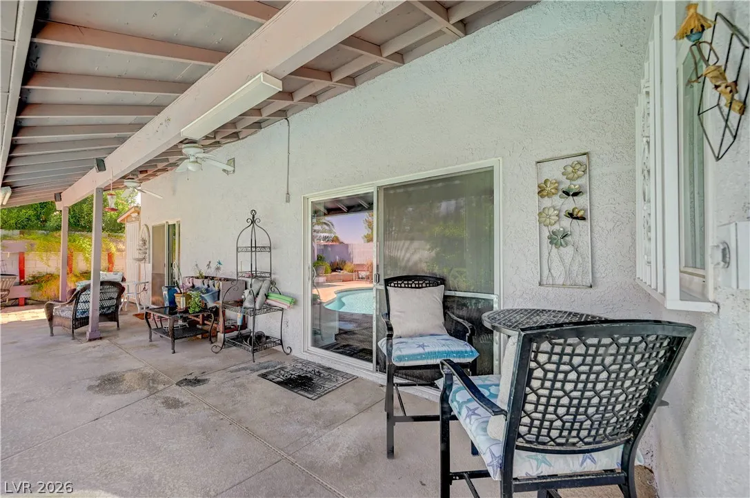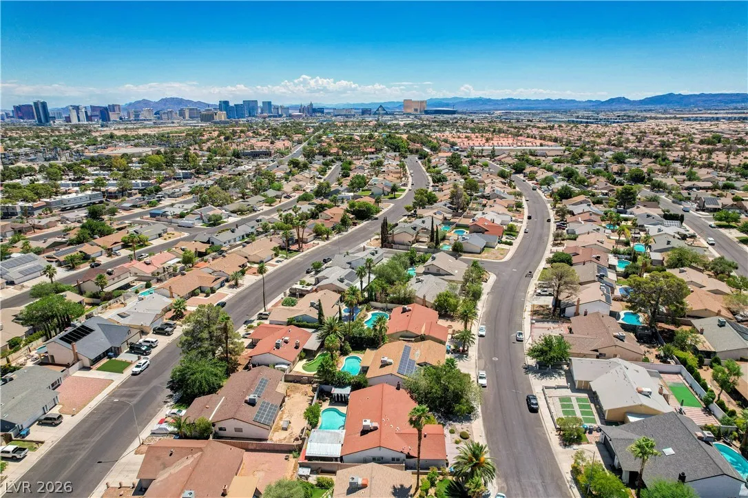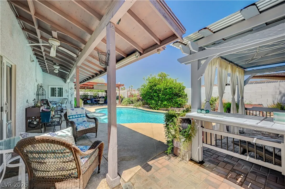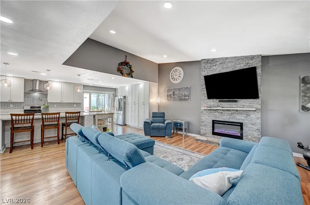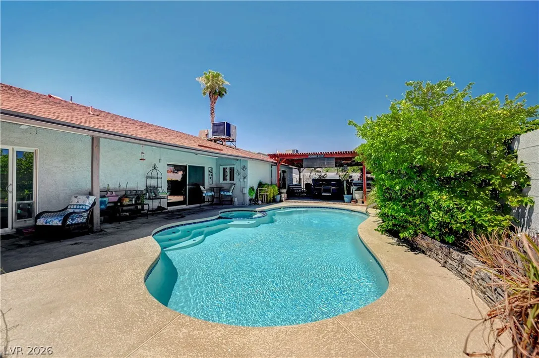 Welcome to your dream home in the heart of Las Vegas! This stunning 4-bed, 2-bath home is nestled in a charming all-single-story neighborhood with NO HOA! Step into a fully remodeled interior featuring NEW luxury vinyl flooring, upgraded carpet in the bedrooms, & elevated baseboards. The open floor plan showcases a 10′ kitchen island adorned with pendant lights, Calacatta quartz, tile back-splash, SS appliances, vent hood, & custom floor to ceiling shaker cabinets! Recessed LED lights illuminate the space, enhancing the modern feel. The spacious family room boasts vaulted ceilings & an electric fireplace with exquisite stonework. Large primary bedroom complete with a stylish shiplap wall, ceiling fan & patio door! Bathrooms have been upgraded with granite counters, designer mirrors, and custom tiled showers. Enjoy the resort-style backyard oasis featuring a pool, spa, and a custom-built covered patio and cabana, all elevated for privacy! AMAZING CURB APPEAL & TRUE PRIDE OF OWNERSHIP!