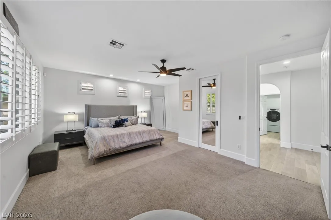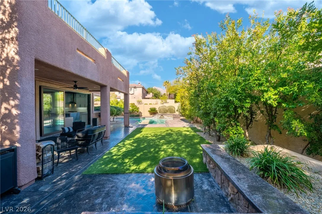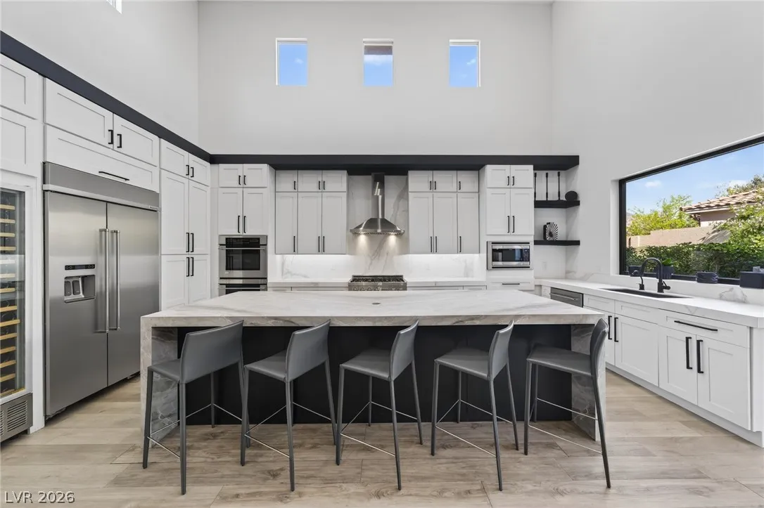 Completely remodeled home with an open floor plan and dramatic double-height ceilings in the family room and kitchen, creating a bright and spacious feel. Enjoy the convenience of single-story style living with the primary suite and private office located downstairs, while upstairs features a massive loft and three additional bedrooms, offering flexible space for family or guests. Situated on a large corner lot, the backyard is designed for entertaining with a pool and spa, plus a charming courtyard entry on the side of the home leading to the backyard. The chef’s kitchen showcases custom porcelain counter surfaces, new shaker-style custom cabinetry with upgraded storage features, and a Vinotemp wine refrigerator. Located in a gated community within walking distance to Red Rock Resort and Downtown Summerlin, with immediate access to the 215 freeway for convenience.