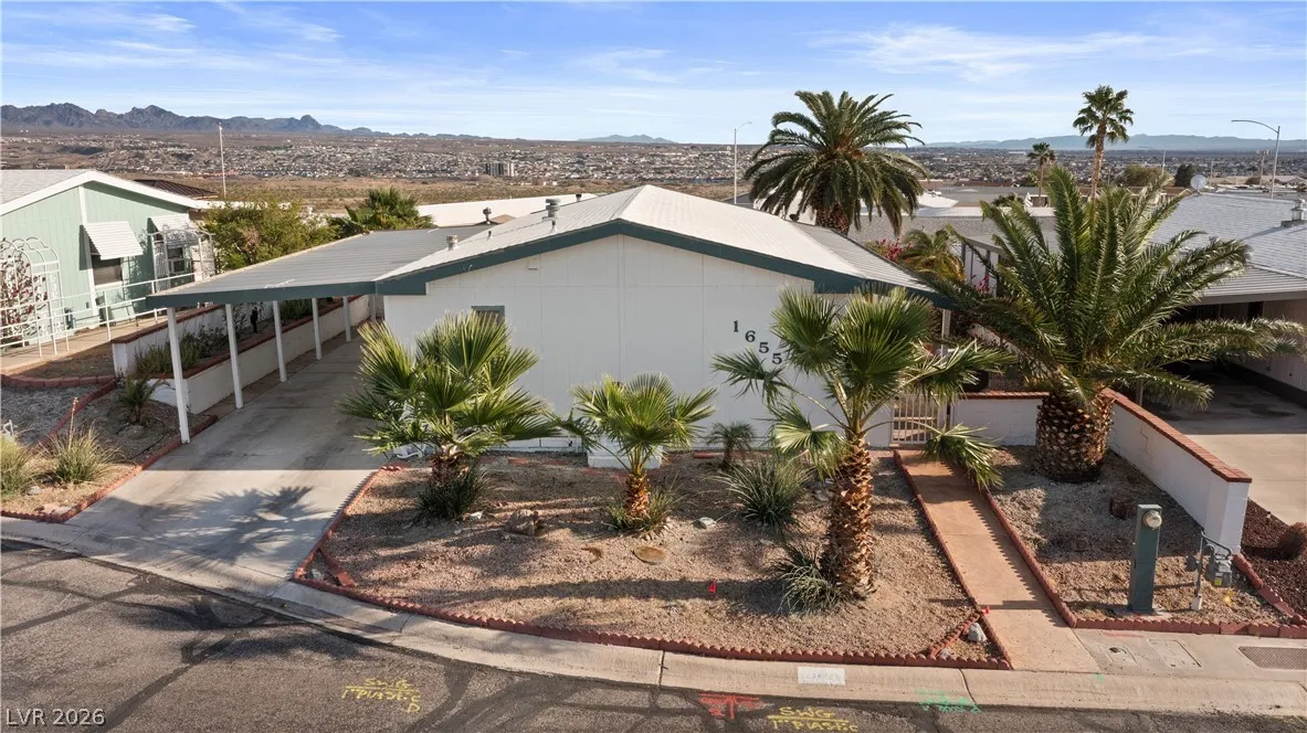 CITY LIGHTS & MOUNTAIN VIEWS FROM YOUR BACKYARD! Welcome to this Monte Del Sol home offering relaxed Laughlin living with beautiful nighttime city lights and surrounding mountain views from the private backyard patio, an inviting space for entertaining guests or unwinding under the desert sky. Inside you will find tile flooring throughout the main living areas, elegant plantation shutters that add both style and privacy, and a bright living room featuring a new ceiling fan and light fixture. The kitchen offers a breakfast bar layout with generous cabinet storage and a comfortable dining area nearby. Both bedrooms offer updated carpet for added comfort, while the primary bedroom features a walk-in cedar closet. Step outside to enjoy the wraparound paved patio, storage shed, and a covered carport for convenient parking. Located just minutes from the Colorado River, Laughlin casinos, shopping, and dining. Discover easy desert living and enjoy Nevada’s NO STATE INCOME TAX.