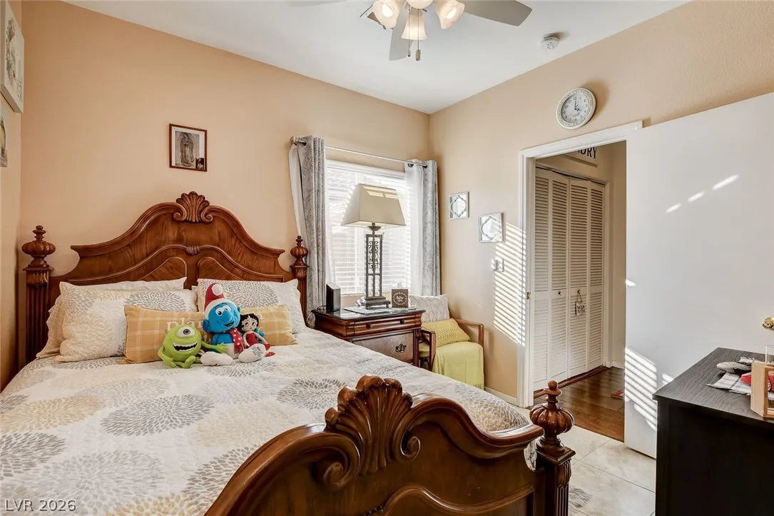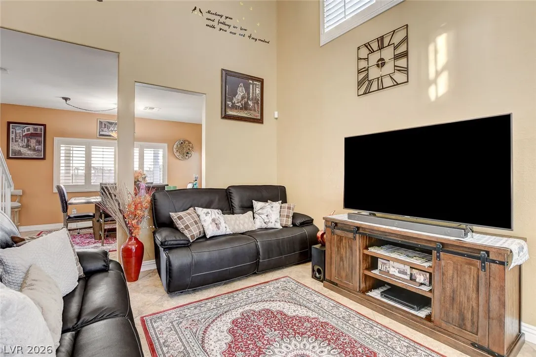 Welcome to the Stone Cliff community in northwest Las Vegas! This well maintained corner lot home offers a spacious layout with high ceilings, natural light, and mountain views! This home features tile and wood flooring throughout with no carpet! Kitchen includes granite countertops, double ovens, ample cabinetry, and generous counter space, ideal for everyday living and entertaining. Upstairs, the primary suite offers a walk in closet and a bathroom with dual sinks, granite counters, and a separate glass enclosed shower with custom tile. AC unit was installed two years ago. Step outside to a covered patio and landscaped backyard with pavers, grass, and fruit trees, including lemon, peach, and mandarin, perfect for relaxing or entertaining. Located in the gated Stone Cliff community with amenities including a pool and park, and convenient access to the 215 Beltway, shopping, dining, and nearby Summerlin.