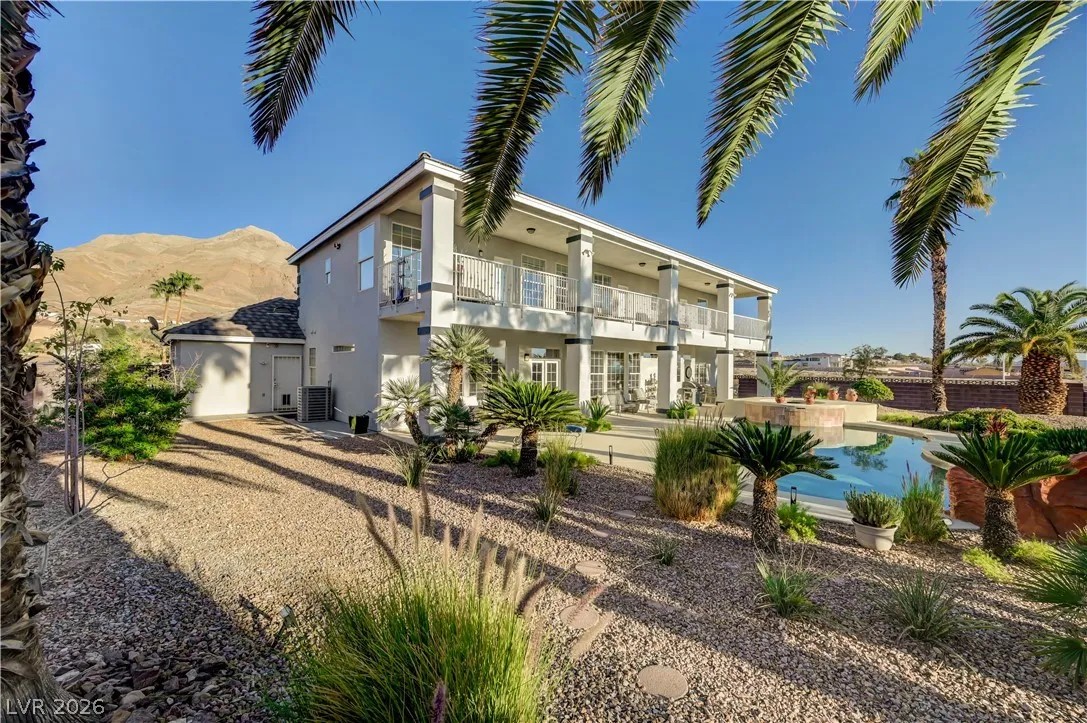 Stunning custom estate located at the base of Sunrise Mountain offering over 4,000 sq ft with 5 bedrooms and 3 baths on an expansive 20,473 sq ft lot (nearly half an acre). This beautifully maintained home shows true pride of ownership and has been kept in pristine condition. Enjoy unobstructed Las Vegas Strip, city light, sunrise and sunset views from both the private balcony and backyard. The elevated lot features lush desert landscaping in the front and backyard, resort style pool and spa, and incredible outdoor entertaining space designed to capture the panoramic views. Inside you’ll find a spacious layout with large living areas, generous bedrooms, and an upgraded kitchen ideal for everyday living or hosting guests. Opportunities like this are rare custom view homes with this lot size, condition, and location seldom come available.