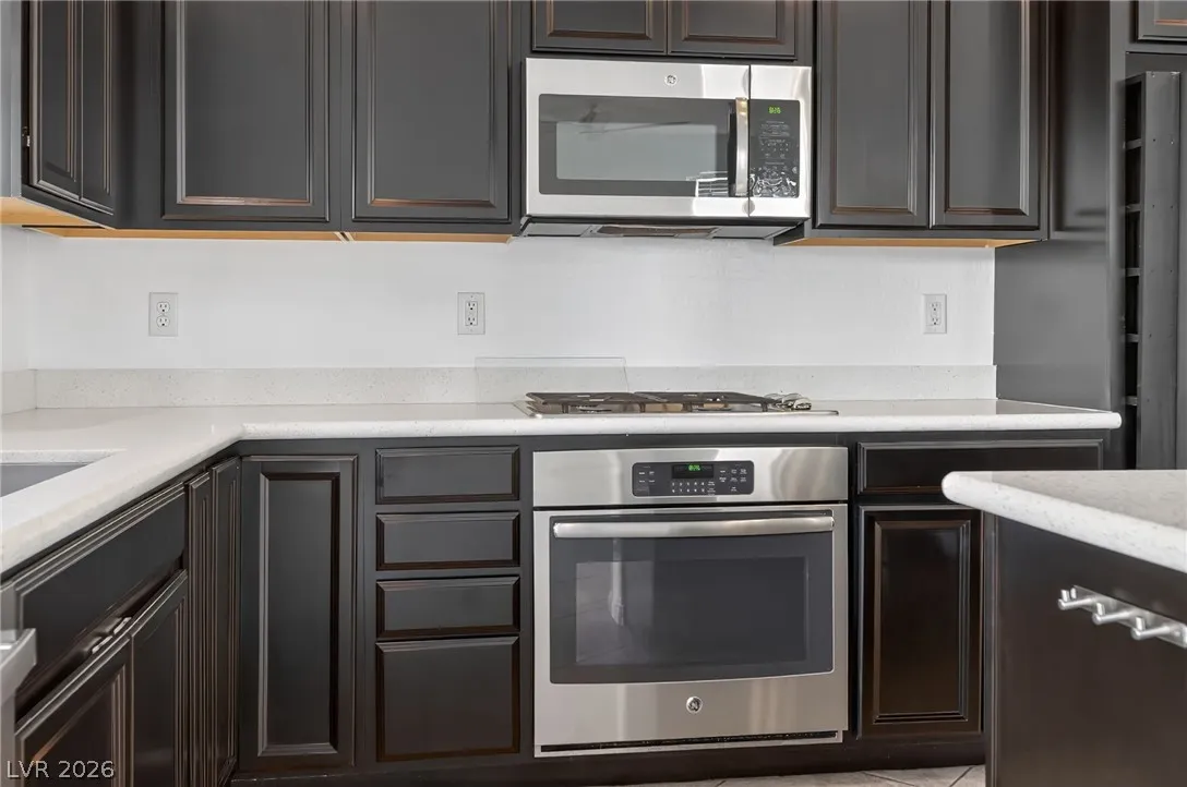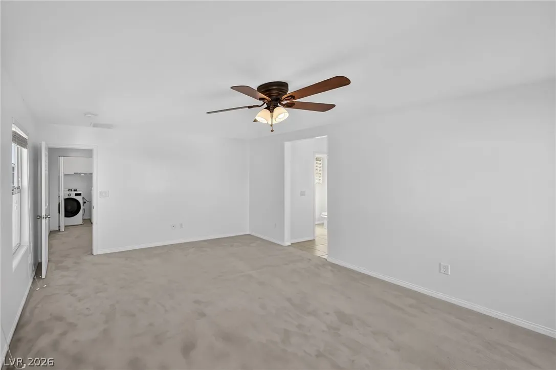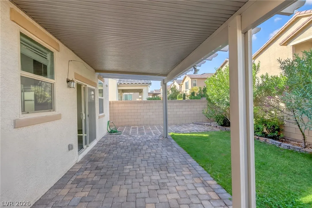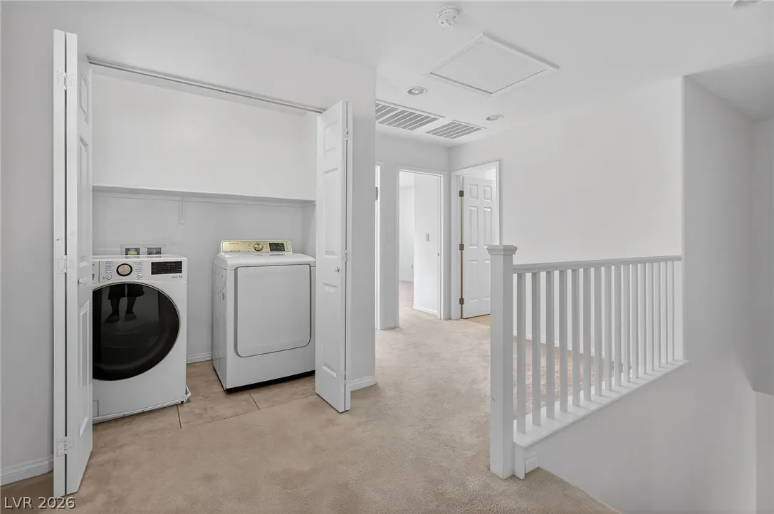 Welcome to this beautiful two-story home in Southwest Las Vegas, conveniently located near Southern Highlands. Built in 2017, this well-maintained home features 3 bedrooms, 2.5 bathrooms, and a 2-car garage, with blinds throughout. The first floor offers tile flooring and a bright living area that flows seamlessly into the kitchen. The kitchen includes recessed lighting, a center island, stainless steel appliances, and a pantry, perfect for everyday living and entertaining. A sliding glass door leads to a private backyard with pavers, a covered patio, grass, and desert landscaping, creating a relaxing outdoor space. Upstairs you’ll find all bedrooms with carpet and tile in the bathrooms. The spacious primary suite features a ceiling fan, dual sinks, walk-in closet, and shower. Secondary bedrooms are separate from the primary, plus a convenient upstairs laundry area with washer, dryer, and shelving. Great home in a desirable location—come see it today. Schedule your tour soon!