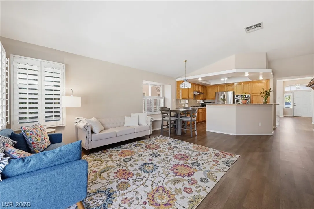Welcome to 9416 Grenville Avenue, situated in beautiful North Summerlin, just a short drive to dining, hiking, biking trails, and the TPC Golf Course! This charming 3 bed, 2 bath, single-story home boasts a spacious living room as well as a family room w a fireplace. Enjoy cooking in your gourmet kitchen w granite countertops, stainless steel appliances, and a large pantry. The backyard is a beautifully landscaped private oasis, w a sparkling pool, a spa and no neighbors behind you! The garage is a spacious, 2 car garage, with custom storage cabinets on both sides. All of the rooms have ceiling fans, and energy efficient windows, providing comfort throughout.