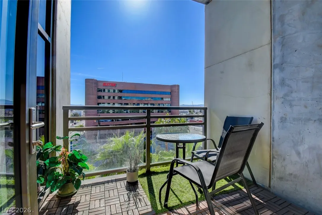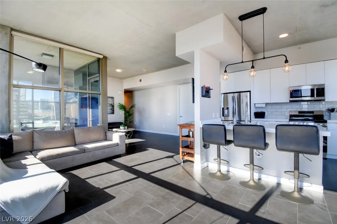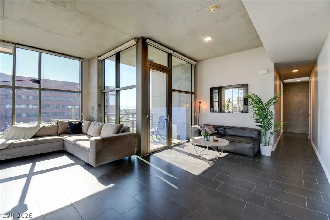 Modern loft-style corner unit in the highly sought-after Juhl community in Downtown Las Vegas. This 2-bedroom, 2-bath residence features 10′ floor-to-ceiling wraparound windows offering abundant natural light and city views. The open-concept kitchen flows into the spacious great room, ideal for entertaining. Upgrades include porcelain tile flooring throughout, stainless steel GE appliances, a contemporary backsplash, a custom wine rack, and a large island with quartz countertops and an undermount sink. Residents enjoy resort-style amenities including concierge service, a two-story fitness center overlooking the pool and Las Vegas Strip, resort pool with outdoor kitchen and grills, cabanas, a fireplace, a spa, lush landscaping, and an outdoor movie theater.
