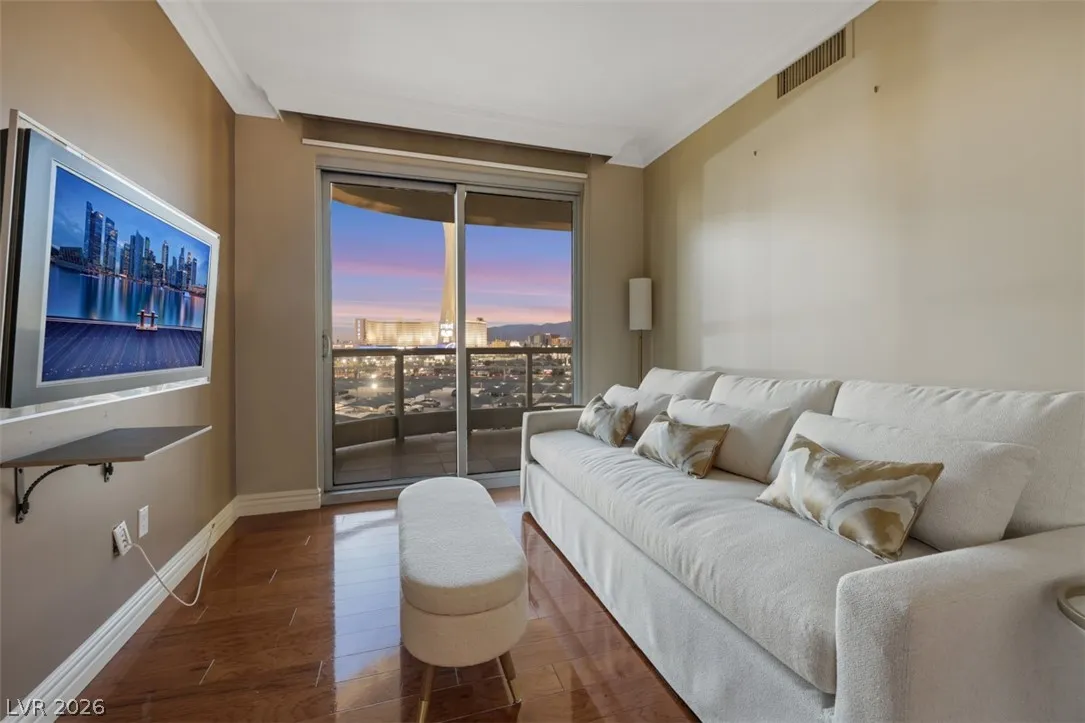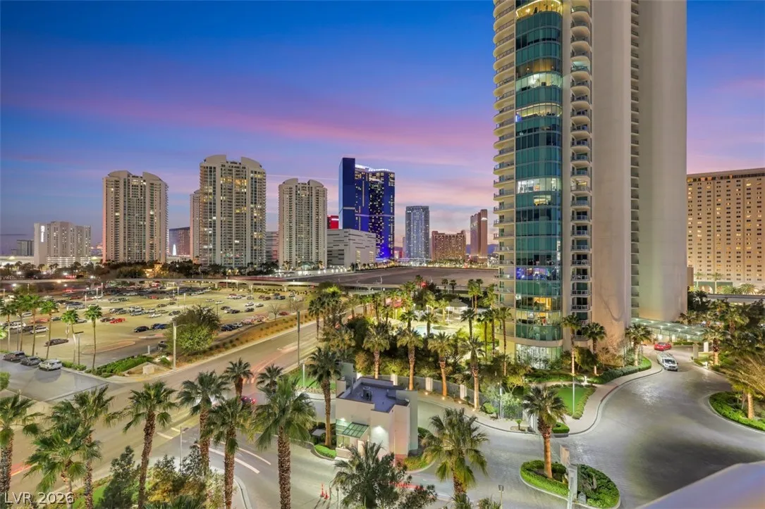 Stunning corner residence with dramatic curved floor-to-ceiling windows showcasing panoramic views of the Las Vegas Strip corridor, the STRAT, and city skyline. Overlooking lush palm-lined grounds, the residence captures a rare blend of tropical resort ambiance and iconic city lights. Rich wood flooring flows through the living areas, complemented by authentic Italian cabinetry, premium GE Monogram and Profile appliances, and elegantly finished marble bathrooms. The open living and dining spaces are perfectly positioned along the glass to capture breathtaking sunsets and sparkling evening views. Turnberry Towers offers guard-gated luxury living with two resort-style pool & spas, fitness center, tennis/pickleball, putting green, and spacious private terraces off every bedroom. Turnberry East is nearing completion of beautiful renovations to the lobby and social room, along with the addition of a brand-new outdoor kitchen and entertaining space unlike any other high-rise in Las Vegas.