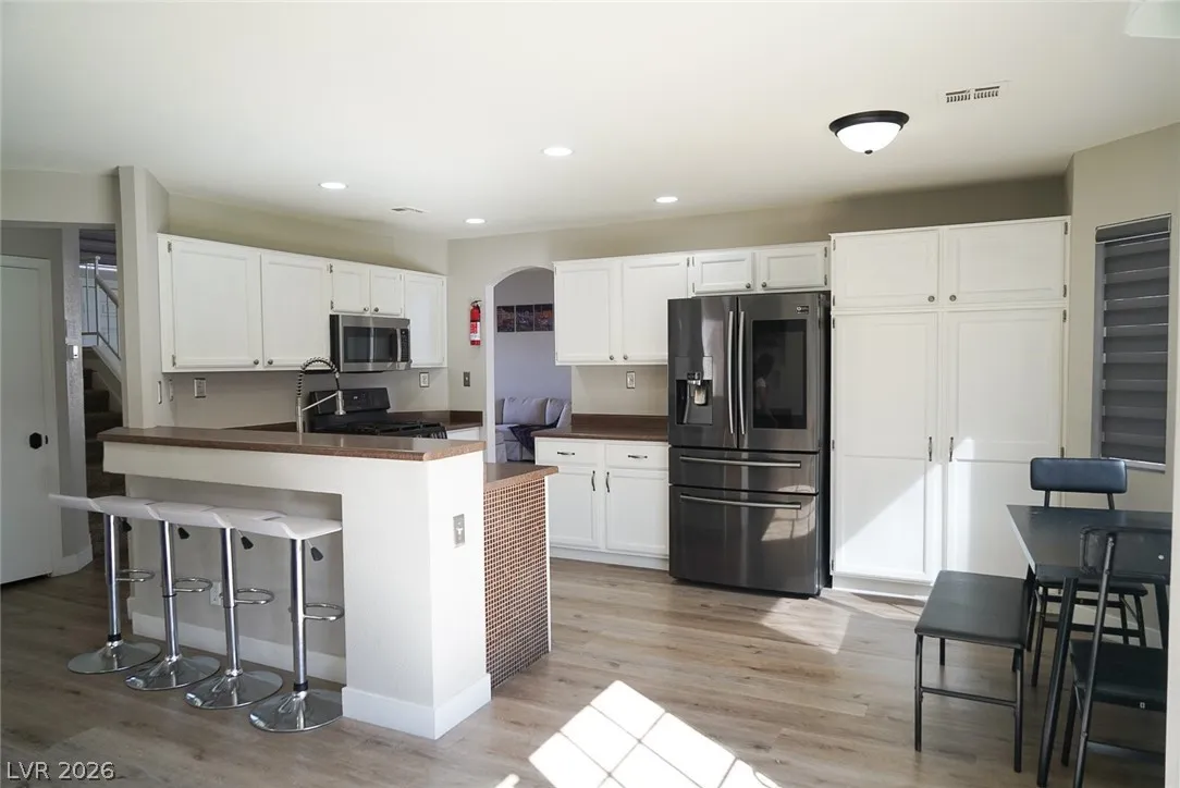 Enjoy your own private backyard oasis with a sparkling pool and low-maintenance turf, perfect for relaxing or entertaining. This beautiful two-story home features LVP flooring throughout the first floor and carpet upstairs where all bedrooms are located. The kitchen offers white cabinetry, laminate countertops, and stainless steel appliances, creating a clean and functional space for everyday living. The spacious primary suite includes a beautifully tiled shower and mirrored closet, while the secondary bathroom features a convenient tub and shower combination. Interior has been recently painted, giving the home a fresh, move-in ready feel. Located in North Las Vegas with convenient access to major roads, shopping, dining, parks, and everyday services. Buyer may keep all furniture at no additional cost.