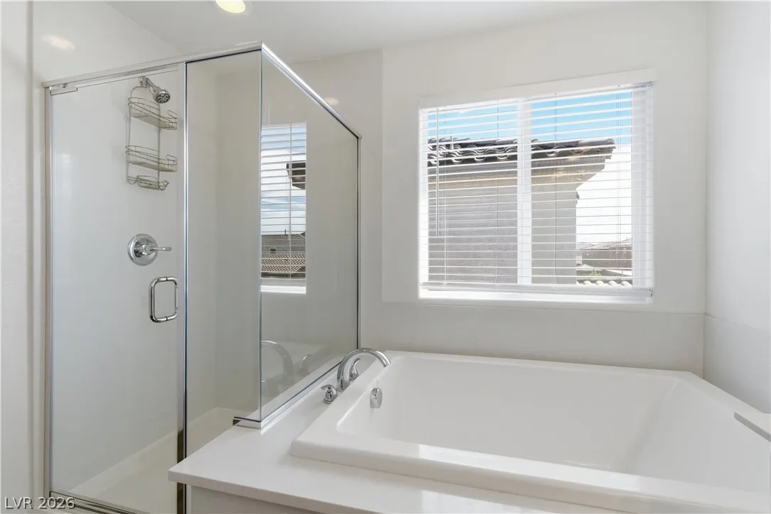The deluxe primary bathroom provides a spa-like retreat with upgraded finishes and thoughtful design. Additional upgrades include enhanced insulation, solar conduit, soft water loop, and a BBQ gas stub for outdoor entertaining. Conveniently located near parks, shopping, dining, and Santa Fe Hotel & Casino.