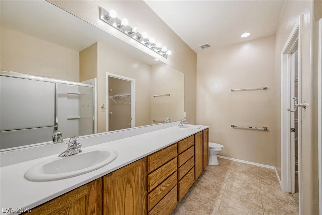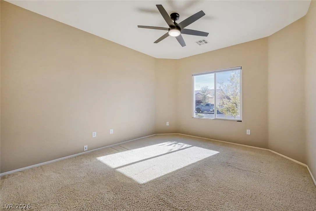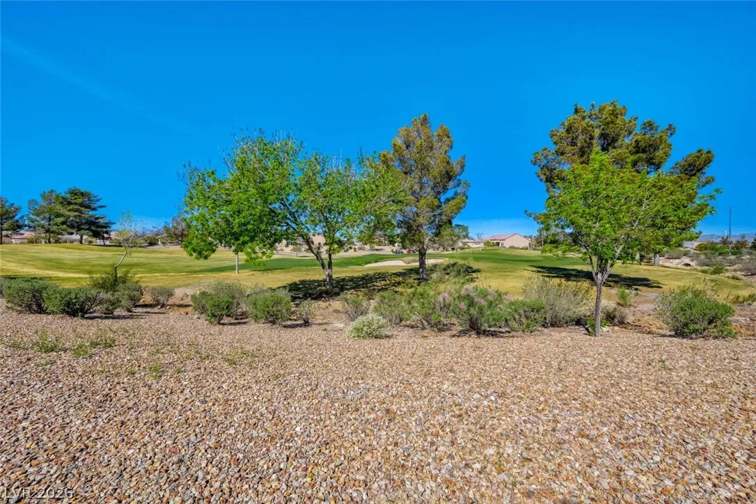 Are you looking for a move-in-ready home? Enjoy breathtaking views of the 5th green, fairway, and Mt. Charleston from your own backyard in this beautiful Cedar model, offering 1,718 SF, fresh exterior paint, and a well-designed open floor plan. Tile flooring runs throughout the main living areas, with carpet in all three bedrooms. The spacious layout includes a separate dining area, perfect for entertaining. The kitchen features white-on-white appliances, tile flooring, and a separate nook. The primary suite offers a double sink vanity and a walk-in closet. Step outside to your extended covered patio and take in the scenery from your easy-maintenance yard. Experience resort-style living in Sun City Aliante, with an indoor pool and spa, fitness center, tennis, basketball, and pickleball courts. Close to Aliante Casino, shopping, VA Hospital, and Freeway.