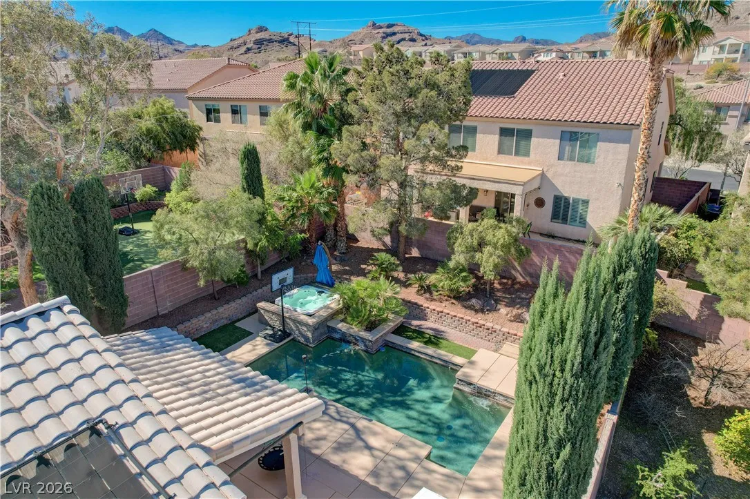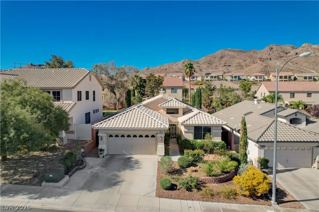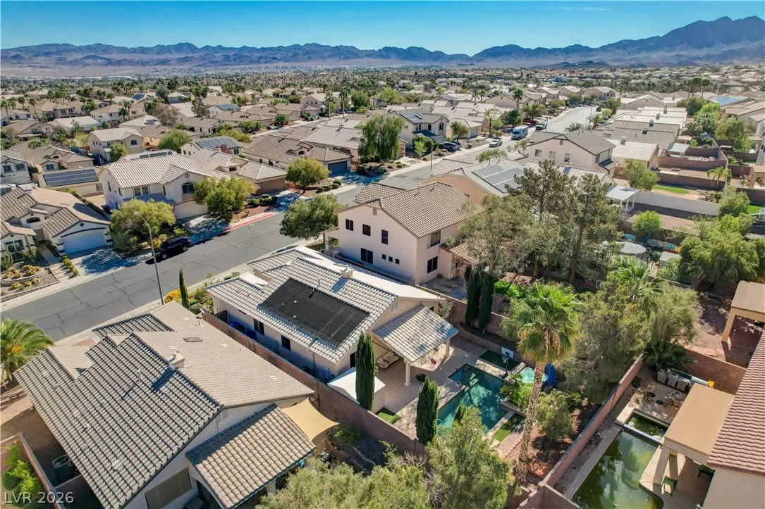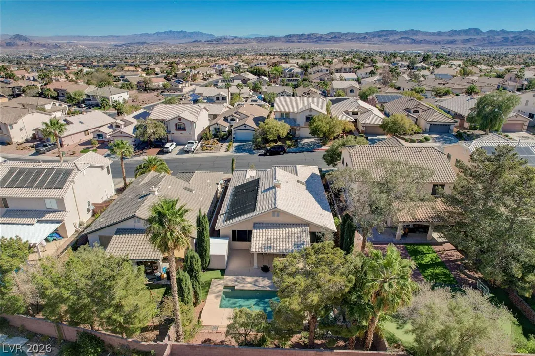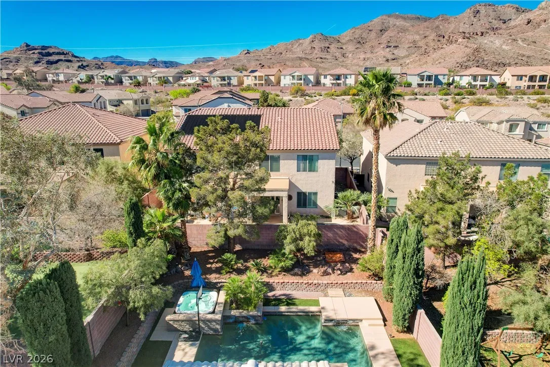 * MOUNTAIN VIEWS & A STUNNING POOL* Nestled in the guard-gated community of Palm Hills, this stunning single-story home offers the perfect blend of comfort, design, & lifestyle. This beautifully designed residence offers an effortless open layout filled w/ natural light, high ceilings, & warm, inviting spaces perfect for gathering w/ family & friends. The kitchen is the heart of the home, seamlessly connected to the living area & complete w/ granite countertops, stainless steel appliances, center island, breakfast bar, & wine fridge! The primary suite offers a spa-like bathroom w/ dual vanities, soaking tub, separate shower, & a generous walk-in closet. Step outside into a resort-style escape featuring a sparkling saltwater pool, elevated spa, tranquil water features, & a covered patio perfect for outdoor fun. Set against breathtaking mountain views, this home is truly special. Located near hiking, biking, & endless outdoor recreation, immerse yourself in the best of Henderson Living!