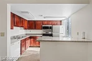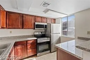 Welcome to Bella Vita, a guard-gated resort-style community with 24 hr. security. This 2-bedroom, 2-bathroom bottom-floor unit condo is conveniently located in a community featuring six pools, three clubhouses, five tennis courts, three gyms, saunas, cabanas, and more. It’s also located minutes away from Chinatown and the Las Vegas Strip. This home features attractive ceramic wood-look tile flooring, and the kitchen is equipped with a breakfast bar, stainless steel appliances, and granite countertops.