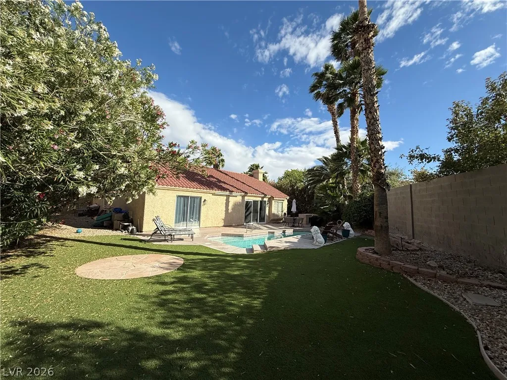 Single story home in The Lakes with sparkling pool and updated kitchen featuring granite counters and stainless-steel appliances. Third bedroom is being used as a den/office and can easily be transformed back. Spacious backyard with pool and built-in BBQ is ideal for entertaining.