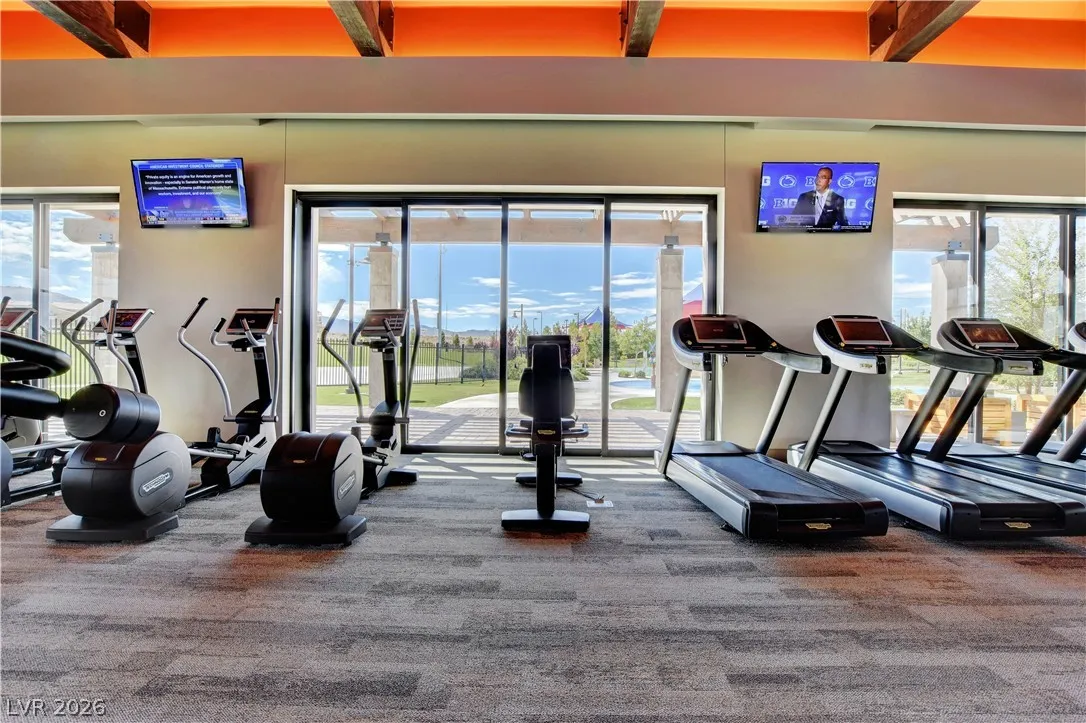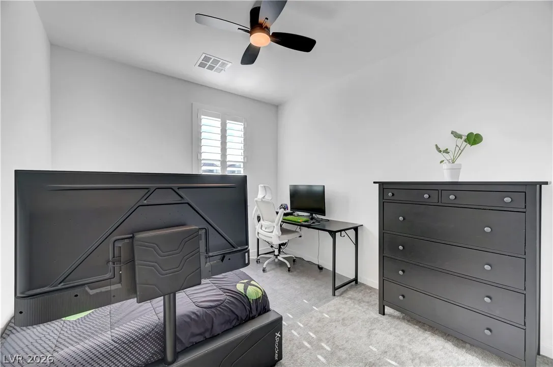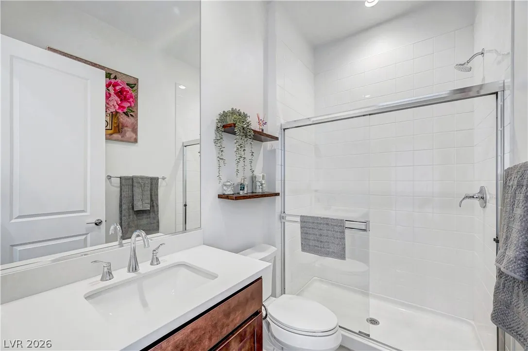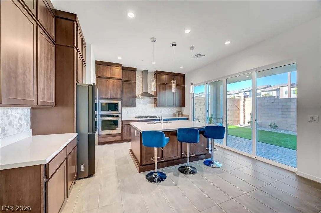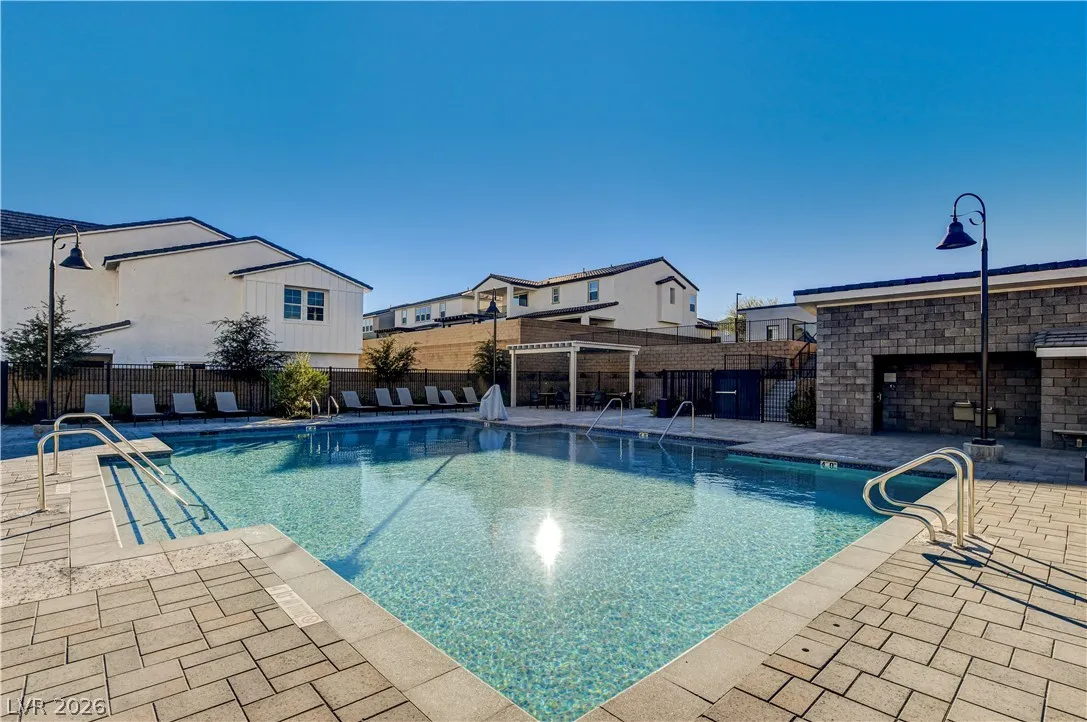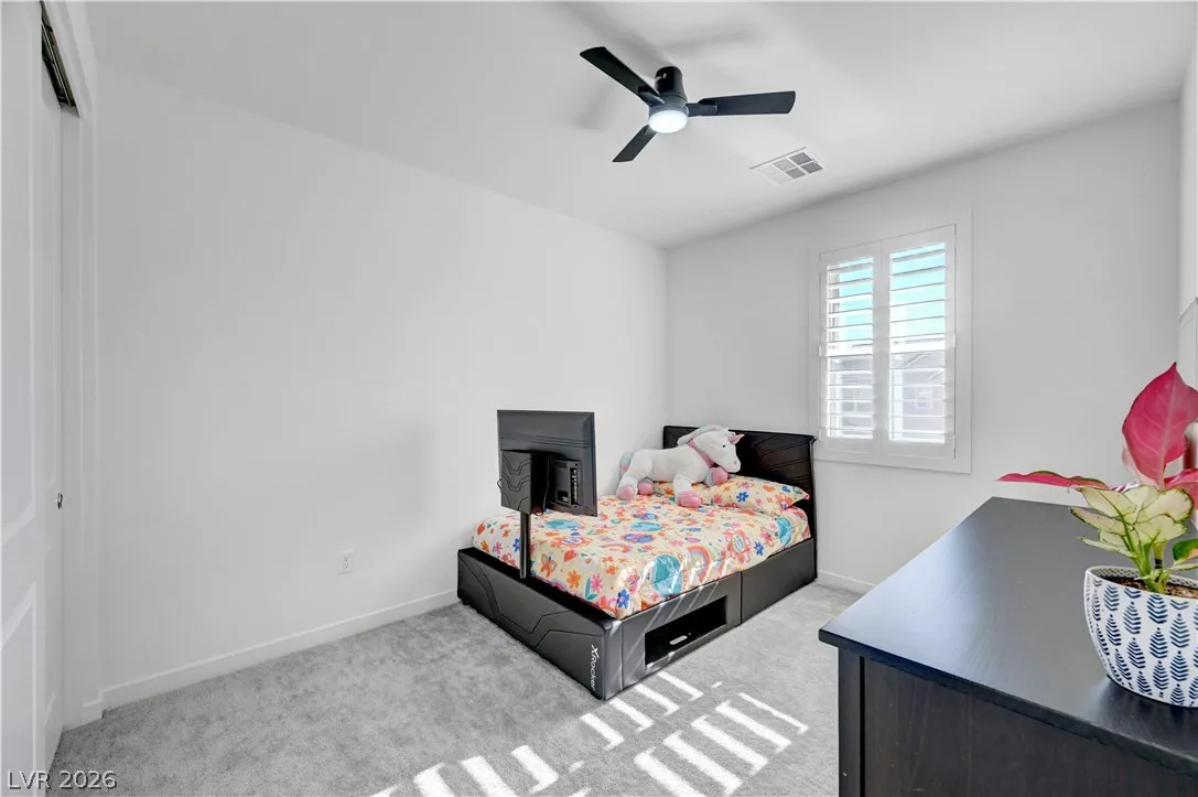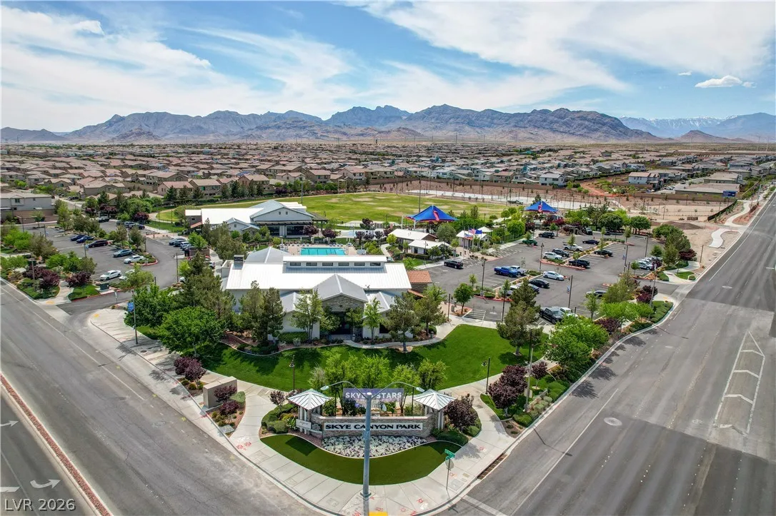 Welcome to this upgraded 4-bedroom, 3-bath home in the desirable Skye Canyon community. Featuring 10-foot ceilings, 8-foot doors, and a bright open layout, the home feels airy and inviting throughout. The chef’s kitchen includes stainless steel appliances, ceiling-height cabinetry, and a large quartz island ideal for cooking and entertaining. The living area showcases a floor-to-ceiling fireplace, while sliding doors open to a landscaped backyard with covered patio and no rear neighbors—perfect for private indoor-outdoor living. Additional features include a loft, den/office, plantation shutters, modern lighting, and craftsman stair railing. The primary suite offers a tiled walk-in shower, dual sinks, and a walk-in closet. Extras include a water softener and EV charger outlet. Community amenities include gated access, pools, parks, trails, courts, gym, dog park, and more.