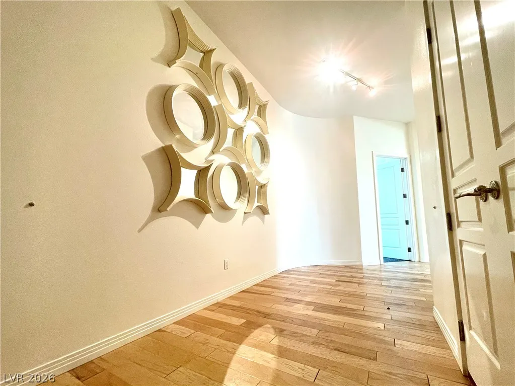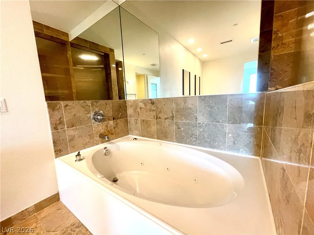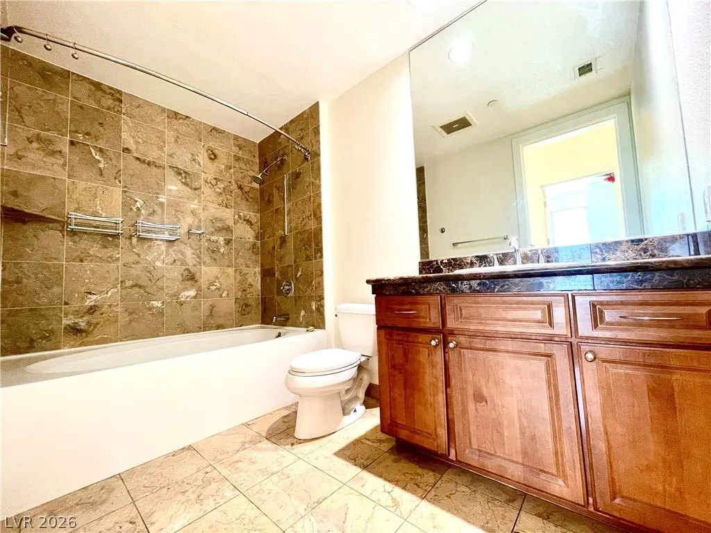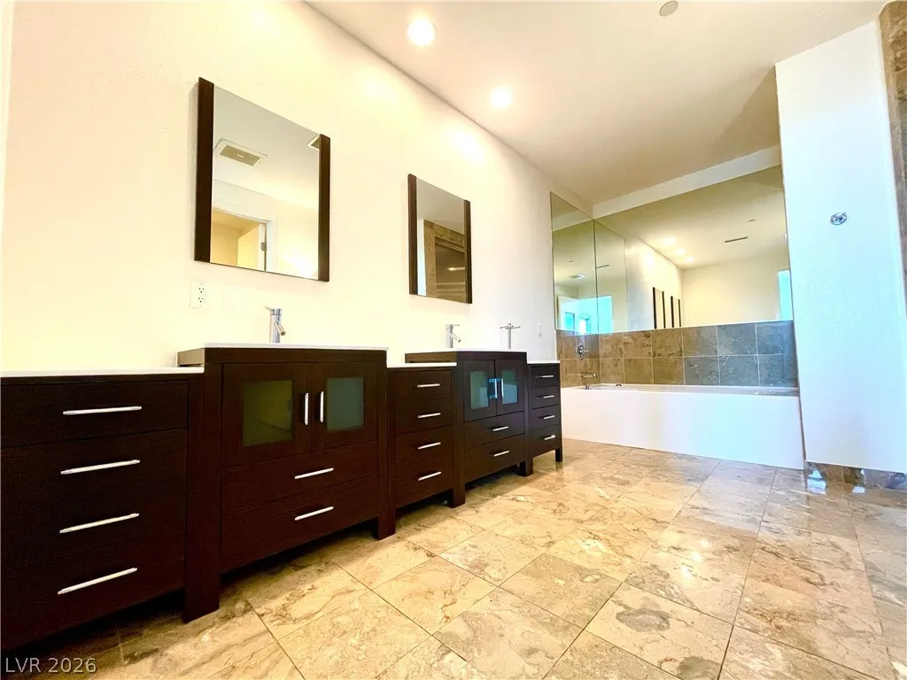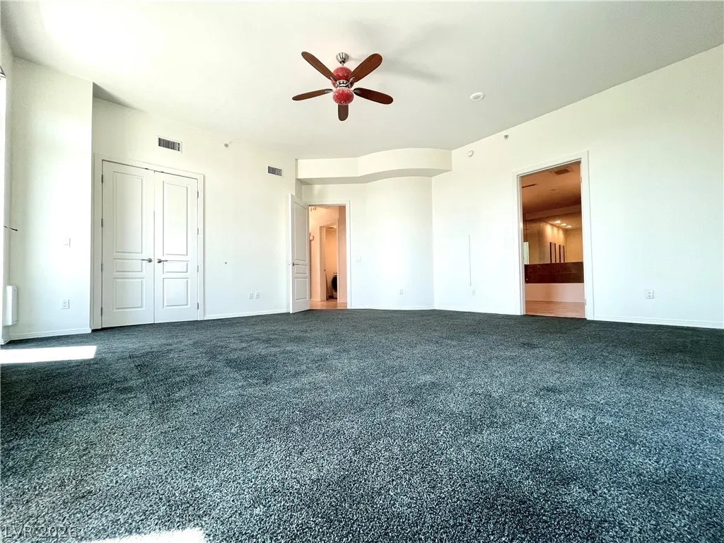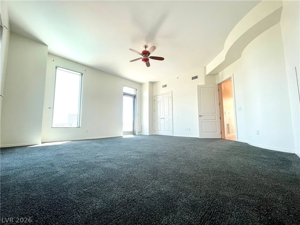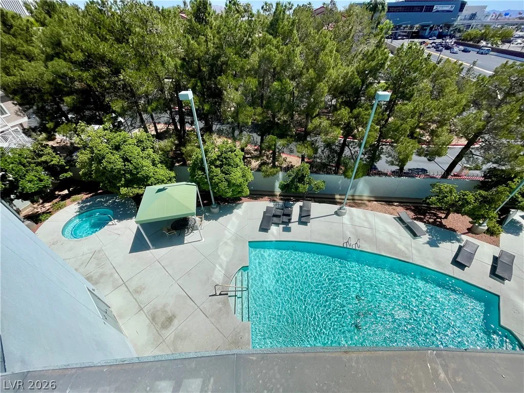 The primary suite offers dual access to two private terraces—one with north and east-facing valley views, and the main terrace showcasing sweeping southern views of the Strip and the Sphere. The south-facing terrace also overlooks the community pool and BBQ area, perfect for year-round enjoyment.
