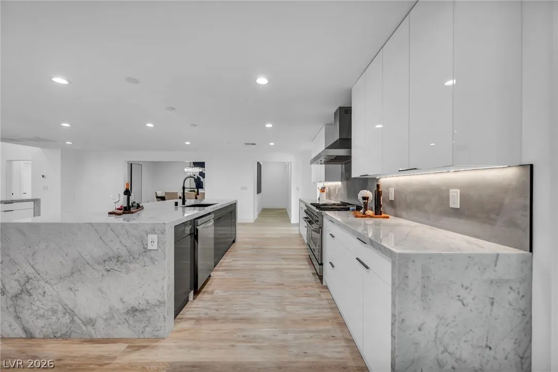 MOVE IN INCENTIVES AVAILABLE!! Meticulously renovated single-story contemporary estate boasts premium finishes & distinct details. The 8,761-square-foot home features 6 bedrooms, a state-of-the-art theater, a game room, an office, & a gym. The resort-styled exterior is an entertainer’s dream, with a covered patio, oversized pool, spa, putting green, & basketball court. The rare one-acre gated compound features RV parking & garage space for 15 cars. The sophisticated interior features clean lines, vaulted ceilings & wood plank vinyl flooring. The spacious floor plan flows easily from the living, dining & kitchen. Its two-tone gourmet kitchen displays a timeless aesthetic with dual quartz waterfall islands, rich espresso and white cabinetry, stainless steel appliances, & a walk-in pantry. An expansive private primary features a separate sitting area, access to an exterior pool deck & a luxurious bath with floating vanities, a walk-in shower with stone surround, & a soaking tub. No HOA.