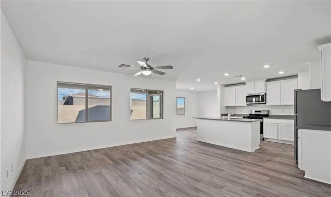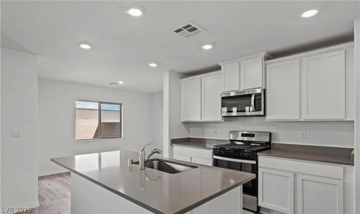Beautiful home in North Las Vegas! This two-story, three-bedroom, two-and-a-half bath home is filled with charm and thoughtful upgrades. The open-concept layout seamlessly connects the kitchen, dining, and family room—perfect for both everyday living and entertaining. Upstairs, a versatile tech loft offers the ideal space for a home office, playroom, or additional lounge area. The spacious primary suite provides a private retreat with a full bathroom and a large walk-in closet. Upgrades include quartz countertops, energy-efficient kitchen appliances, and luxury vinyl plank flooring throughout. Don’t miss this move-in-ready home!