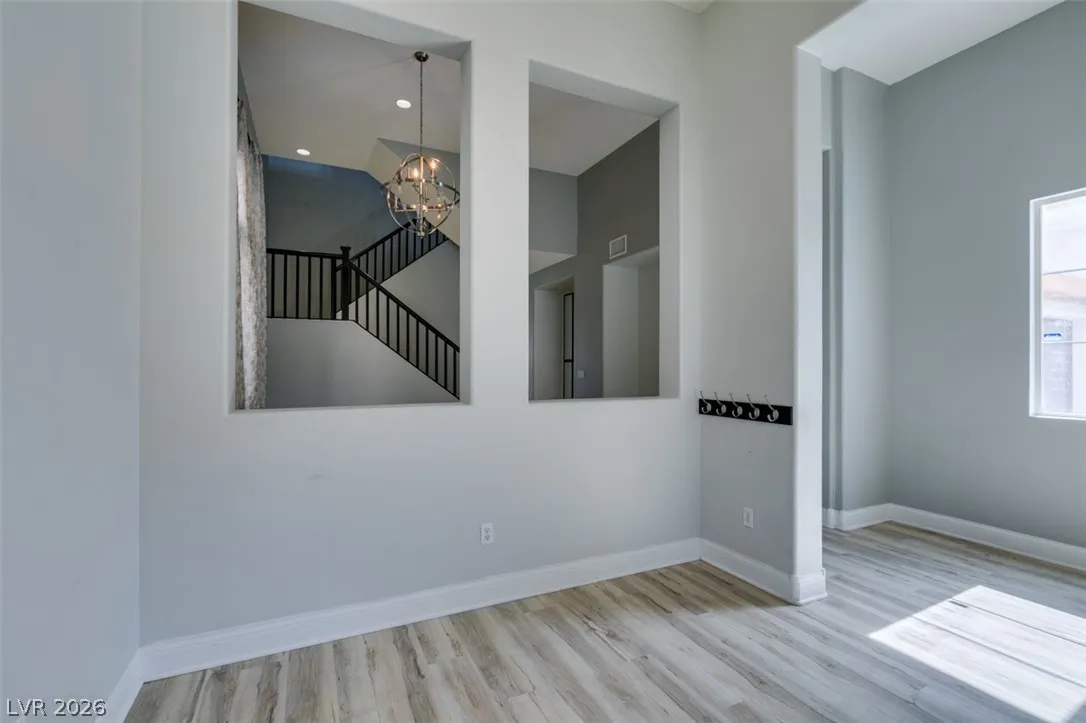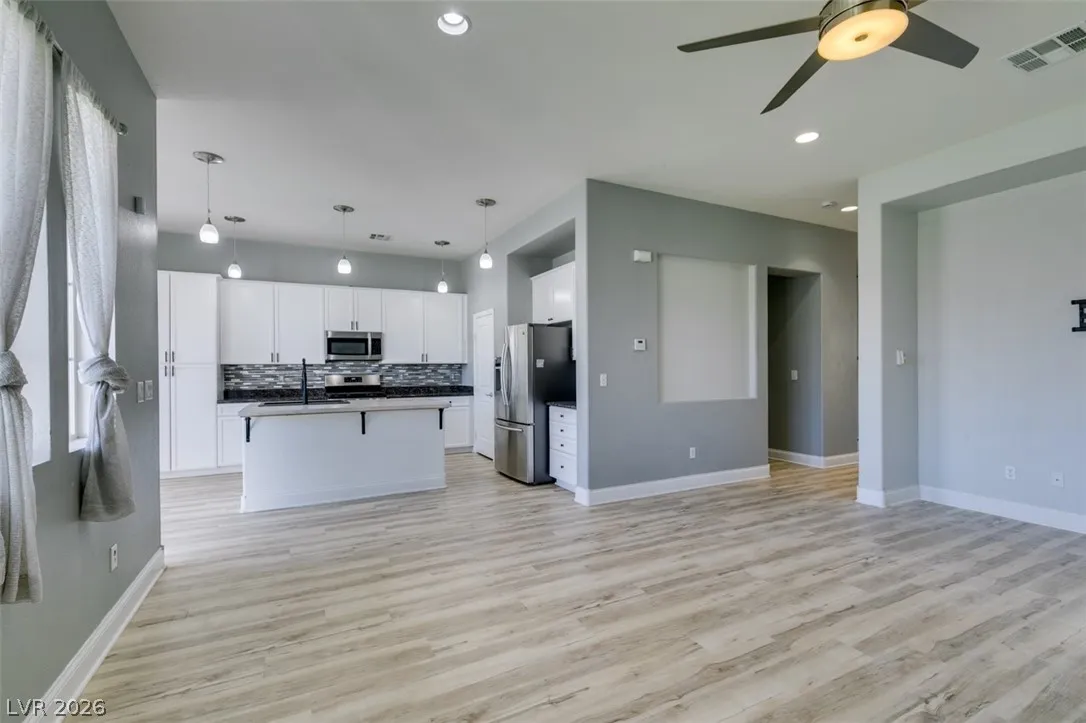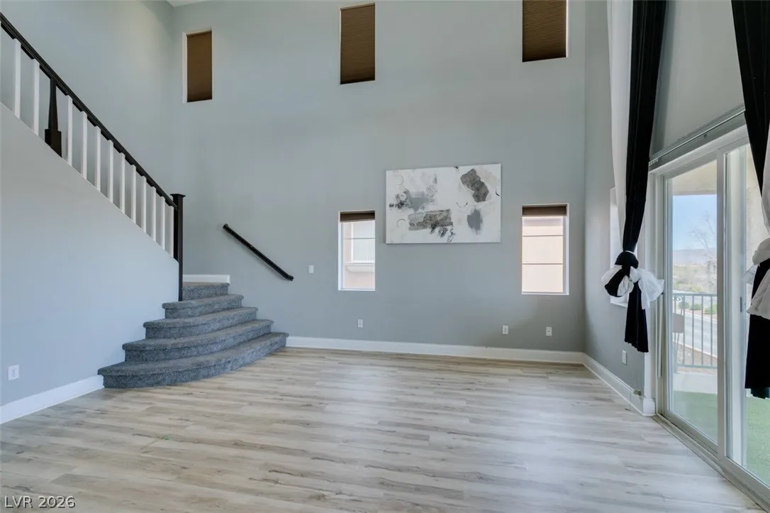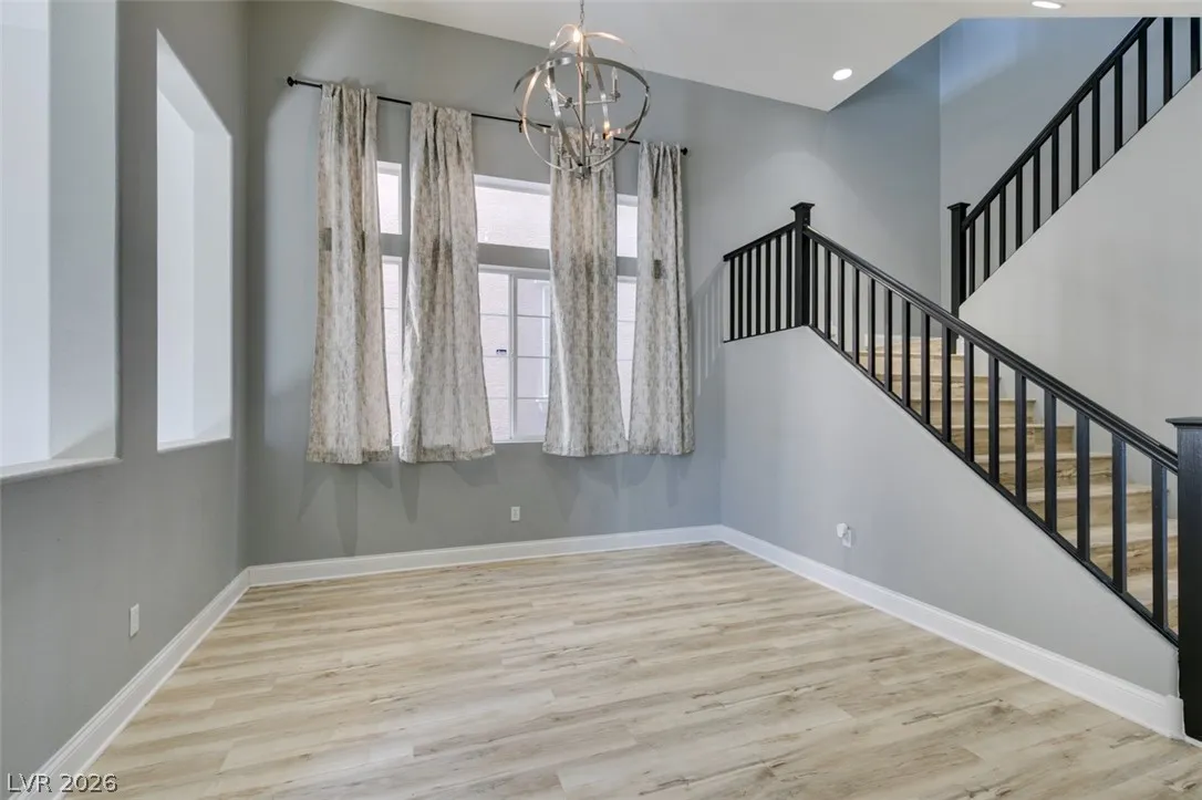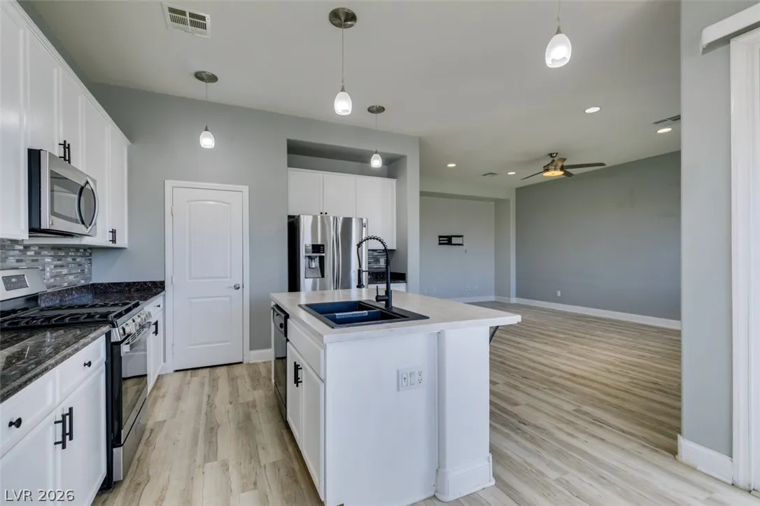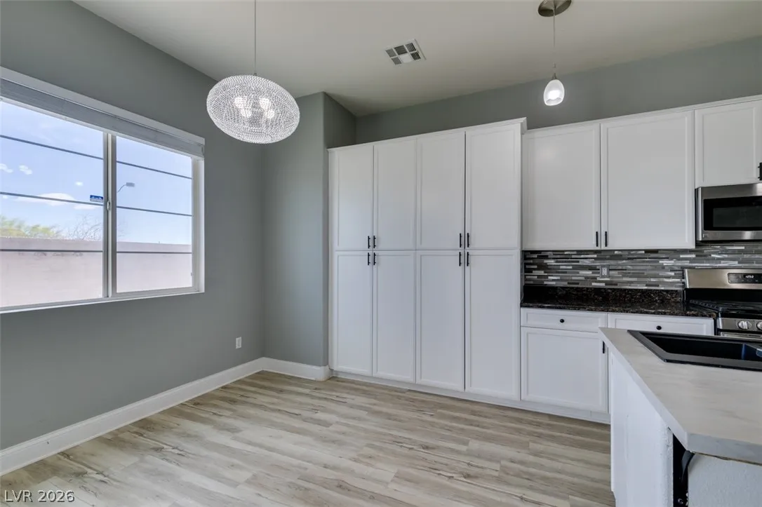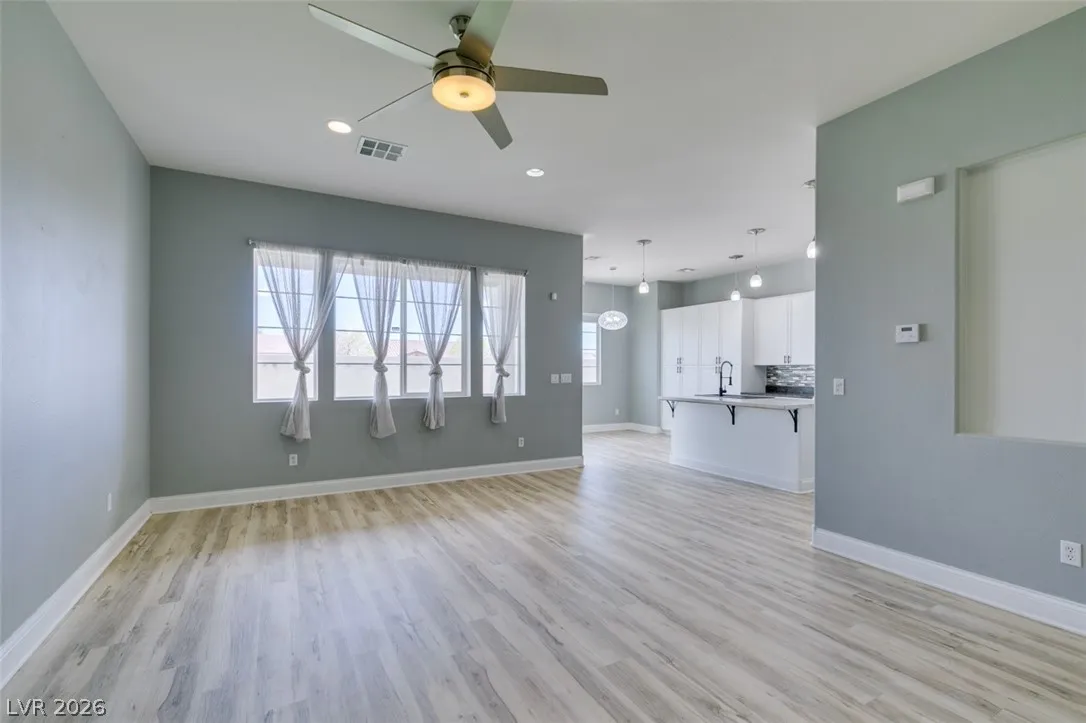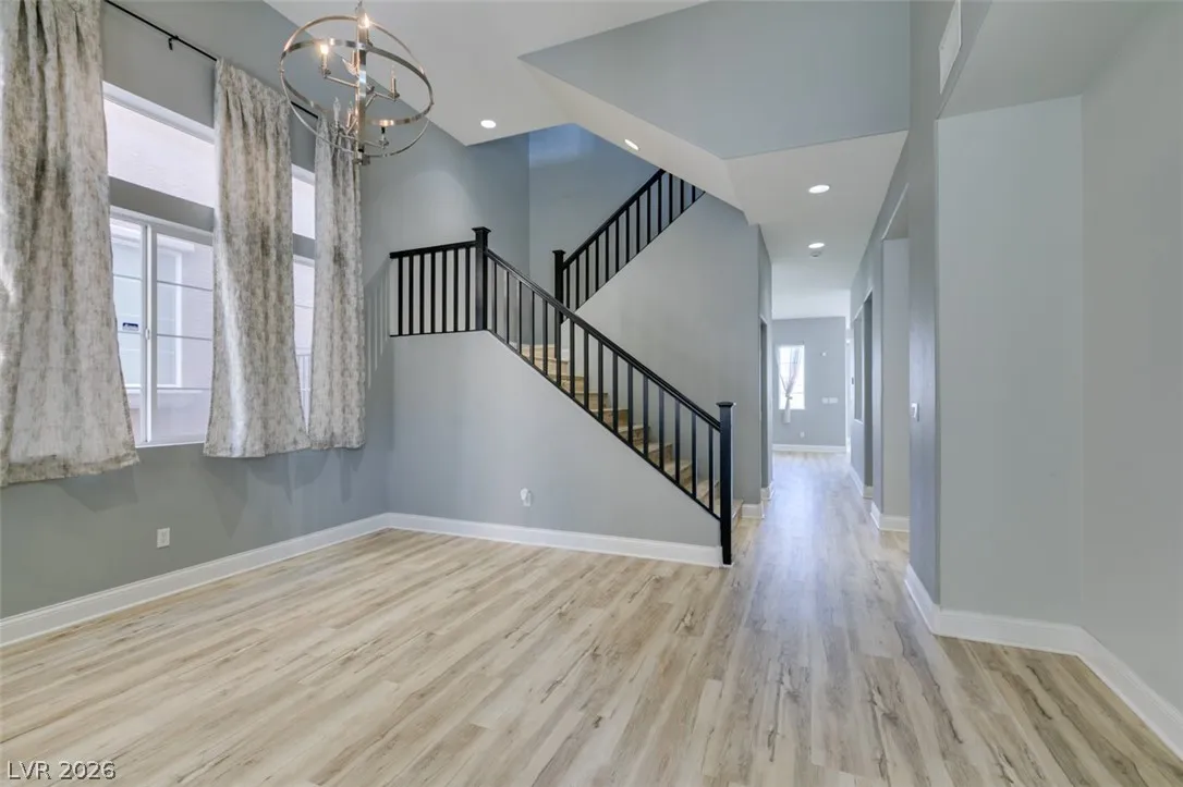 Step into this stunning 4-bedroom, 3-bath home featuring a unique open layout and modern designer touches. The main level welcomes you with luxury vinyl flooring, a versatile den perfect for a home office, and a bright formal living room with vaulted ceilings. The spacious family room flows seamlessly into a clean, white kitchen with granite countertops, tile backsplash, stainless steel appliances, and an eating nook ideal for dining. Upstairs, the two-story primary suite boasts a balcony, walk-in closet, and spa-like bath with dual vanities, soaking tub, and separate shower. Three additional bedrooms and an upstairs loft with city and mountain views provide flexible space for relaxing or working from home. This home perfectly blends style, comfort, and functionality.