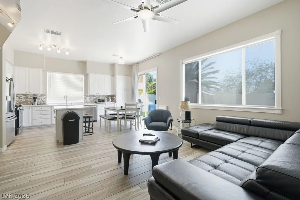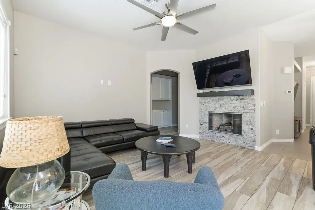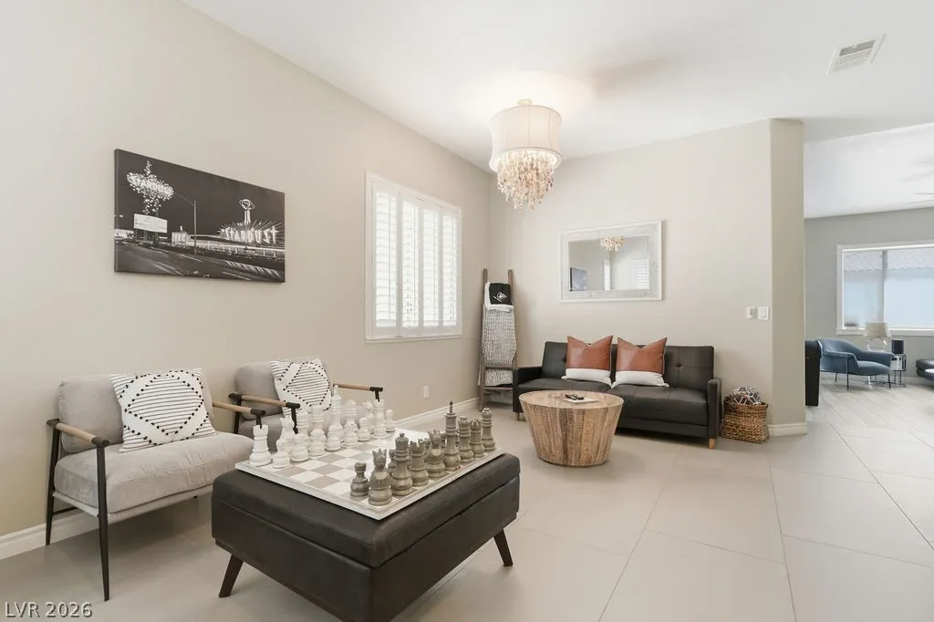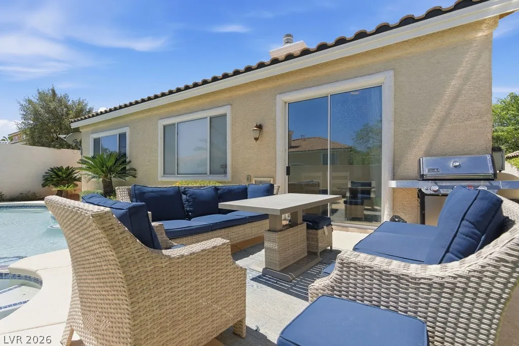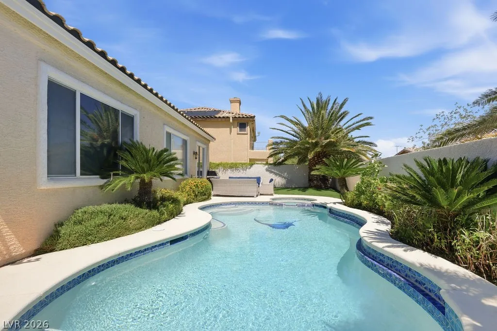 Fully furnished single-story home in Summerlin featuring an open floor plan with 3 bedrooms, 2 bathrooms, a 2-car garage, and a private pool. The spacious living area flows seamlessly into the dining space and fully equipped kitchen with stainless steel appliances and quartz countertops. The primary suite includes a walk-in closet and en-suite bath. — truly move-in ready. The backyard offers a sparkling private pool and covered patio, perfect for enjoying the Las Vegas lifestyle. Minutes from Downtown Summerlin, Red Rock Canyon, and the 215 Beltway.