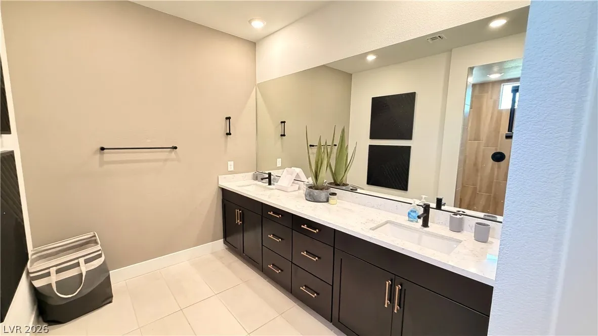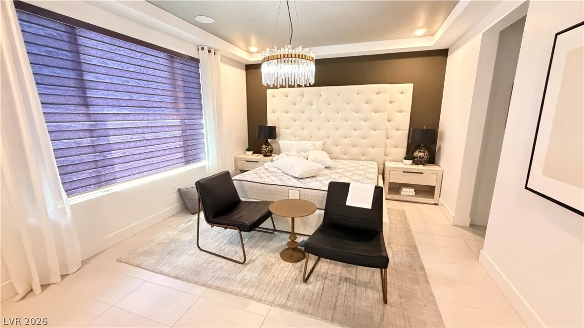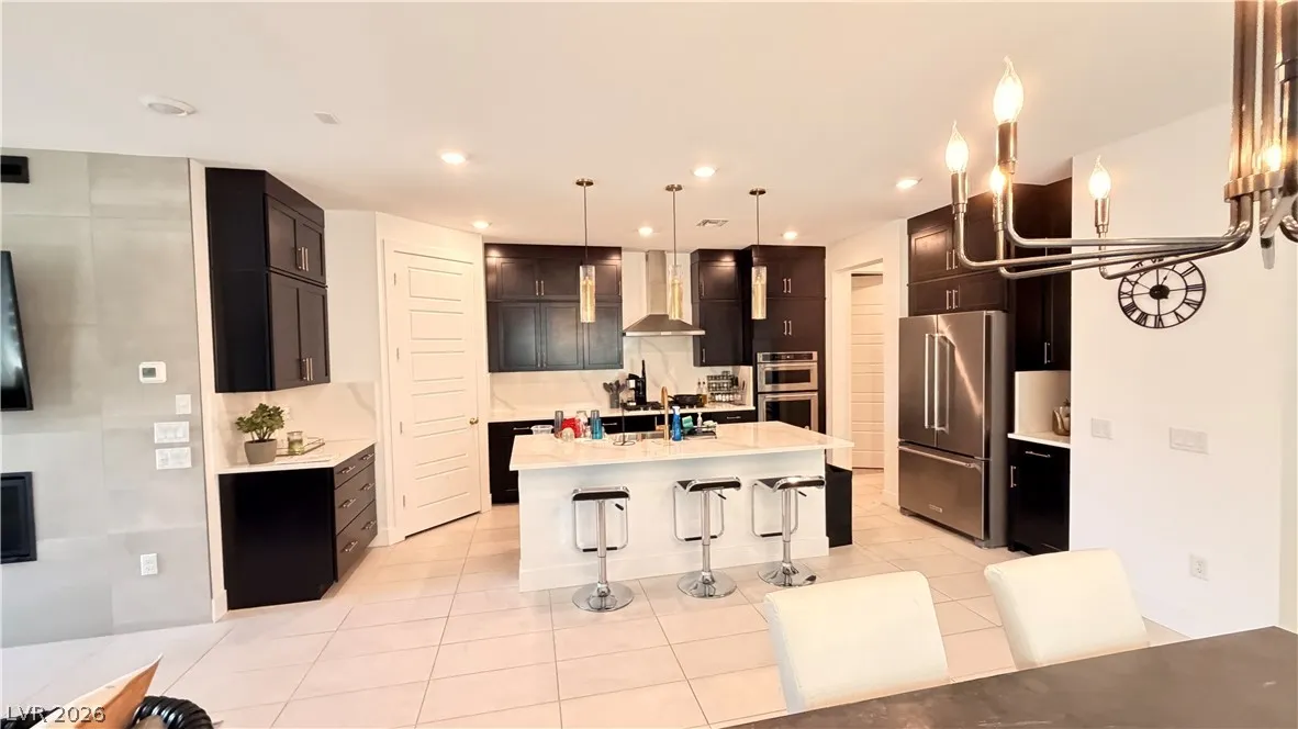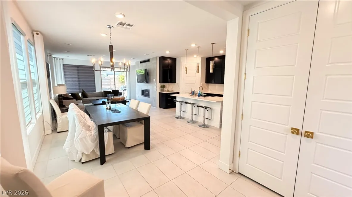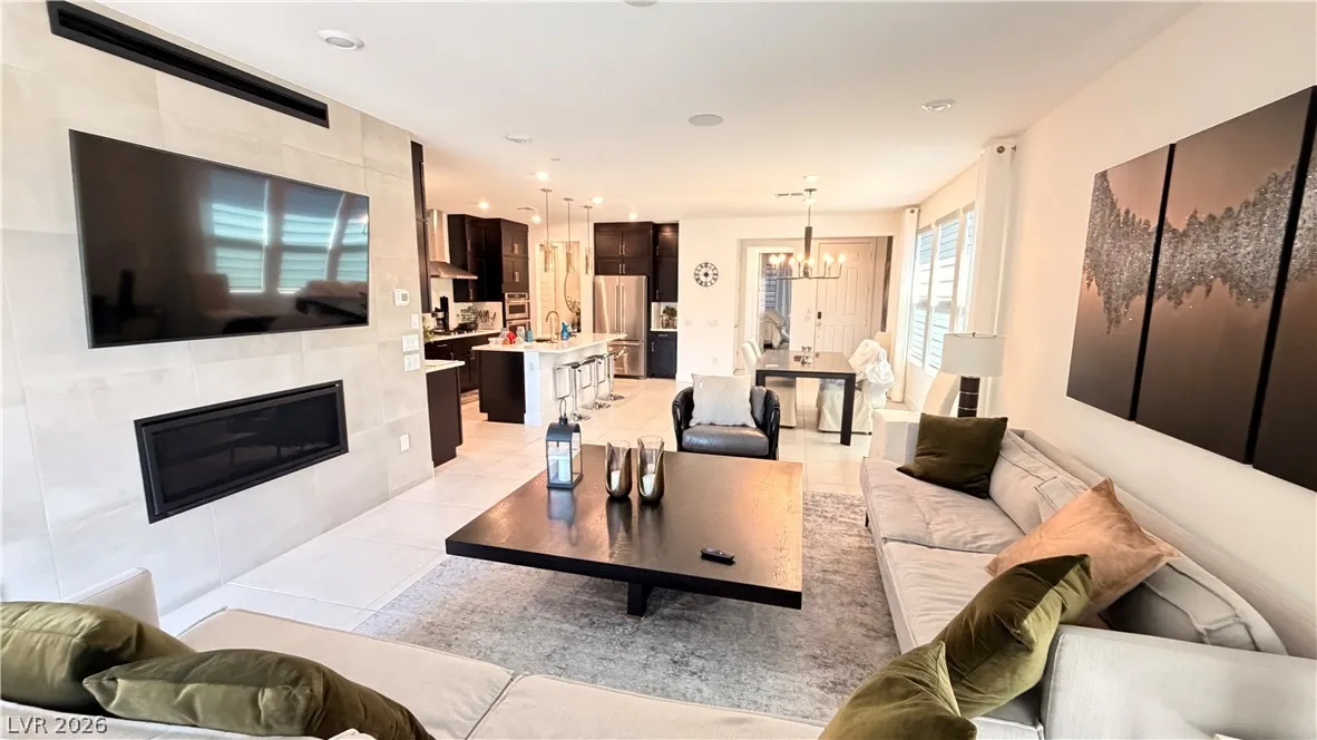 The chef-inspired kitchen is a standout, complete with a large island and breakfast bar, quartz countertops, custom cabinetry, stainless steel appliances, and an oversized pantry—perfect for effortless entertaining. Upgraded tile flooring runs throughout the main living areas for a polished, low-maintenance lifestyle.