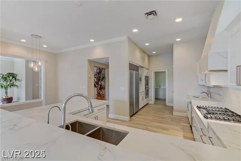 Beautiful home located on the 7th fairway of CGCC w/stunning water & mountain views! Features include gourmet kitchen with Sub Zero fridge, veggie sink, double ovens & trash compactor. Primary BR with master retreat & fireplace features a wet bar, balcony & dual bathrooms with 2 walk-in closets. Secondary bedrooms are all ensuite. First floor den with double door entry as well as a private entrance & 3/4 bath w/ steam shower. Serene backyard features, pool & spa, built-in BBQ & covered patio. All pool equipment & landscape lights can be controlled from your smart phone. Additional features include crown molding, surround sound, 2 fireplaces, formal living & dining room, water softener, Rolladen shutters & garage storage.