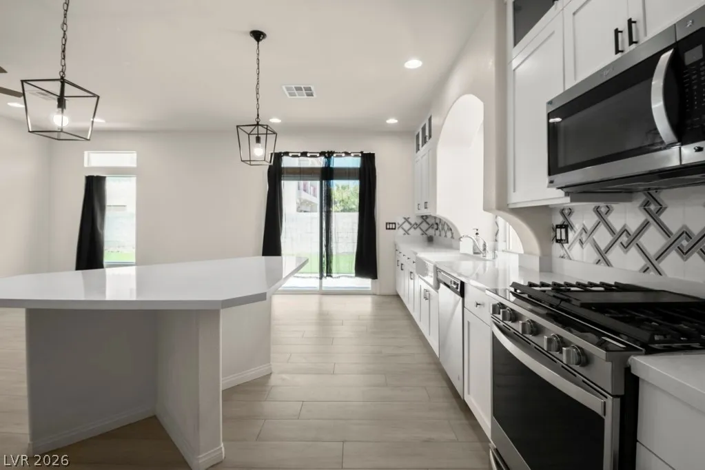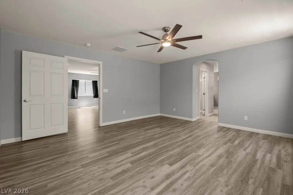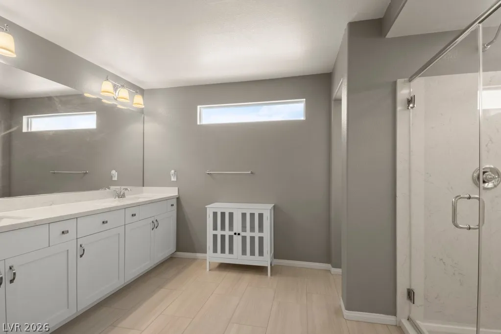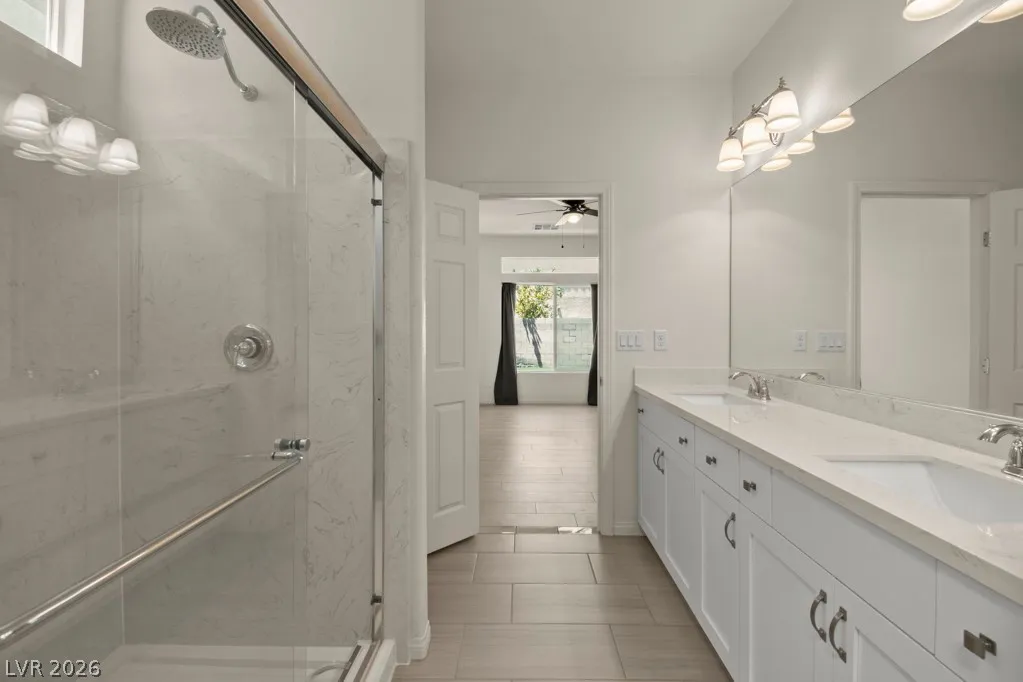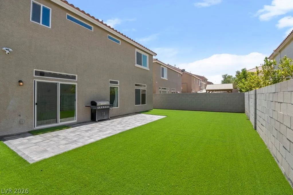 This hard-to-find floor plan includes two primary suites—one on the upper level and one on the lower level—making it perfect for versatile living. The home boasts three bedrooms, three full baths, and a large loft. Featuring stainless steel appliances and a spacious layout with tile flooring throughout the first floor, it exudes modern comfort. Enjoy the covered patio in the backyard with a low-maintenance yard. Conveniently located just 20 minutes from the Strip and only 5 minutes from Costco, restaurants, and a market, this home is not to be missed!