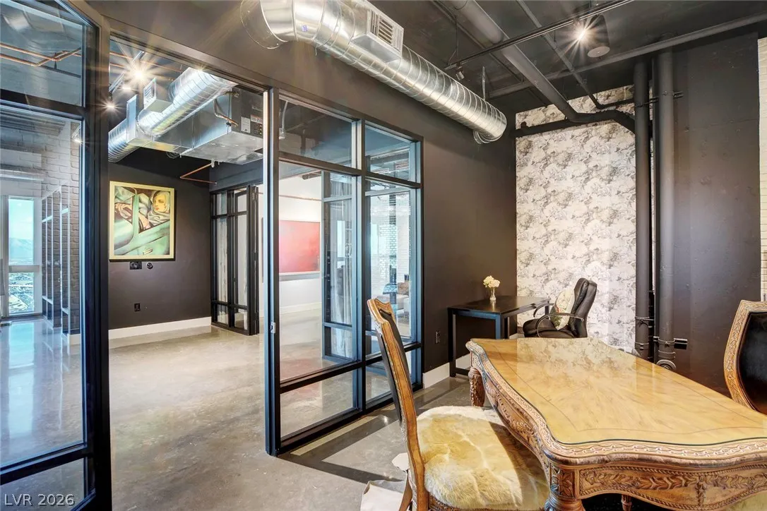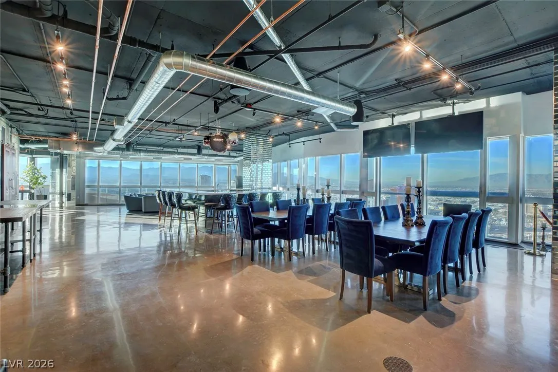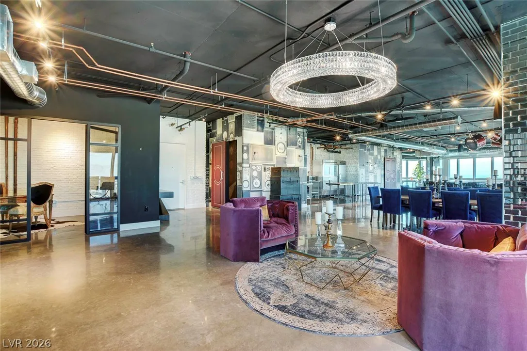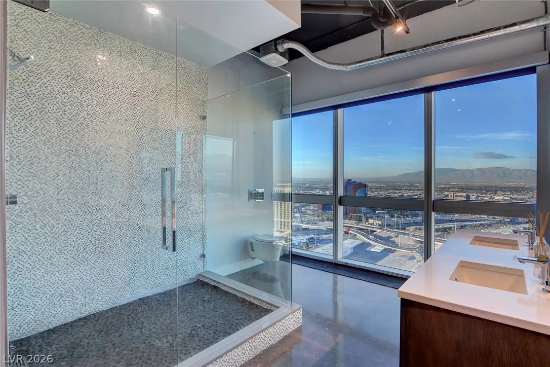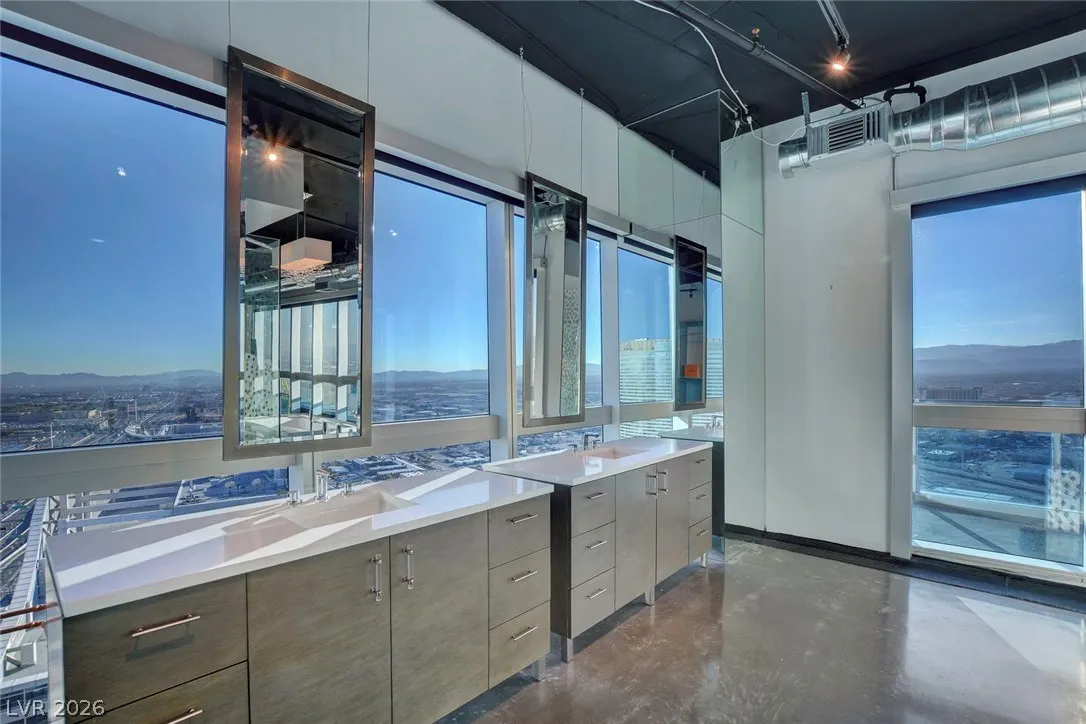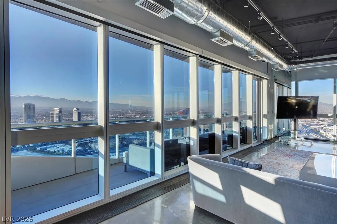 Rare opportunity!! Best-value penthouse in Las Vegas, priced below comparable sales. This one-of-a-kind, custom-designed urban loft delivers true “rock star” style with sweeping panoramic views of the Strip and Allegiant Stadium. Spanning nearly 5,000 sq ft on a single level, the residence features an exceptional open-concept layout, dramatic floor-to-ceiling windows, and sleek polished concrete flooring throughout. Two expansive primary suites plus two large office spaces offer flexibility for luxury living and work-from-home ease. Expertly curated by a world-renowned designer. Ideally located just steps from Aria and CityCenter. Seller financing/owner carry considered!