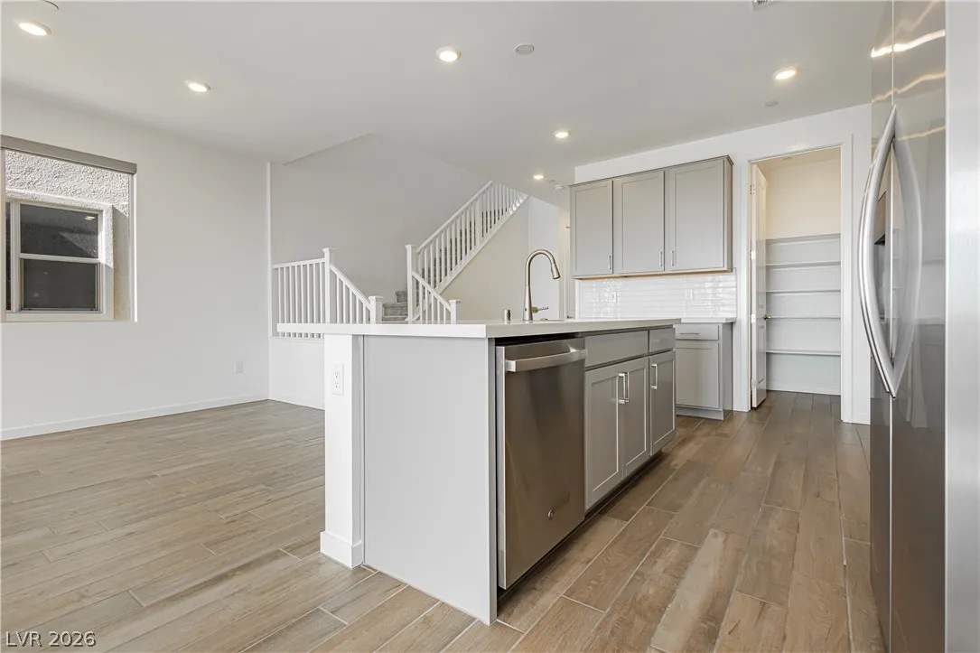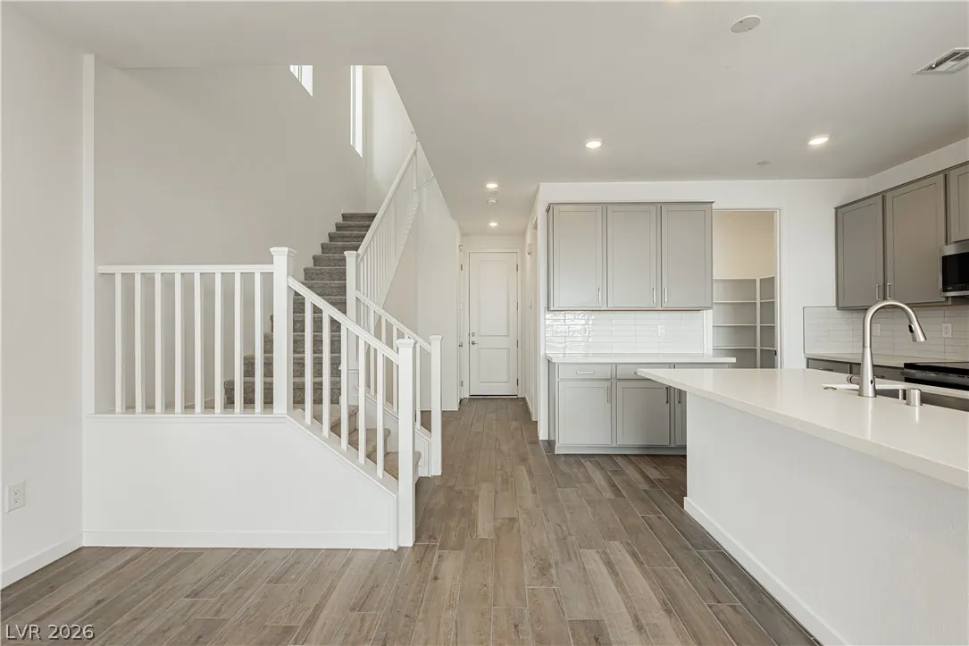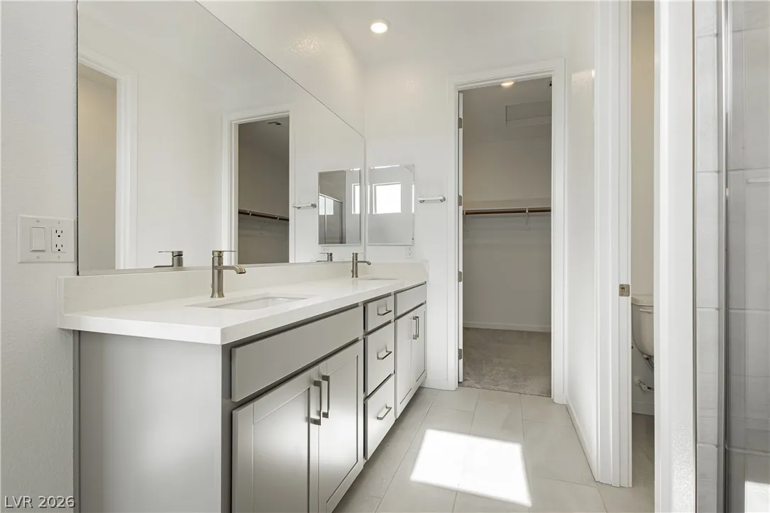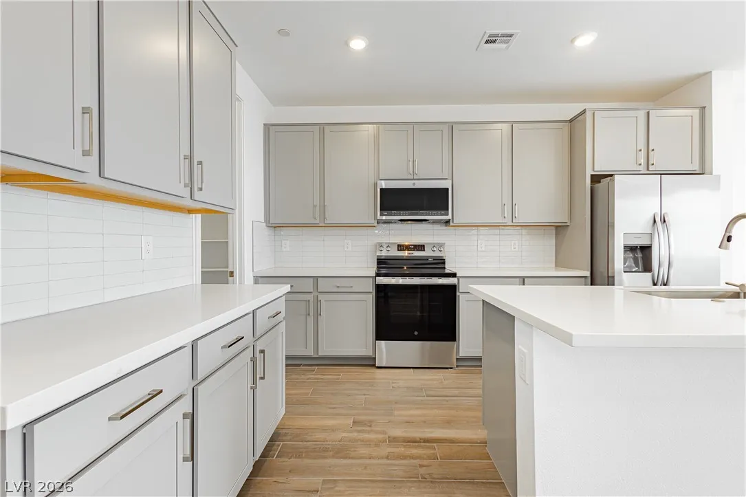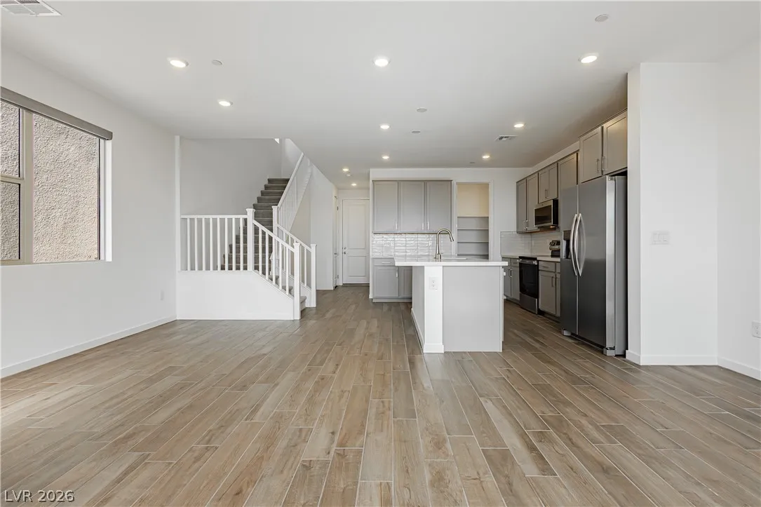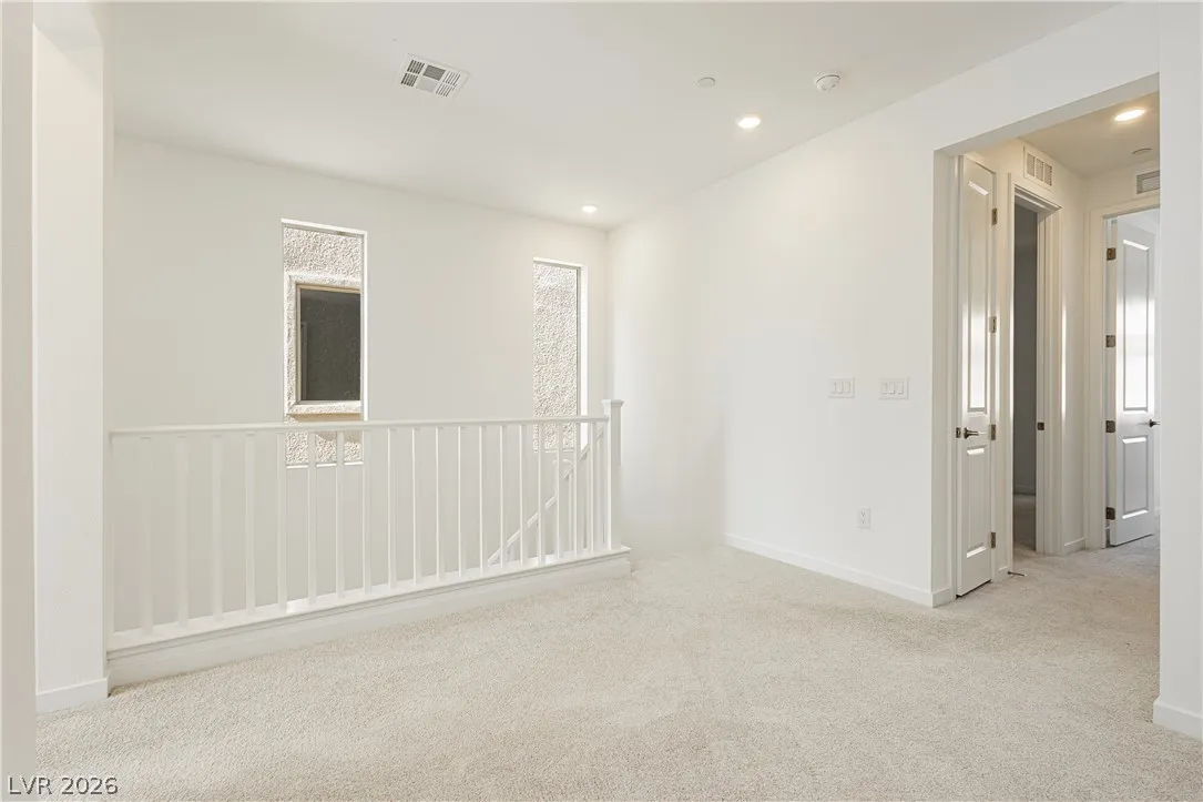 Strip Views from Living Room and Balcony!! Open Concept and Move-in ready inside brand new Lark Hill in Summerlin!! Directly in front of The Hub Park with grassy fields, shaded play areas, courts, and more. This bright two-story blends open-concept living with thoughtful upgrades. The island kitchen offers extended cabinetry and counter space, granite countertops, stainless steel appliances, pantry, and a breakfast bar that opens to spacious living and dining areas ideal for everyday life and entertaining. Upstairs, a loft/flex room anchors the bedroom level. The primary suite features a walk-in closet and a walk-in shower; two secondary bedrooms are nicely sized, and the laundry room is upstairs. Enjoy a large private balcony with views of the Strip and sunrise, and no rear neighbors. Hassle-free landscaping as the HOA maintains everything. Just minutes to DT Summerlin with retail, dining, and quick access to 215.