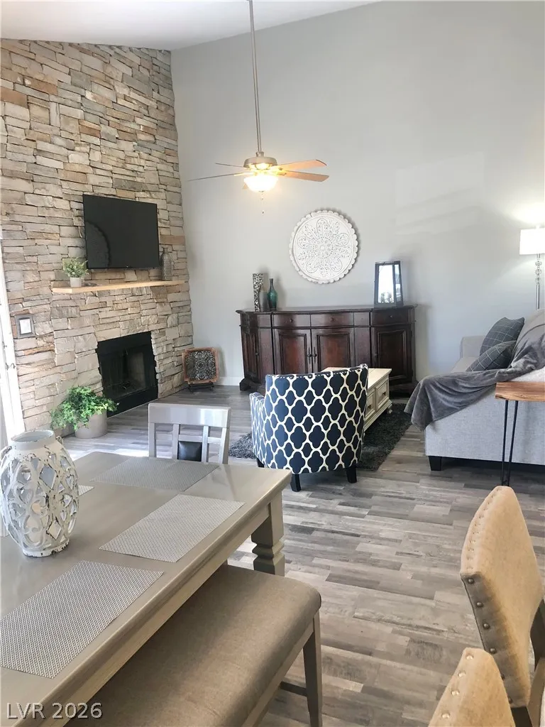 **SEE THE PHOTOS!!** FULLY FURNISHED AND REMODELED SECOND FLOOR WALK UP CONDO WITH BEAUTIFUL FURNISHINGS AND ATTACHED 1 CAR GARAGE JUST BELOW YOU! TWO BALCONIES, NEW FLOORING AND DESIGNER PAINT. GORGEOUS ROCK WALL FROM FLOOR TO CEILING! YOUR OWN COURTYARD GOING STRAIGHT UP TO YOUR OWN BALCONY. NO SHARING STAIRS! STAINLESS APPLIANCES, BEAUTIFUL FIREPLACE, GRANITE COUNTERS, 4 CEILING FANS AND BIG BASEBOARDS. FURNISHED DOWN TO THE SHEETS, TOWELS, SILVERWARE, POTS AND PANS, ETC! SOARING VAULTED CEILINGS MAKE THIS PLACE FEEL SO LARGE! GREAT LOCATION INSIDE THIS COMPLEX. DOWNTOWN SUMMERLIN AND WHOLE FOODS ARE JUST UP SAHARA! THREE MONTH MINIMUM LEASE. NEED A LONGER LEASE? LET US KNOW. MINIMUM CREDIT SCORES REQUIRED OF ALL OCCUPANTS 18 AND OVER. ALL PERSONS ON LEASE MUST OCCUPY THE PROPERTY CONTINUOUSLY. SORRY…..NO AIRBNB, VRBO, RENT TO GO, RENT A ROOM, ETC. TENANT PAYS ELECTRIC BILL. THIS IS AN ALL ELECTRIC COMPLEX. TWO SWIMMING POOLS HERE FOR THE HOT SUMMER AHEAD!
