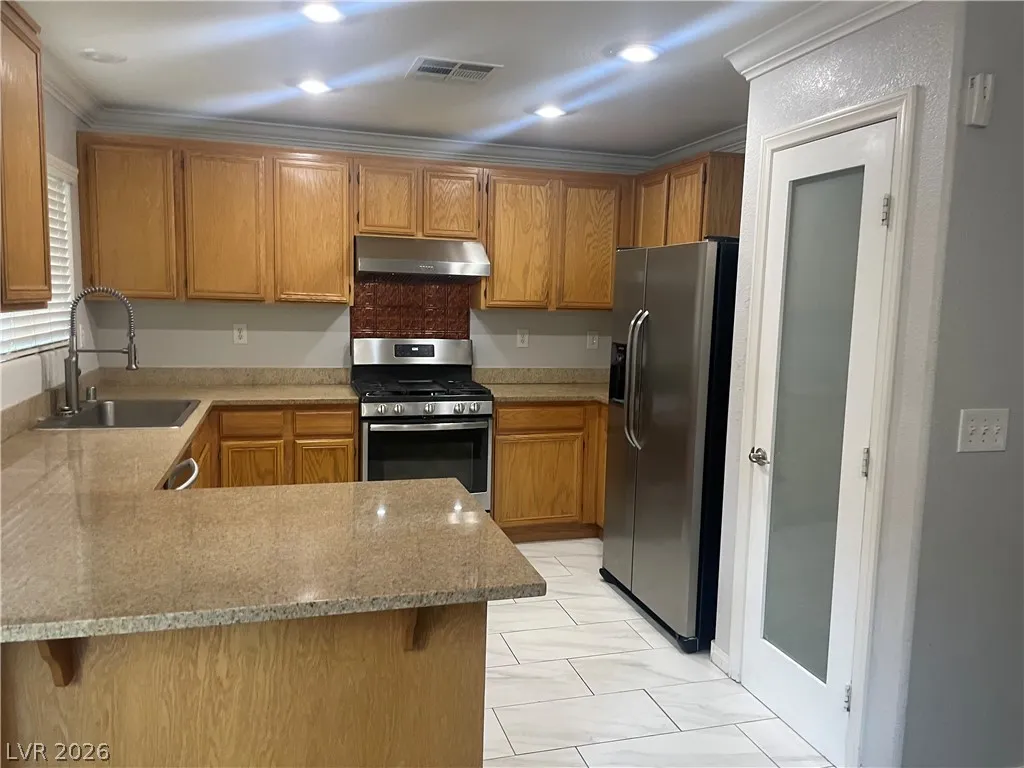 Beautiful home in Southern Highlands featuring 5 bedrooms and 3 full baths, with 1 bedroom/1 bath downstairs, spacious living room, kitchen has granite counter tops and breakfast bar. Upstairs are the primary bedroom and 3 more spacious bedrooms and a loft with carpet throughout. Backyard has a paved patio and pergola with mature landscaping. Free Solar Electricity, solar panel are paid for so very low NV Energy bil. The property is located near shopping area, restaurants and schools.