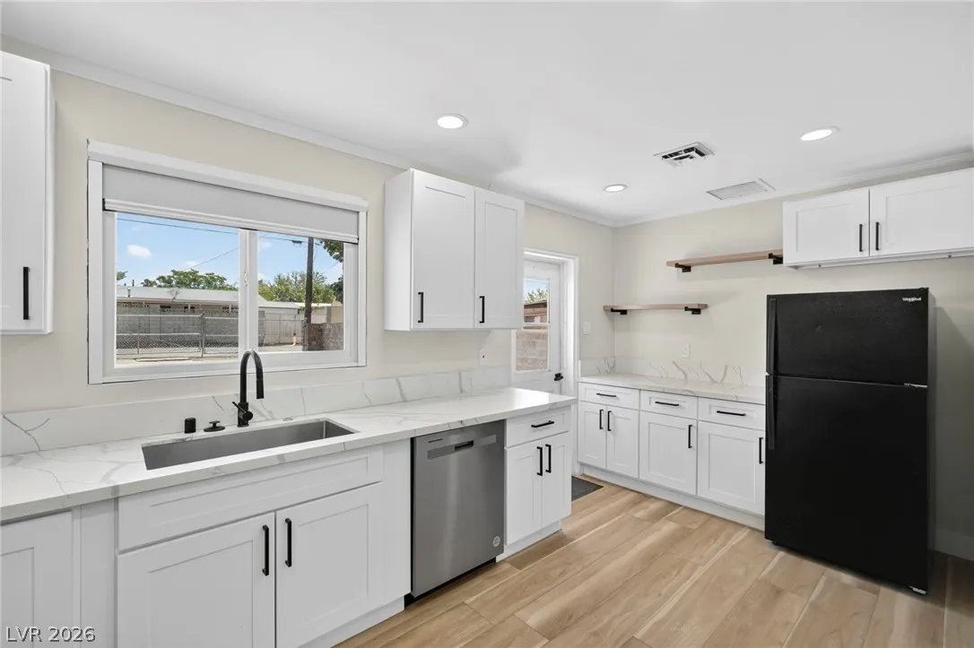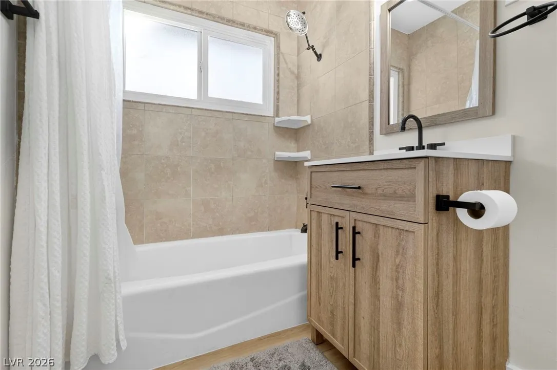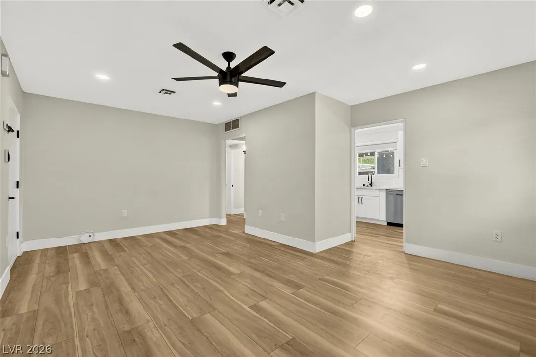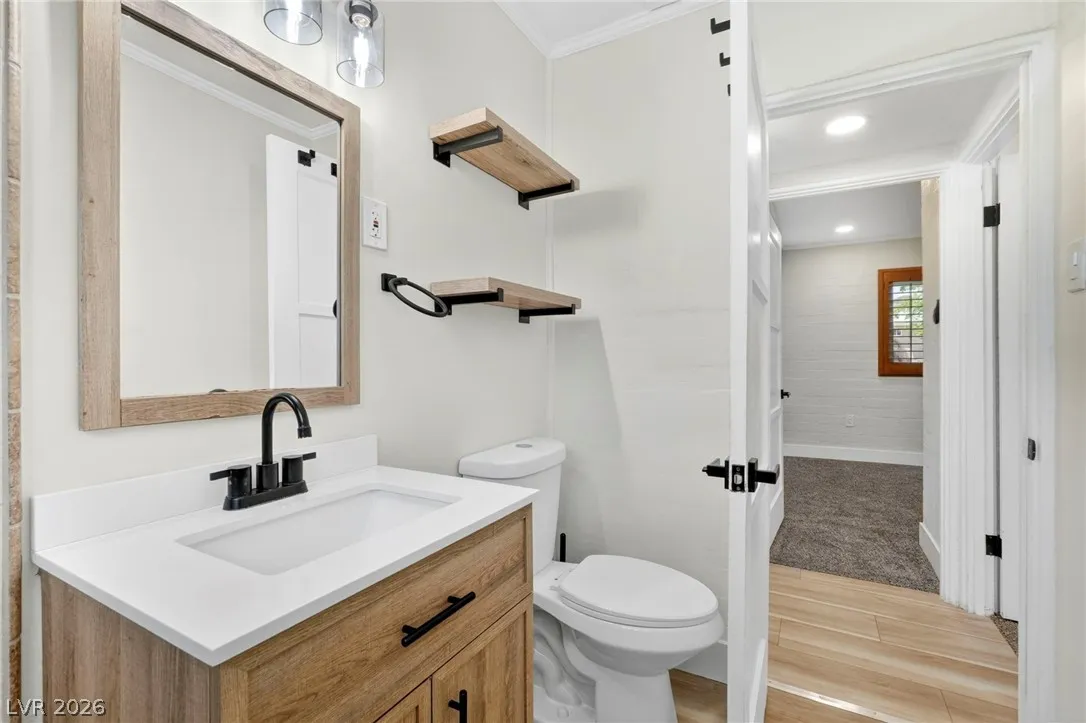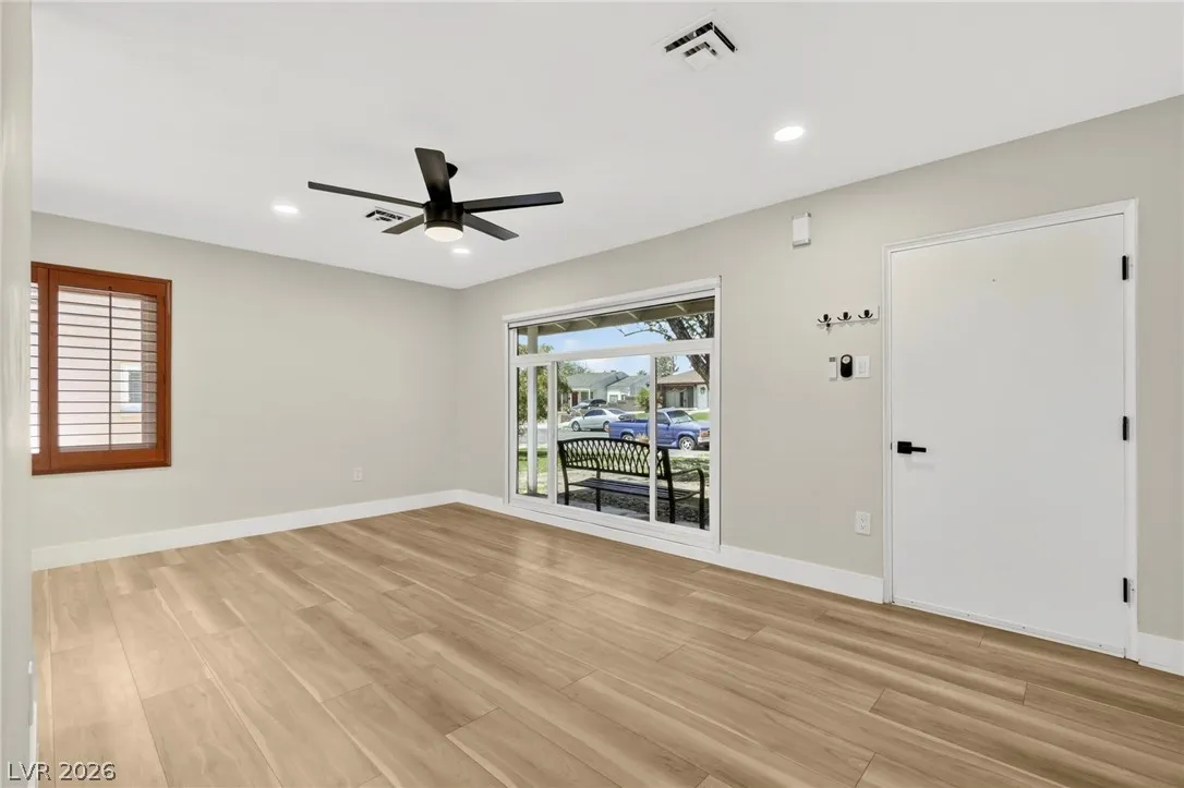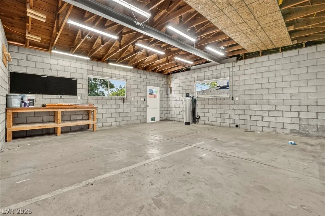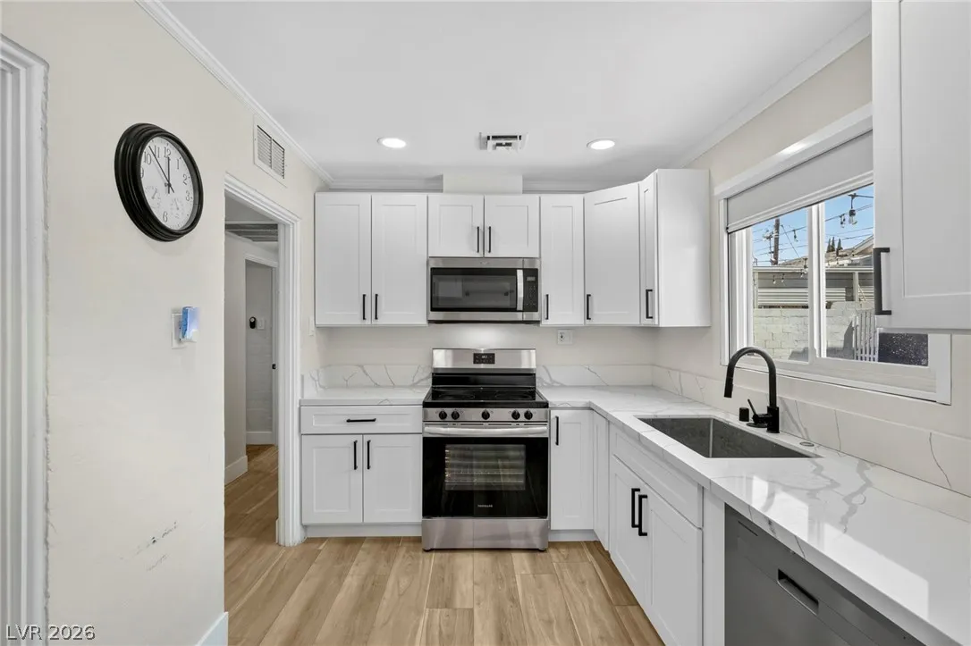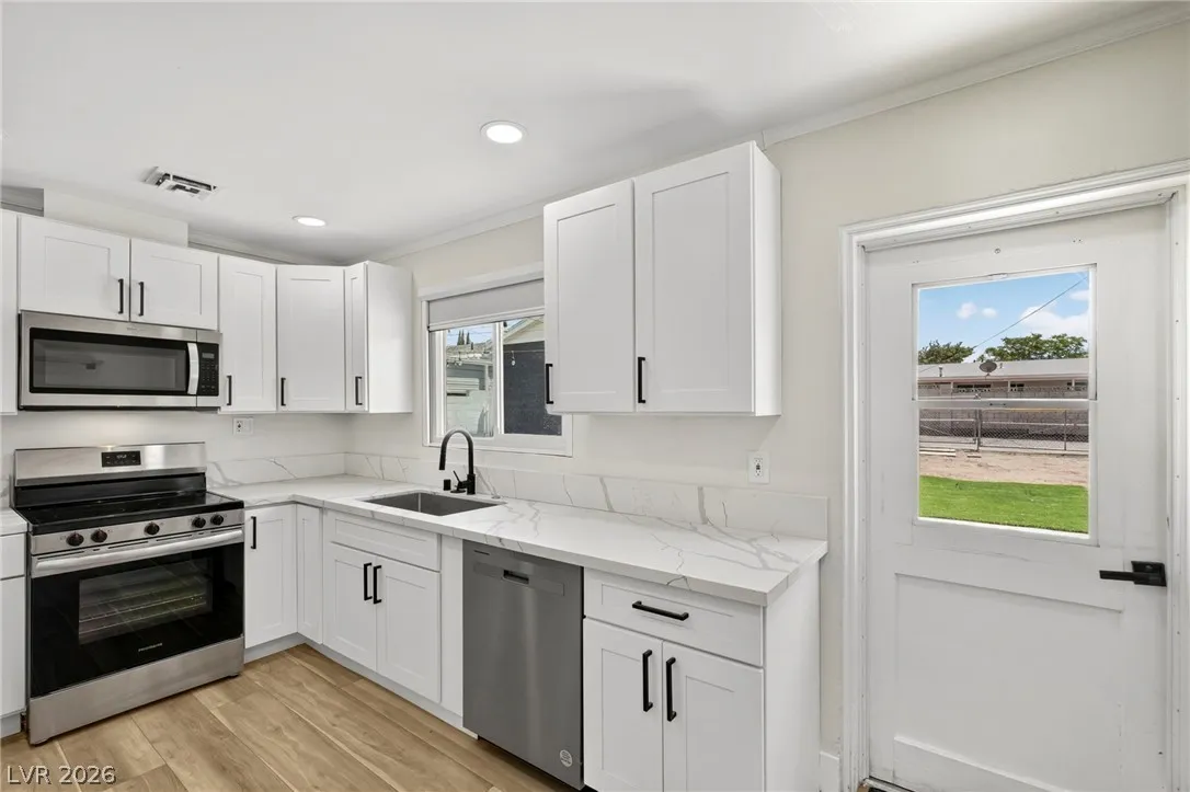 Discover this natural light-filled 2 bed, 1 bath Boulder City home that perfectly blends modern elegance with everyday convenience. The open living room flows into an eat-in dining area, creating an inviting space for entertaining. The kitchen showcases shaker-style cabinets, quartz countertops, and stainless-steel appliances. Both generously sized bedrooms enjoy tons of natural light, while luxury vinyl plank flooring and upgraded baseboards add a low-maintenance finish throughout. Set on an oversized homesite with RV potential and extra parking, the property also includes a spacious 2-car garage/shed for ample storage. Updated water lines to include Hot/Cold, all drain lines, main sewer line to the street, and brand new water softner.