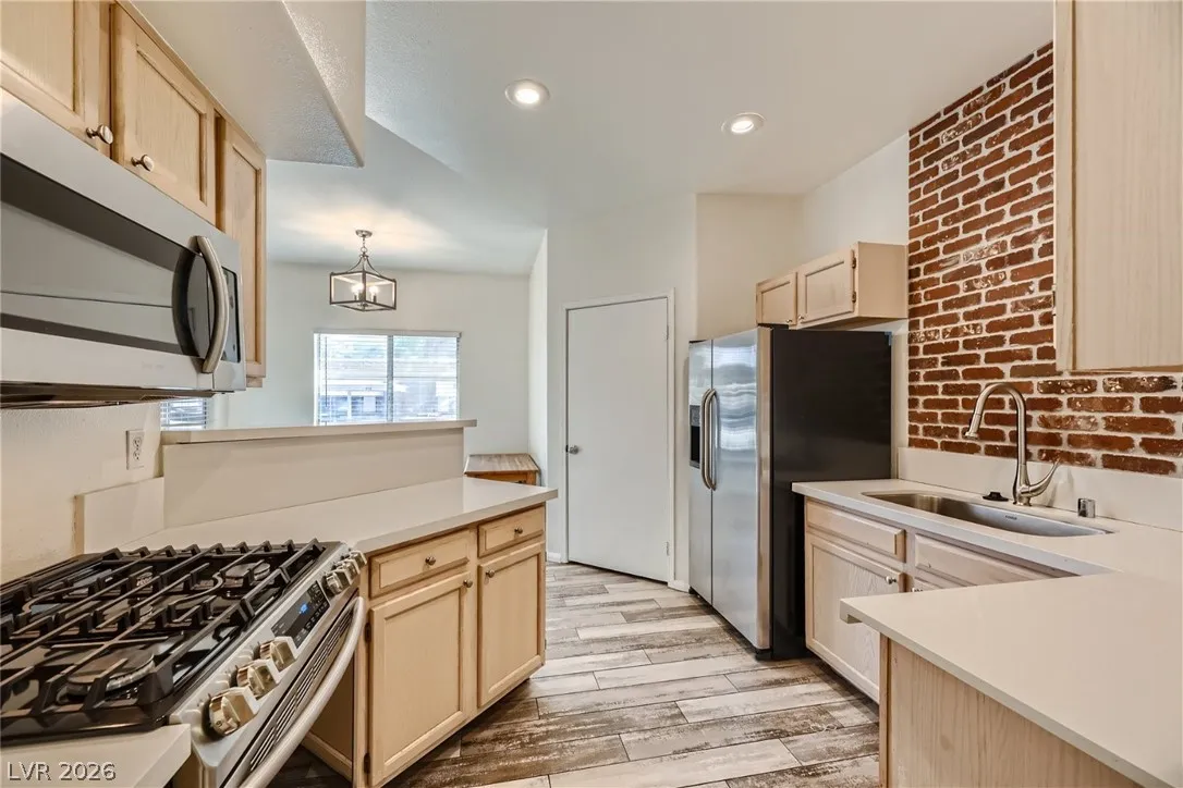 Welcome to this 1-bedroom 1-bathroom condo in Las Vegas. In a guard gated community, this home offers a secure & peaceful environment. Step inside, you’ll be greeted by vinyl flooring & ceiling fans throughout. The cozy fireplace in the living room creates a warm & inviting atmosphere. The kitchen boasts a convenient breakfast bar & pantry, providing ample storage space for all your culinary needs. Equipped with stainless steel appliances & quartz countertops, this kitchen is a chef’s dream. The primary bedroom features a spacious walk-in closet, offering plenty of room for your wardrobe. The bathroom showcases a tile shower/tub combo, providing a luxurious bathing experience. For added convenience, a washer & dryer are included. Step outside onto the covered balcony & enjoy the fresh air & scenic views. With covered parking your vehicle will be protected from the elements. Contact us today to schedule a tour & make this house your new home.