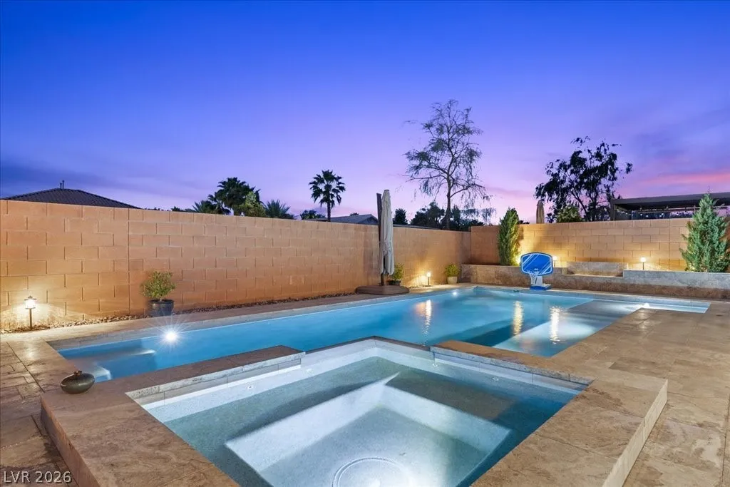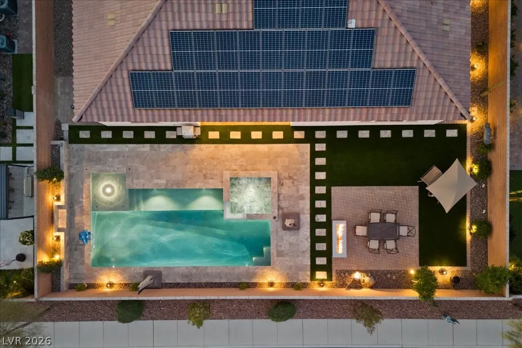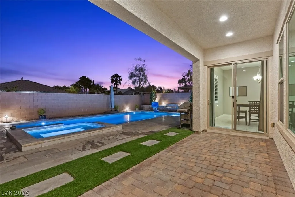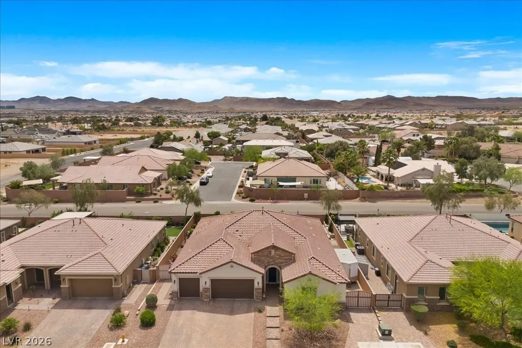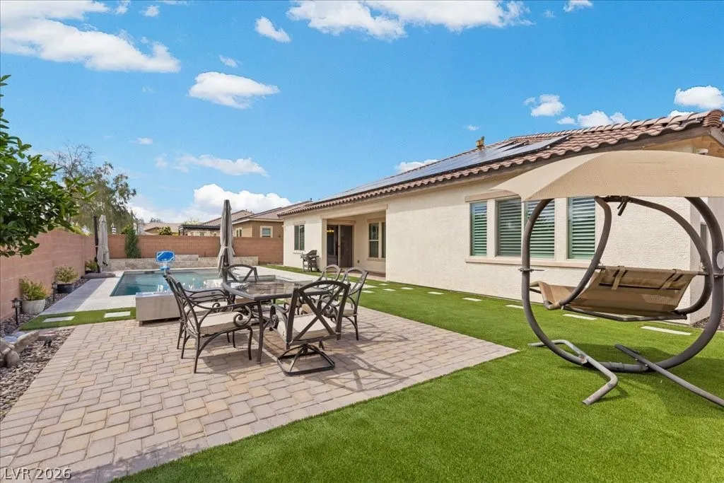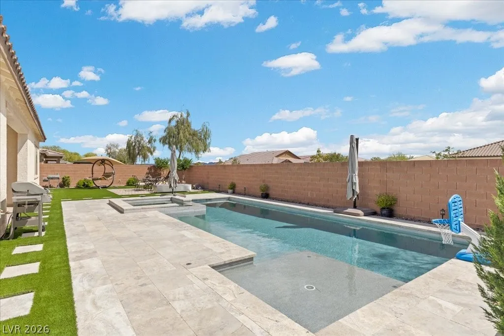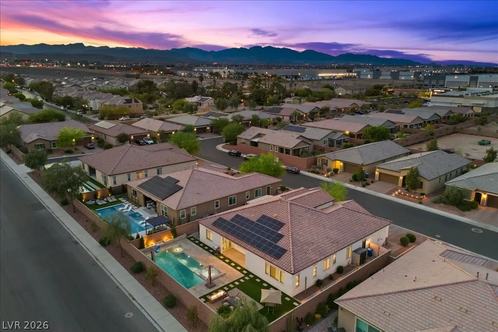 Stunning single-story luxury home in Southwest Las Vegas, minutes from shopping, dining, and the Las Vegas Strip. Situated on a spacious .24-acre lot, this 3-car garage home features 10-ft ceilings and an open-concept floor plan. The upgraded kitchen offers extended-height soft-close cabinets, large island overlooking the living room, double ovens, butler’s prep area, walk-in pantry, and formal dining space perfect for entertaining. The thoughtful layout is designed with secondary bedrooms in a separate wing connected by a pass-through bath. The spacious primary suite has a large walk-in custom closet and looks out to a stunning backyard. The primary bath includes a soaking tub and walk-in shower with floor-to-ceiling tile. The expansive living room has a fireplace lots of natural light and backyard views. A resort-style backyard with a pool, sun deck, spa, covered patio, turf, fire pit, and mature landscaping are the highlight of this home. Paid-off solar for energy efficiency.