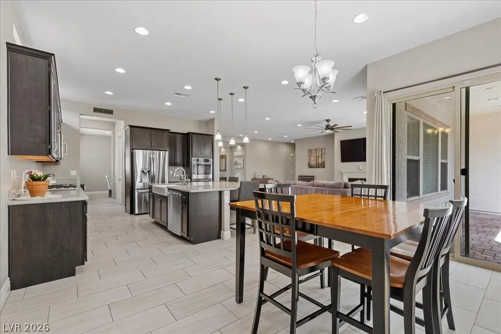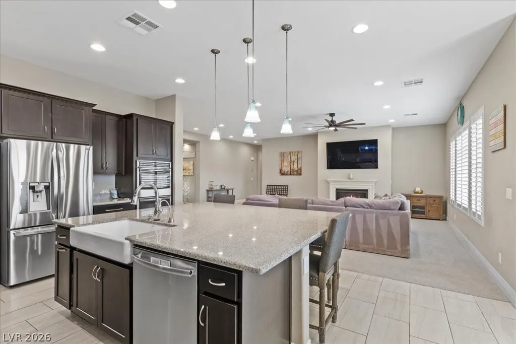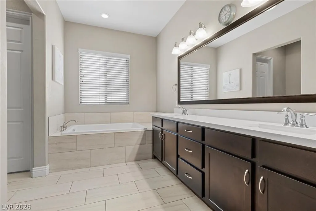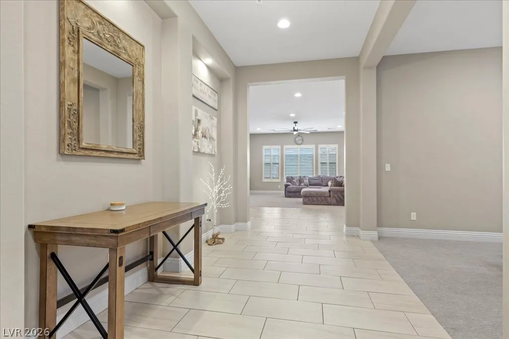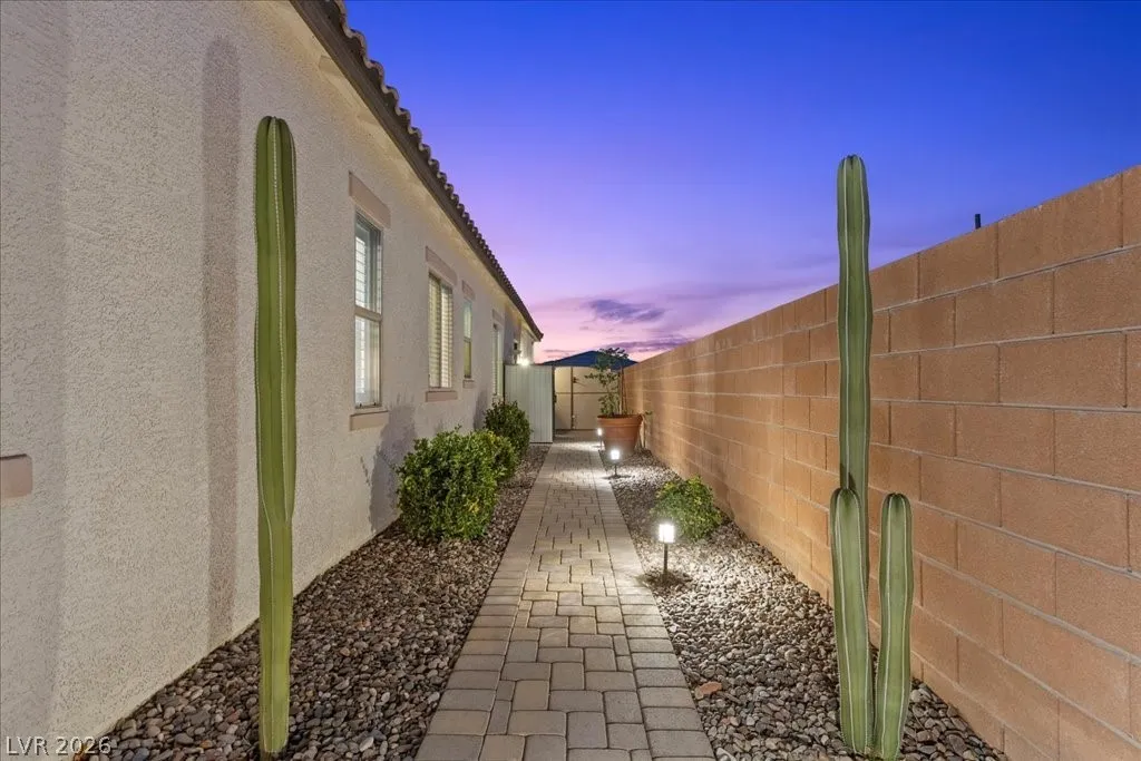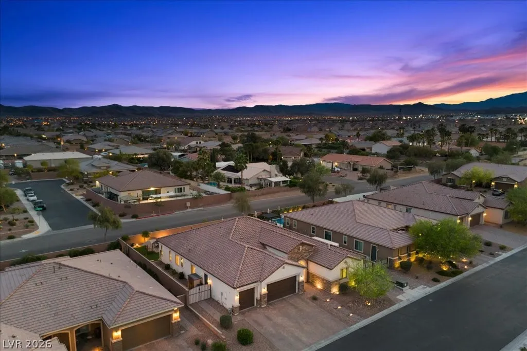 Stunning single-story luxury home in Southwest Las Vegas, minutes from shopping, dining, and the Las Vegas Strip. Situated on a spacious .24-acre lot, this 3-car garage home features 10-ft ceilings and an open-concept floor plan. The upgraded kitchen offers extended-height soft-close cabinets, large island overlooking the living room, double ovens, butler’s prep area, walk-in pantry, and formal dining space perfect for entertaining. The thoughtful layout is designed with secondary bedrooms in a separate wing connected by a pass-through bath. The spacious primary suite has a large walk-in custom closet and looks out to a stunning backyard. The primary bath includes a soaking tub and walk-in shower with floor-to-ceiling tile. The expansive living room has a fireplace lots of natural light and backyard views. A resort-style backyard with a pool, sun deck, spa, covered patio, turf, fire pit, and mature landscaping are the highlight of this home. Paid-off solar for energy efficiency.