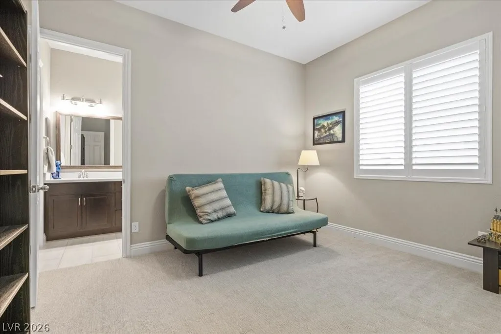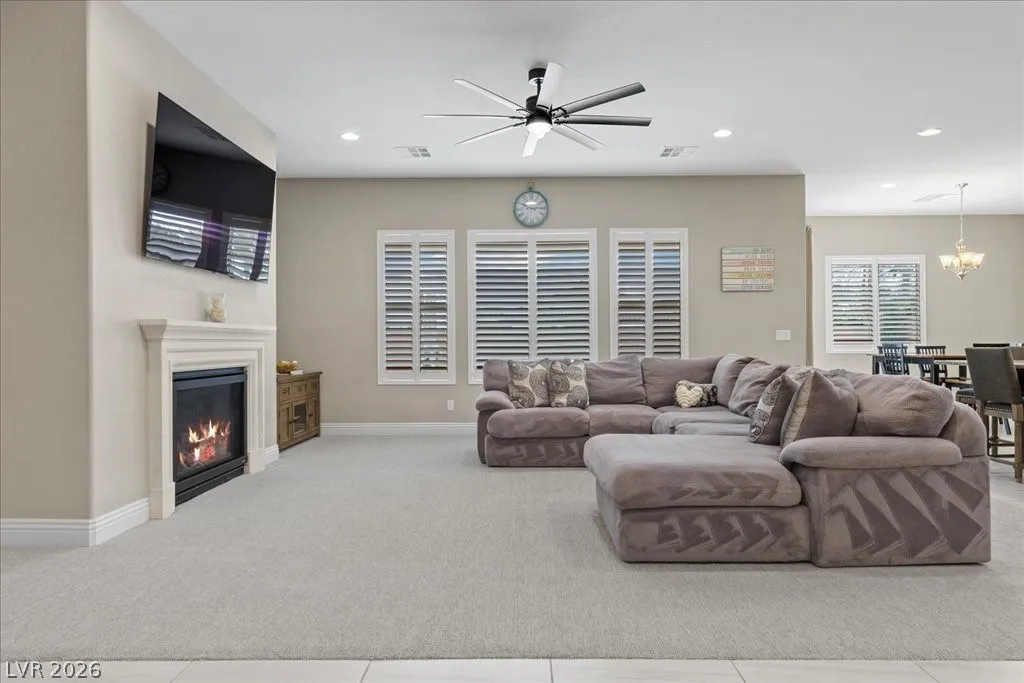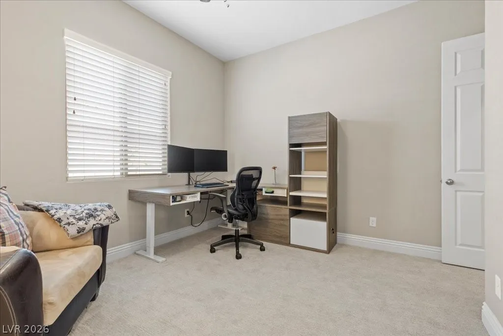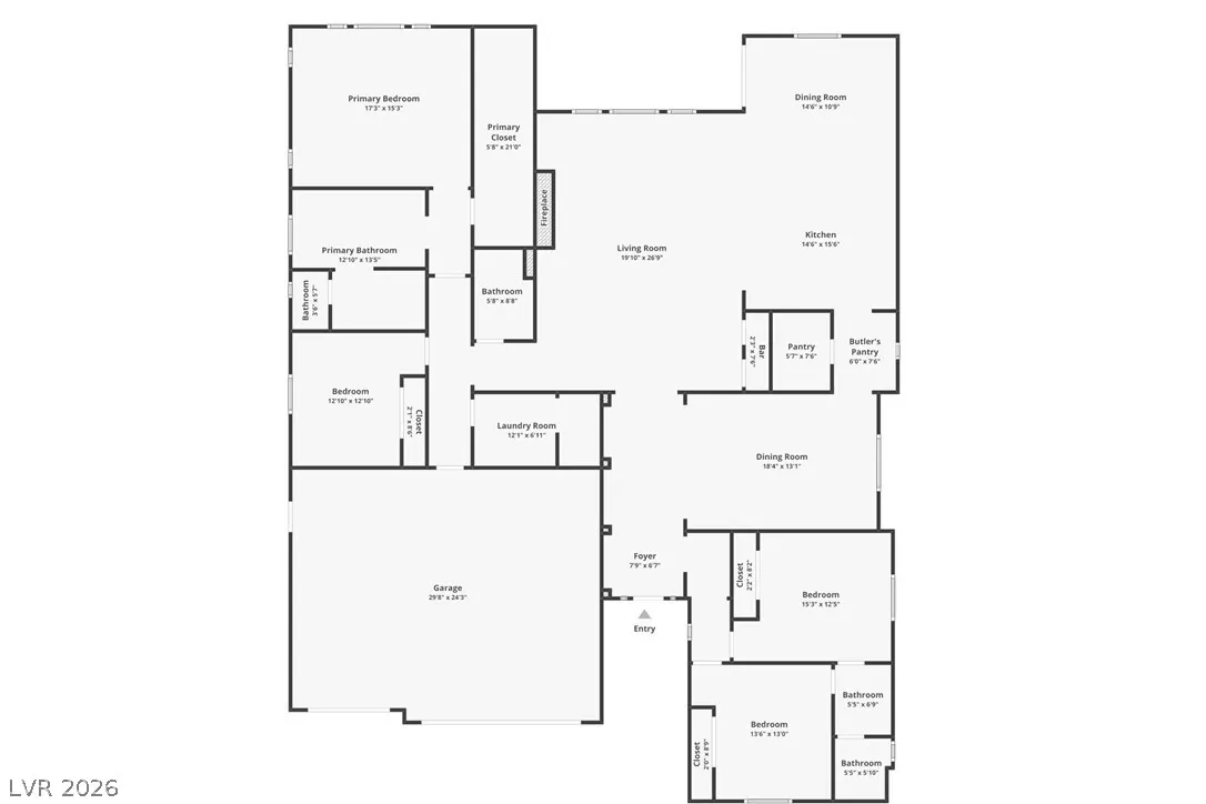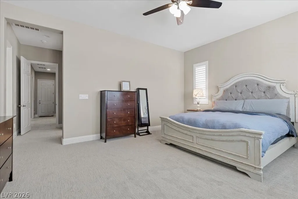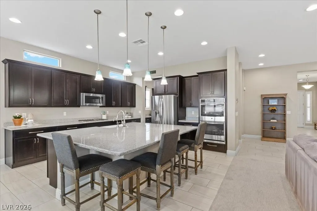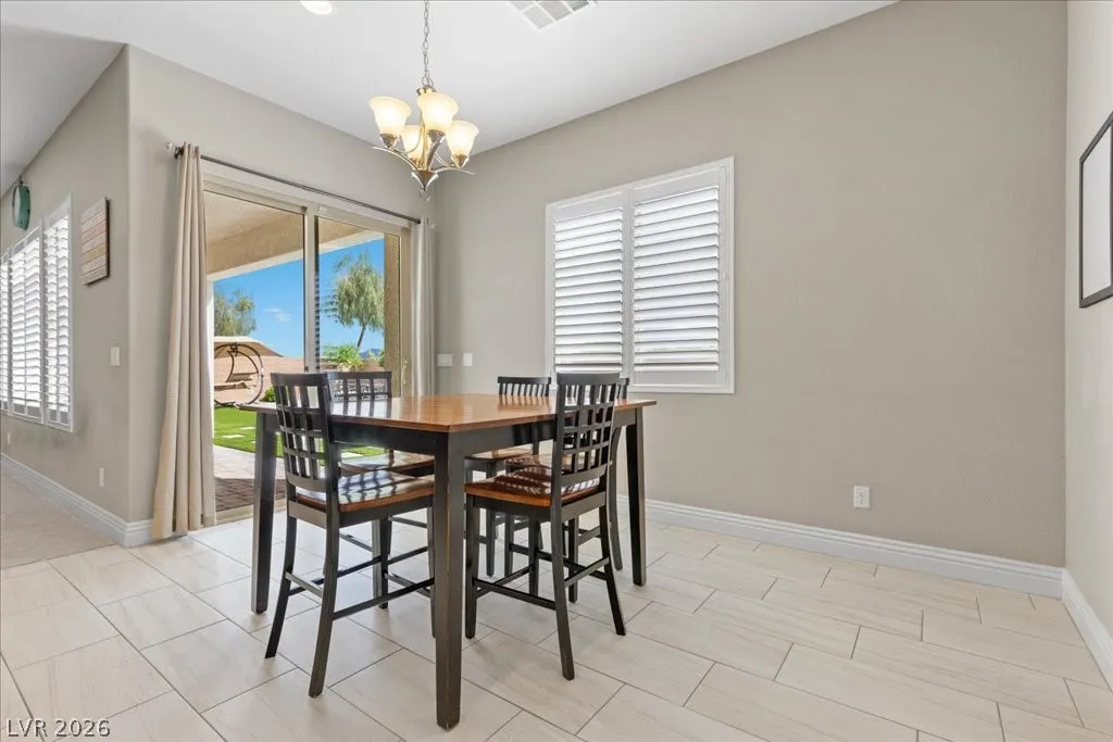 Stunning single-story luxury home in Southwest Las Vegas, minutes from shopping, dining, and the Las Vegas Strip. Situated on a spacious .24-acre lot, this 3-car garage home features 10-ft ceilings and an open-concept floor plan. The upgraded kitchen offers extended-height soft-close cabinets, large island overlooking the living room, double ovens, butler’s prep area, walk-in pantry, and formal dining space perfect for entertaining. The thoughtful layout is designed with secondary bedrooms in a separate wing connected by a pass-through bath. The spacious primary suite has a large walk-in custom closet and looks out to a stunning backyard. The primary bath includes a soaking tub and walk-in shower with floor-to-ceiling tile. The expansive living room has a fireplace lots of natural light and backyard views. A resort-style backyard with a pool, sun deck, spa, covered patio, turf, fire pit, and mature landscaping are the highlight of this home. Paid-off solar for energy efficiency.