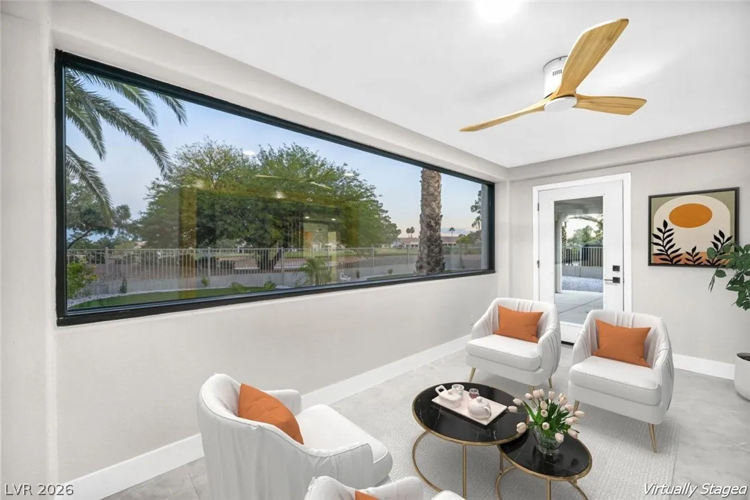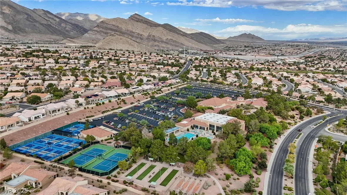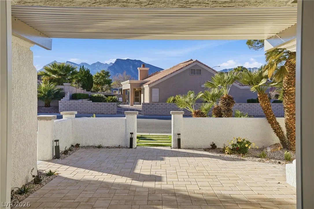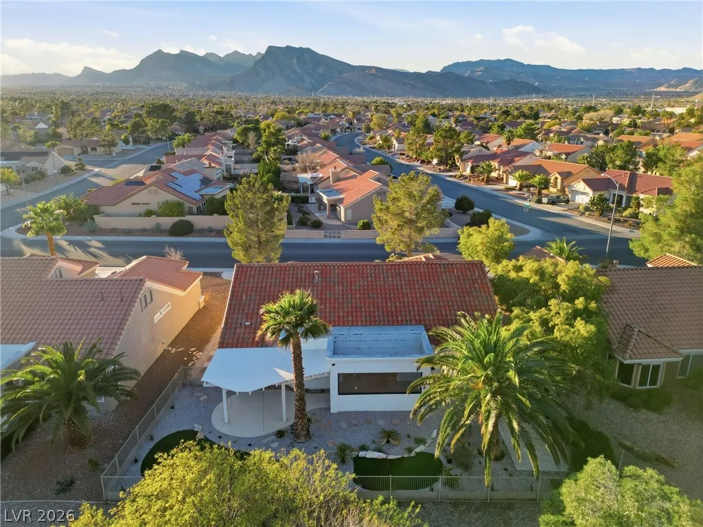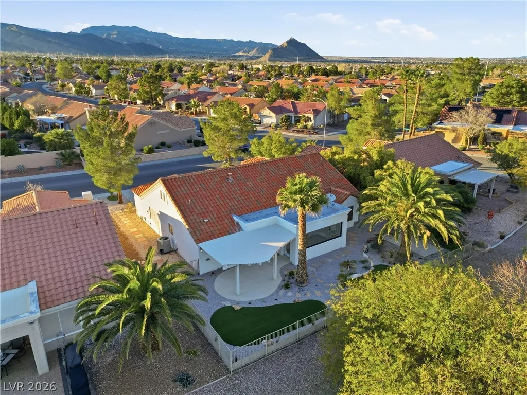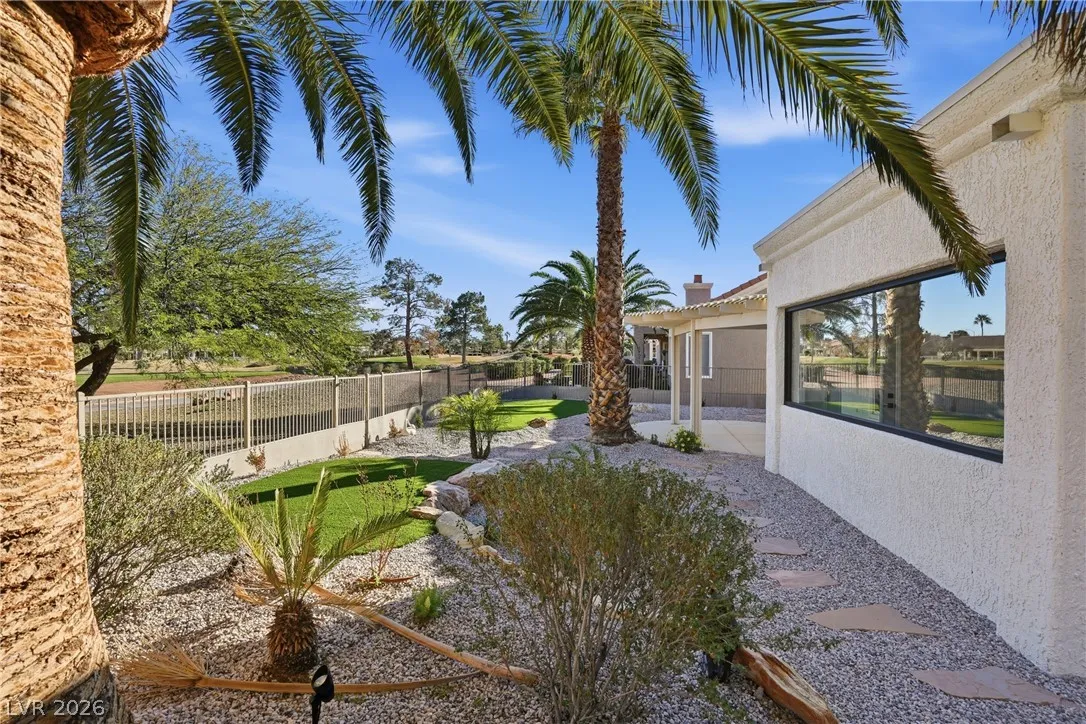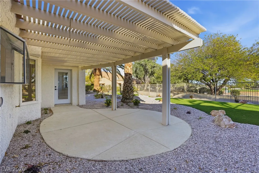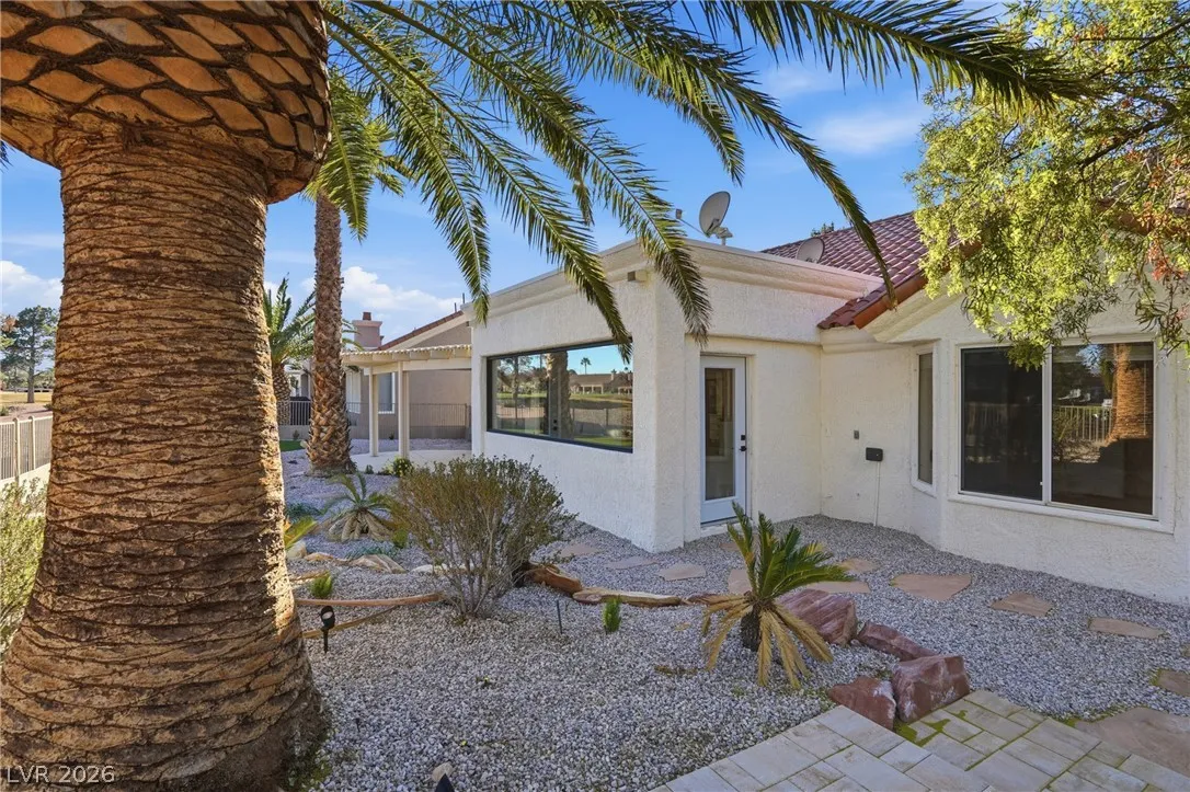 Welcome to this beautifully renovated home in Sun City Summerlin with golf views. This single story, 2 bed 2 bath residence offers outstanding curb appeal with oversized 2 car garage as well as elegant double door entry. The thoughtfully upgraded kitchen features tile flooring, white shaker cabinets, granite & quartz countertops, sleek black hardware, & upgraded appliances. A bright dining area showcases a wall spanning window that fills the space with natural light & provides serene backyard views. The spacious living room is warm & inviting, highlighted by a cozy fireplace, perfect for relaxing or entertaining. Both bathrooms have been tastefully upgraded, with the primary suite offering a spa like en suite complete with dual sinks & a large walk in shower. Step outside to a generous backyard designed for enjoyment, featuring a pergola ideal for outdoor dining or lounging. This move in ready home combines modern upgrades with the lifestyle & amenities Sun City Summerlin is known for.
