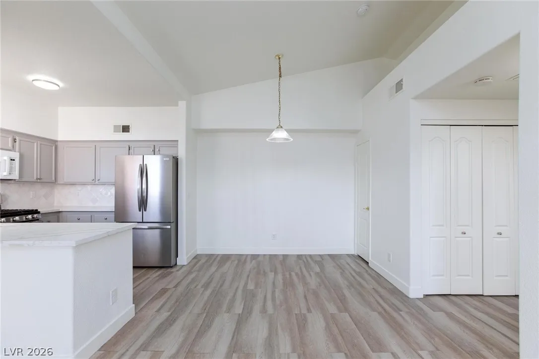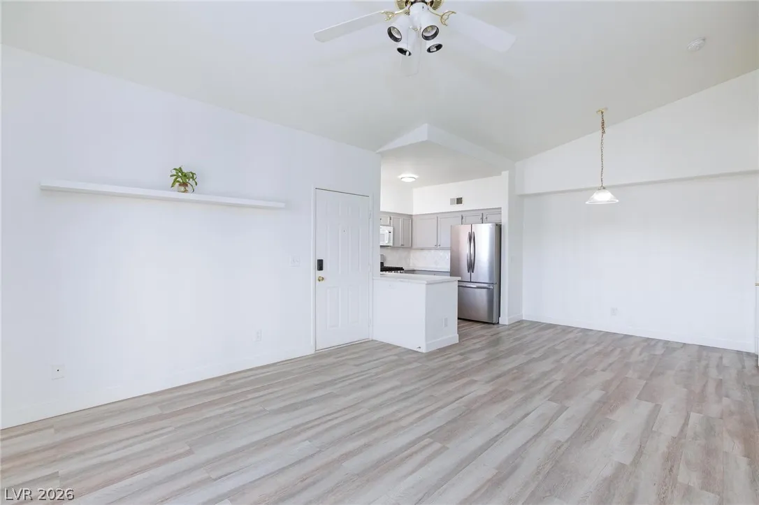 Newly remodeled kitchen and vaulted ceilings! This is a must see!! This unit has an open view with no other building in front. The newly renovated kitchen has a brand new dishwasher, tile backsplash and quartzite countertops, single basin sink and faucet, and a 6 month old fridge! The unit has been freshly painted! The dual sided fireplace sits between the living room and bedroom. The large bathroom has Dual sinks, an oversized tub/shower combo and lots of storage under the sinks. There is a separate washer/dryer closet with both machines included. This unit has no carpet for easy cleaning! This unit is located close to guests parking and the covered carport is just steps away! Come check out this cozy condo.