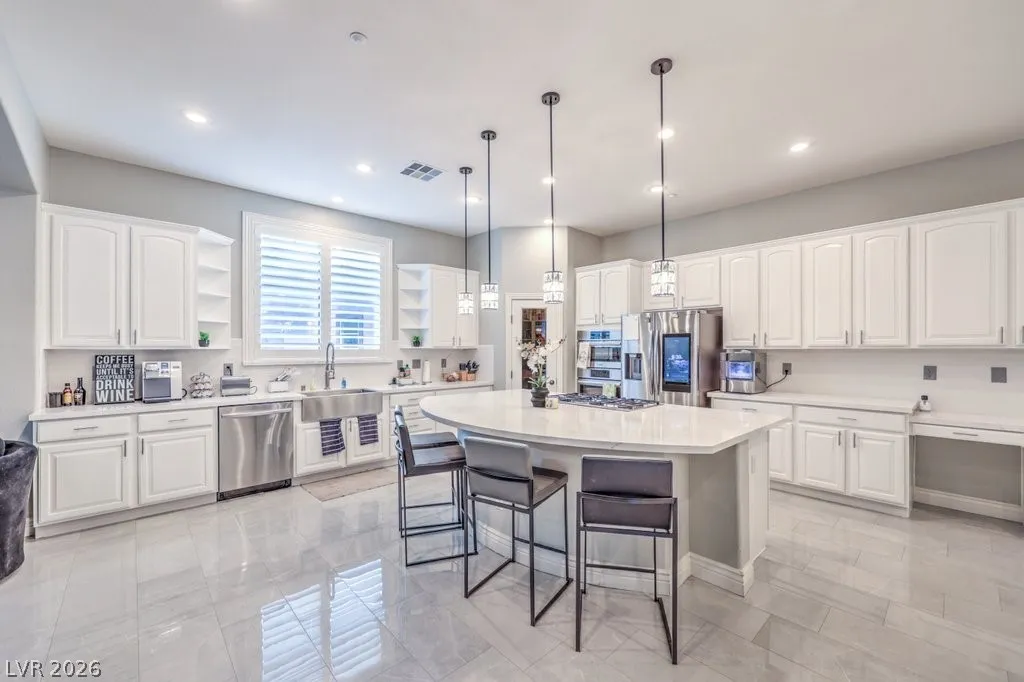 Interior upgrades include new paint, Luxury Flooring, and modern finishes throughout. The renovated kitchen showcases quartz countertops, upgraded lighting, a large island, Bosch double smart ovens, Samsung Smart Family Hub refrigerator.