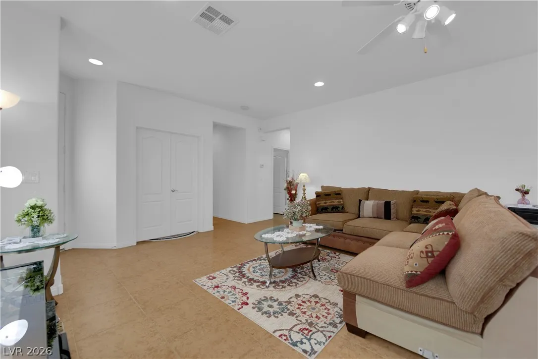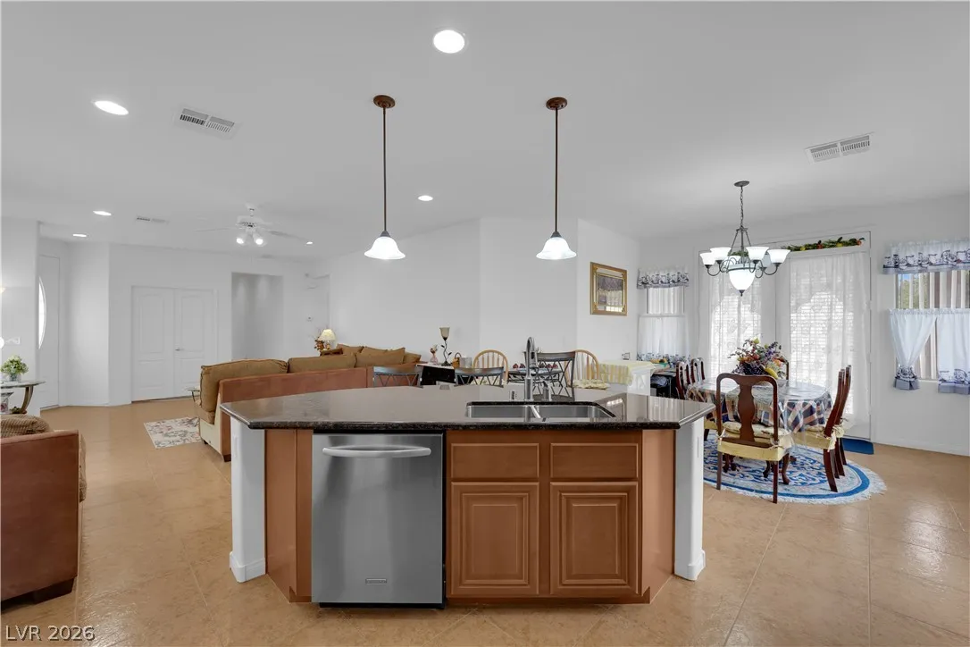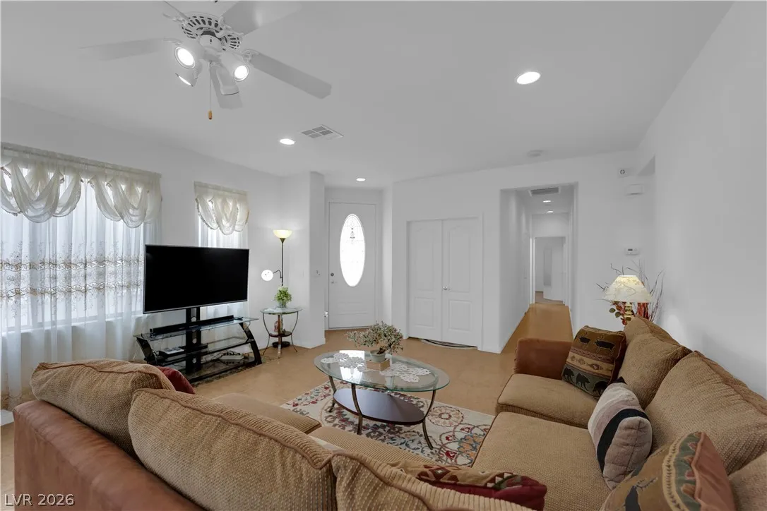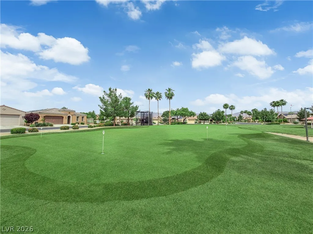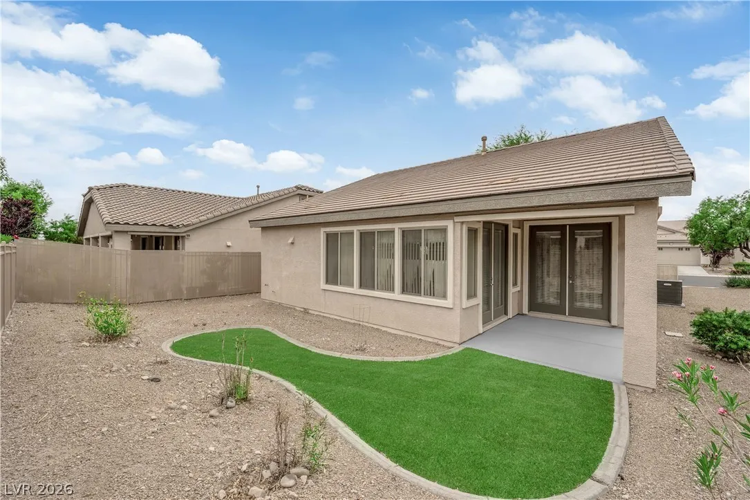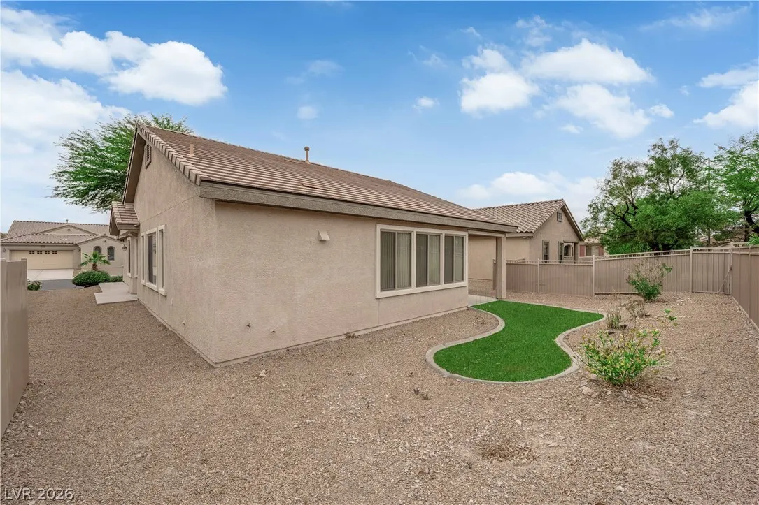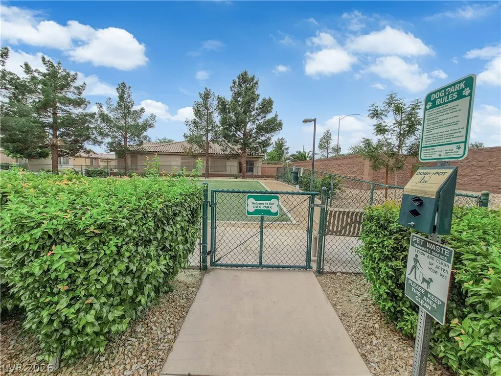 Immaculate single-story home in a gated 55+ community, lightly used as a vacation home and exceptionally clean, spotless, and move-in ready. Bright open floorplan with 2 bedrooms plus a versatile den, ideal for a home office, study, hobby room, or possible 3rd bedroom conversion. Spacious kitchen features granite countertops, center island with breakfast bar, stainless steel appliances, and all appliances convey. This beautiful property include a 2-car garage with epoxy flooring, included water softener, and a clean low-maintenance backyard with a covered patio, perfect for relaxing or outdoor dining. Enjoy resort-style community amenities including a clubhouse, two pools, spa, fitness center, tennis courts, pickleball, basketball, bocce ball, billiards, putting green, dog park, walking areas, and fun social activities for active adults. Conveniently located near the VA Southern Nevada Healthcare System, shopping, dining, and everyday conveniences.
