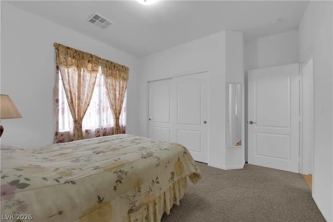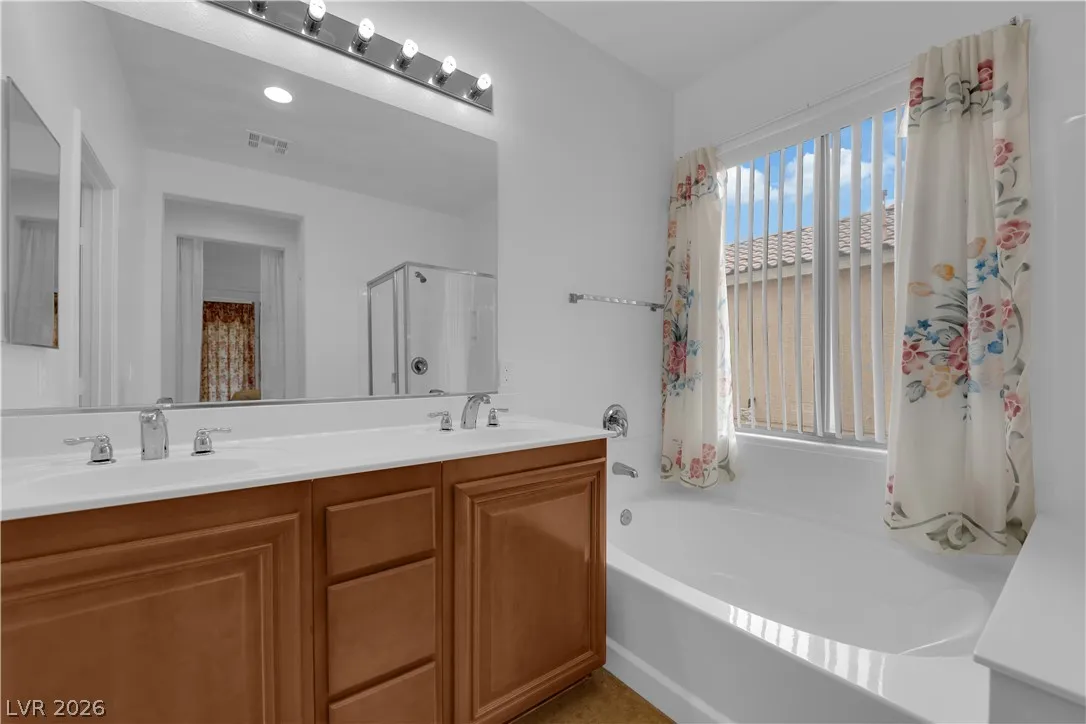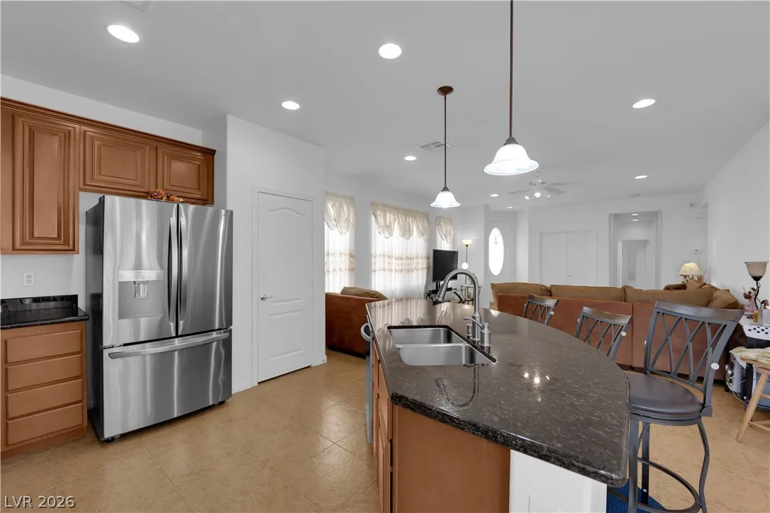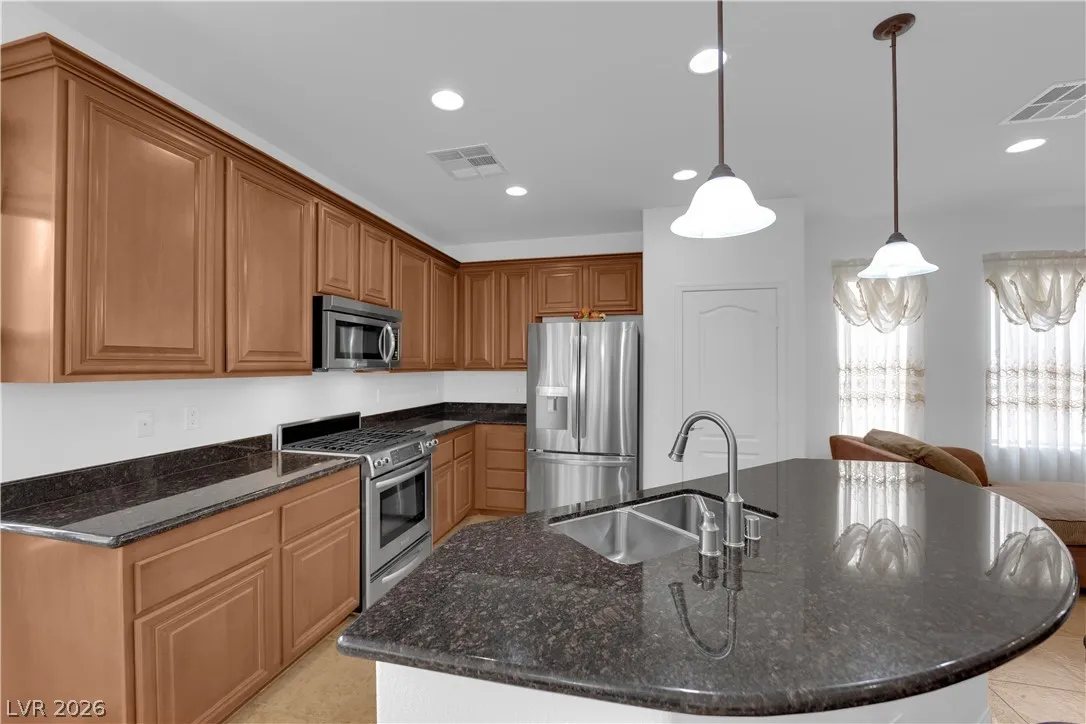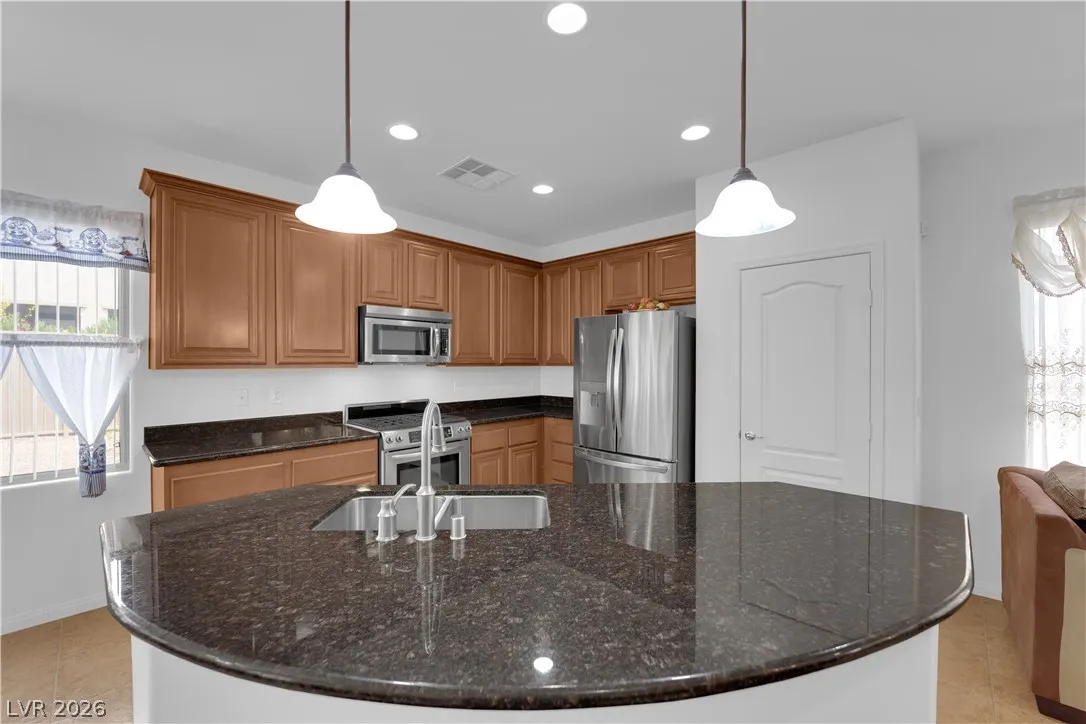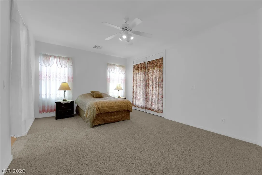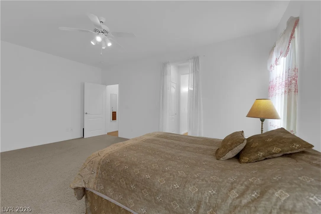 Immaculate single-story home in a gated 55+ community, lightly used as a vacation home and exceptionally clean, spotless, and move-in ready. Bright open floorplan with 2 bedrooms plus a versatile den, ideal for a home office, study, hobby room, or possible 3rd bedroom conversion. Spacious kitchen features granite countertops, center island with breakfast bar, stainless steel appliances, and all appliances convey. This beautiful property include a 2-car garage with epoxy flooring, included water softener, and a clean low-maintenance backyard with a covered patio, perfect for relaxing or outdoor dining. Enjoy resort-style community amenities including a clubhouse, two pools, spa, fitness center, tennis courts, pickleball, basketball, bocce ball, billiards, putting green, dog park, walking areas, and fun social activities for active adults. Conveniently located near the VA Southern Nevada Healthcare System, shopping, dining, and everyday conveniences.