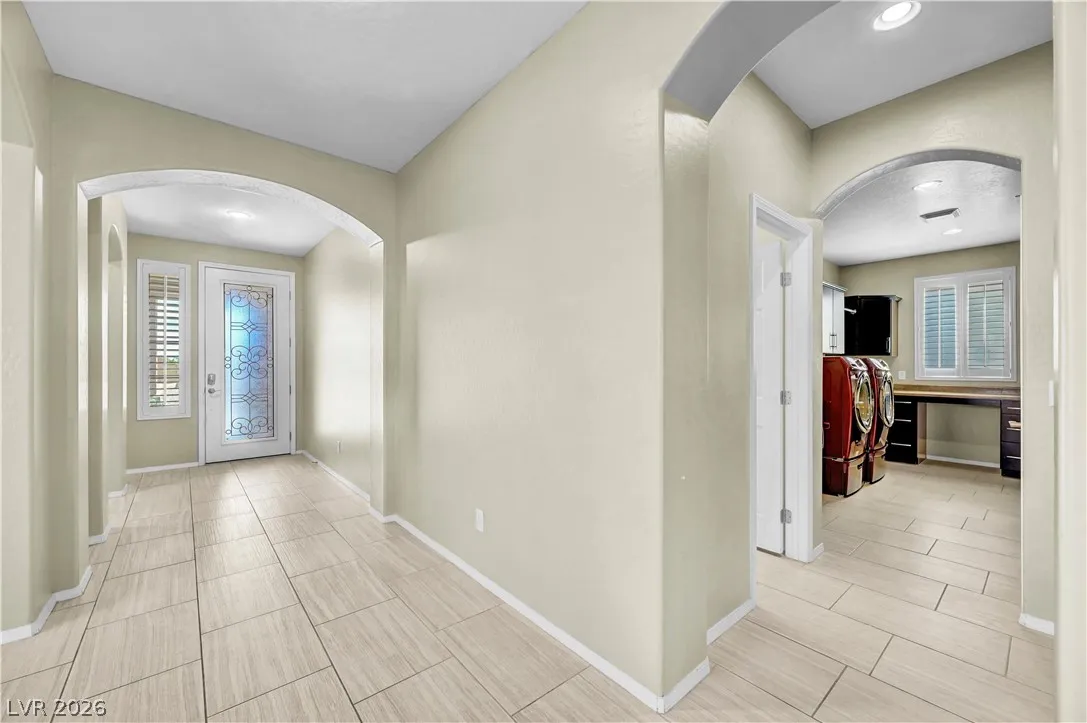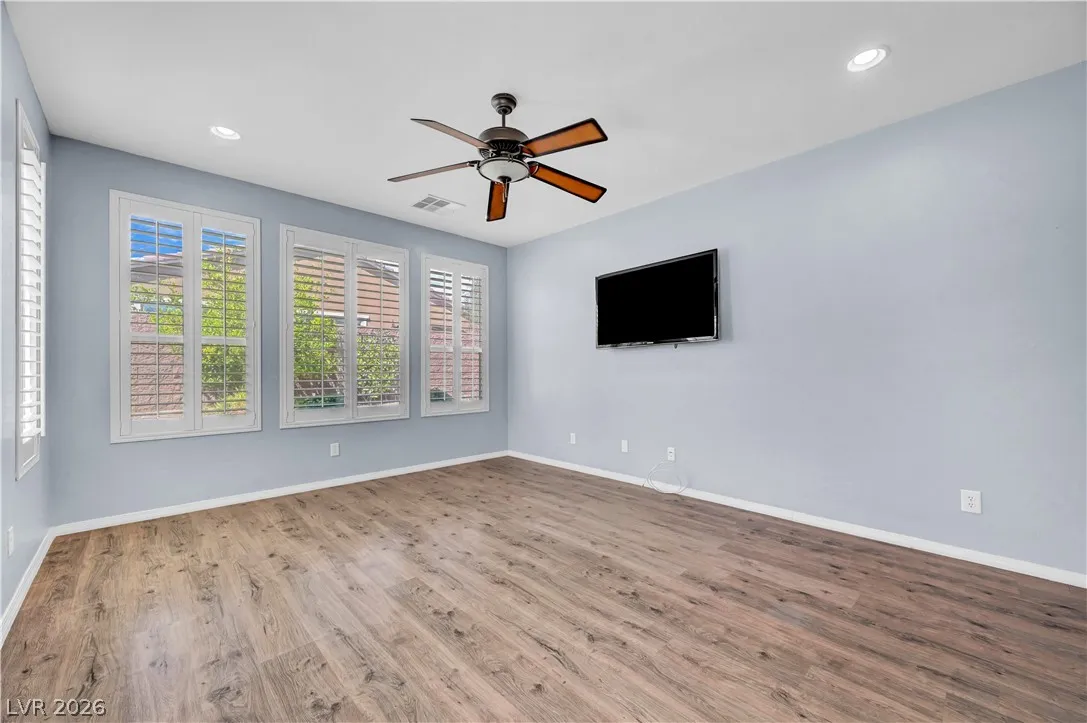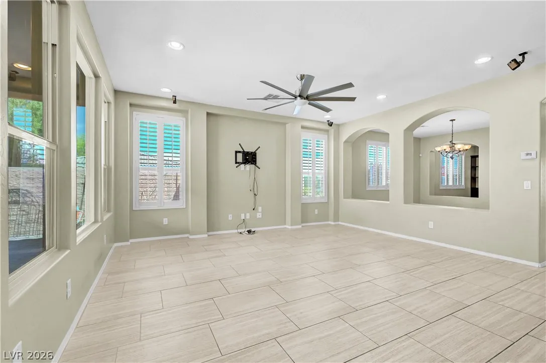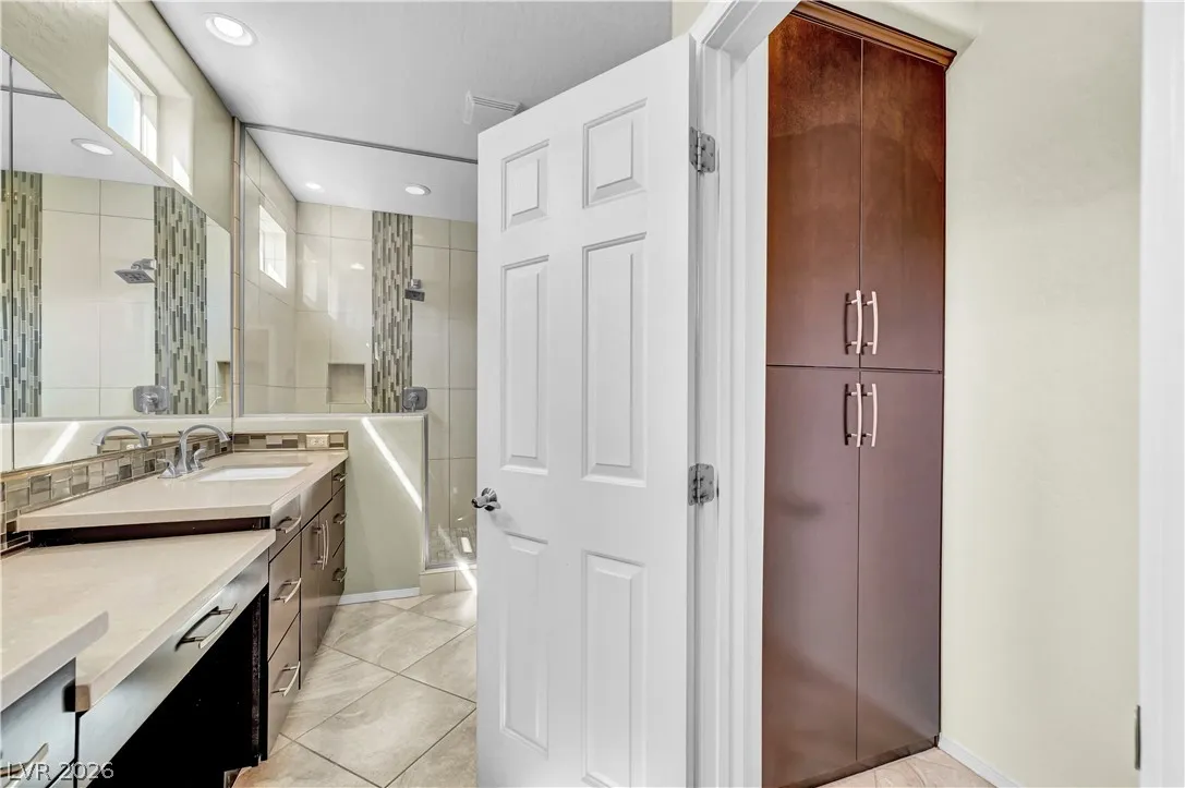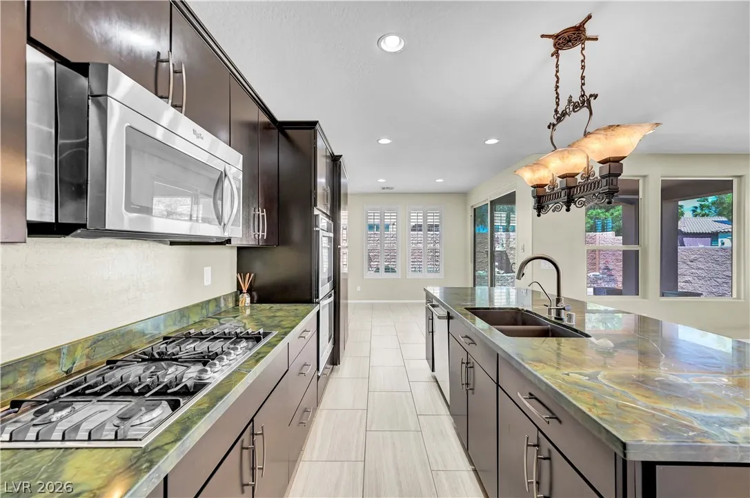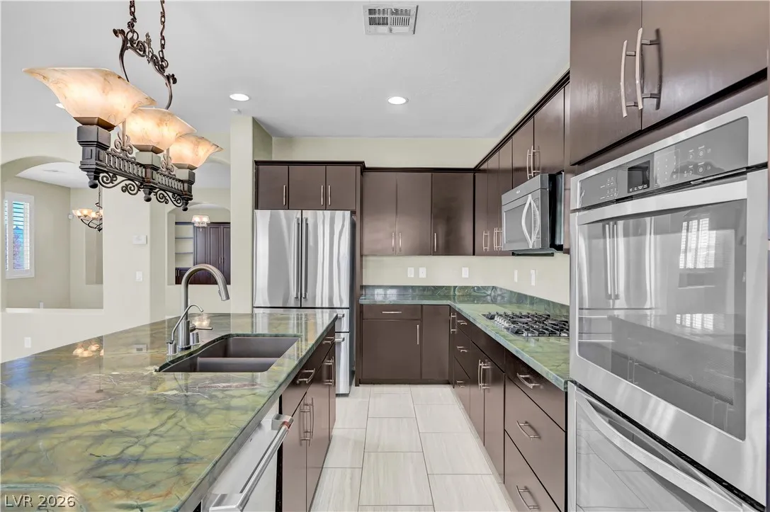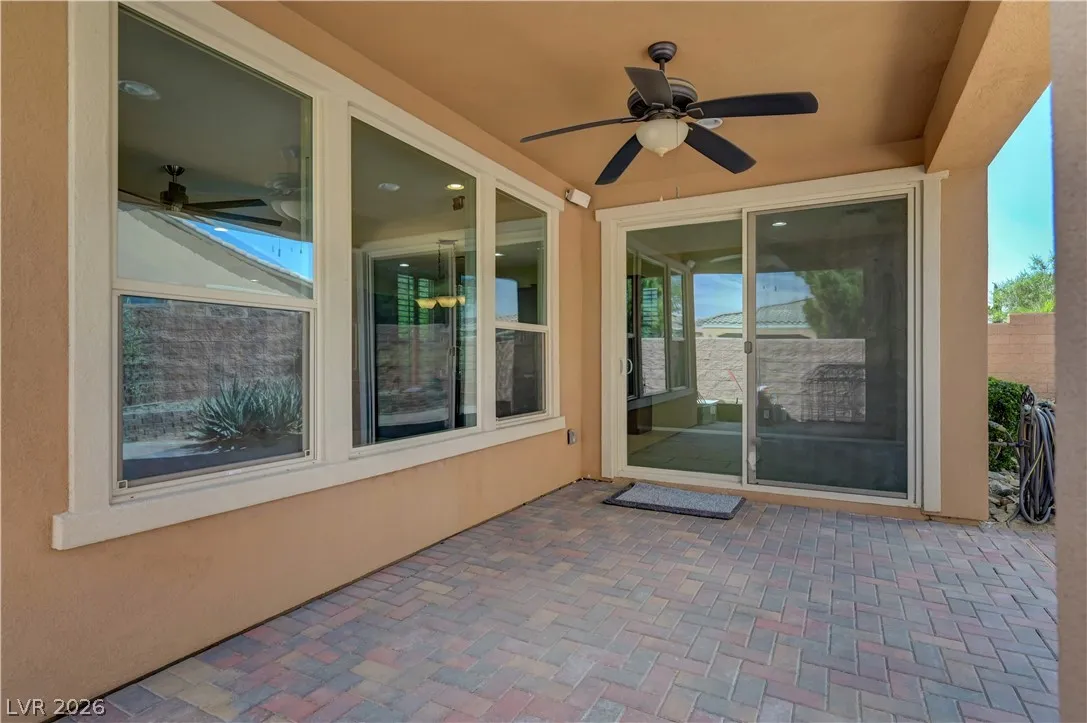 AGE RESTRICTED 55+ Resort Style Living. Gated. Prepaid Solar Panels. Close to New State of The Art VA Hospital and Shopping. Easy Access to the 215 and I-15. Rarely Available. Large Corner Lot. NO CARPET. Extended Garage. 2 Bedrooms, Plus Den with Built in Murphy Bed – Could Easily be 3rd Bedroom. 2-1/2 Baths. Chefs Kitchen, Brazilian Granite Counters, S/S Appliances, Double Ovens, Gas Cook Top, R/O. Huge Island, Tons of Cabinets and Counter Space – Breakfast Area has Plenty of Space for a Table. Primary Retreat with Huge Tiled Shower, Large Vanity, Double Sinks, Walk In Closet. Fabulous Formal Dining Room with Built in Bar with Wine Fridge. Extra Smart Space has Cabinets, Built in Desk/Counters for Crafts/Office or Anything You’d like it to be. Soft Water System. Fabulous Arches Throughout. Shutters. Entertainers Backyard with a Covered Pavered Patio. Clubhouse with 2 Pools, Spa, BBQ Area, Billiards, Gym, Steam Room, Pickleball, Tennis, Putting Green, Bocce, Dog Park, Social Calendar