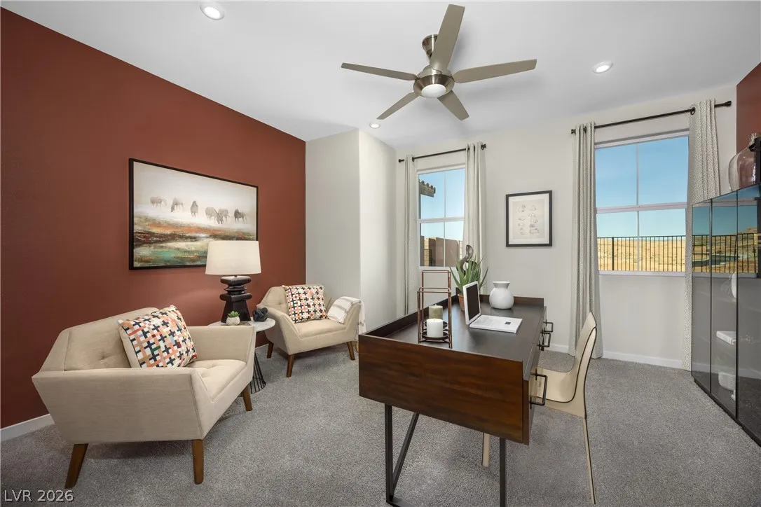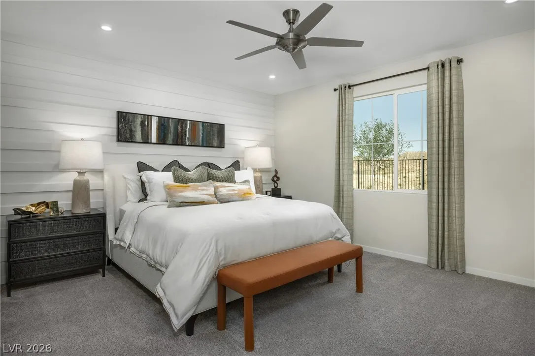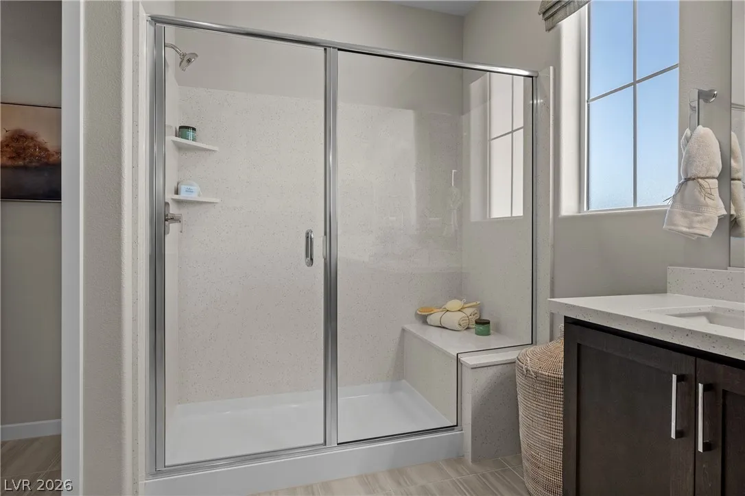 Welcome to the NEXUS at 308 Oboe Place, Henderson, NV 89015, a beautiful single-story home located in the heart of Henderson built by Beazer Homes. This stunning new construction home has 3 beds, 2.5 baths, a study and sits on a corner lot. The 2,191 sf layout features an expansive foyer that makes an impression from the moment guests enter your home. The modern kitchen features Simply White Quartz countertops, Truffle cabinets with matte black bar pulls, pendant lighting and full-height backsplash. The primary suite boasts a walk-in shower with floor to ceiling tile, built-in shower seat and a frameless enclosure. This home includes solar panels, helping reduce monthly energy costs while providing backup power and protection against rising utility rates.