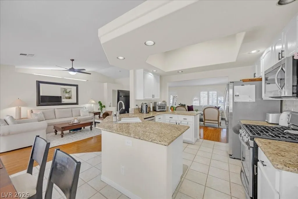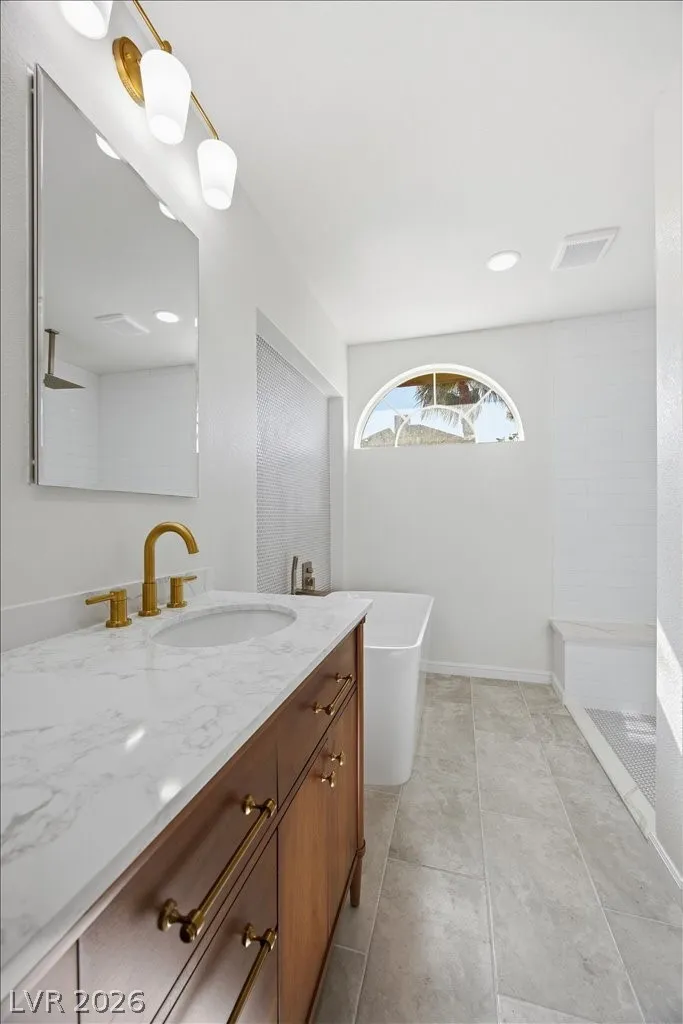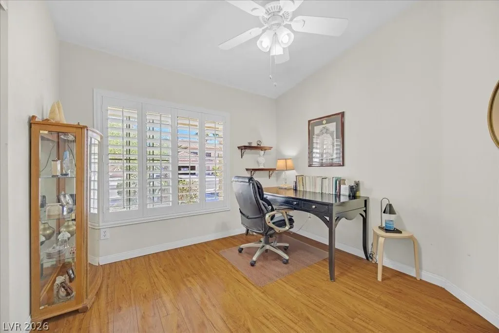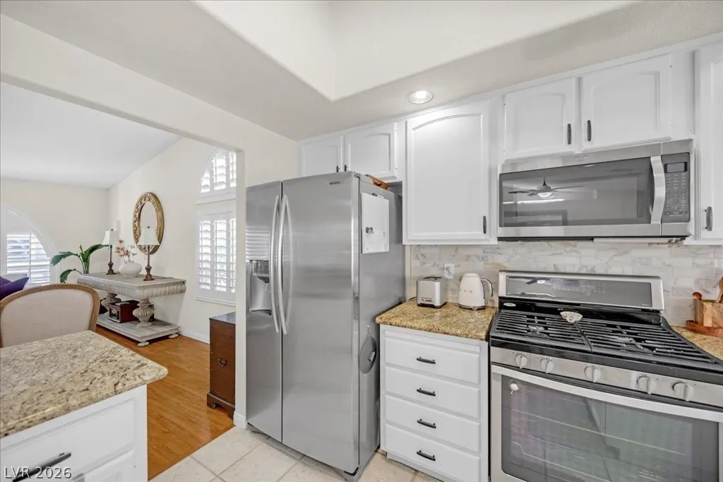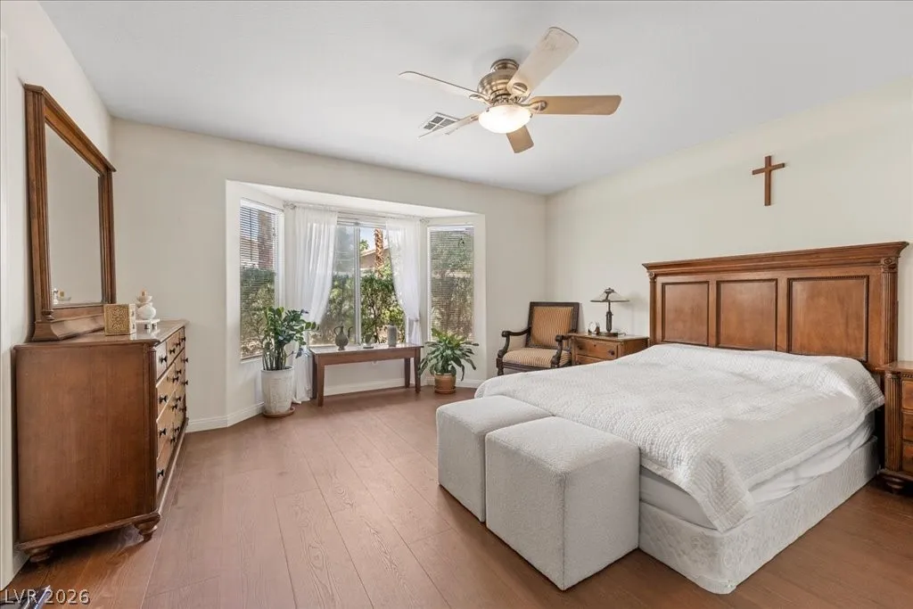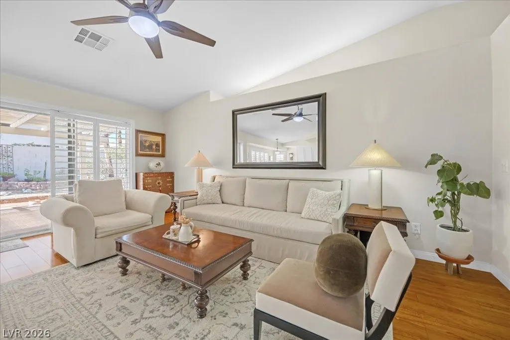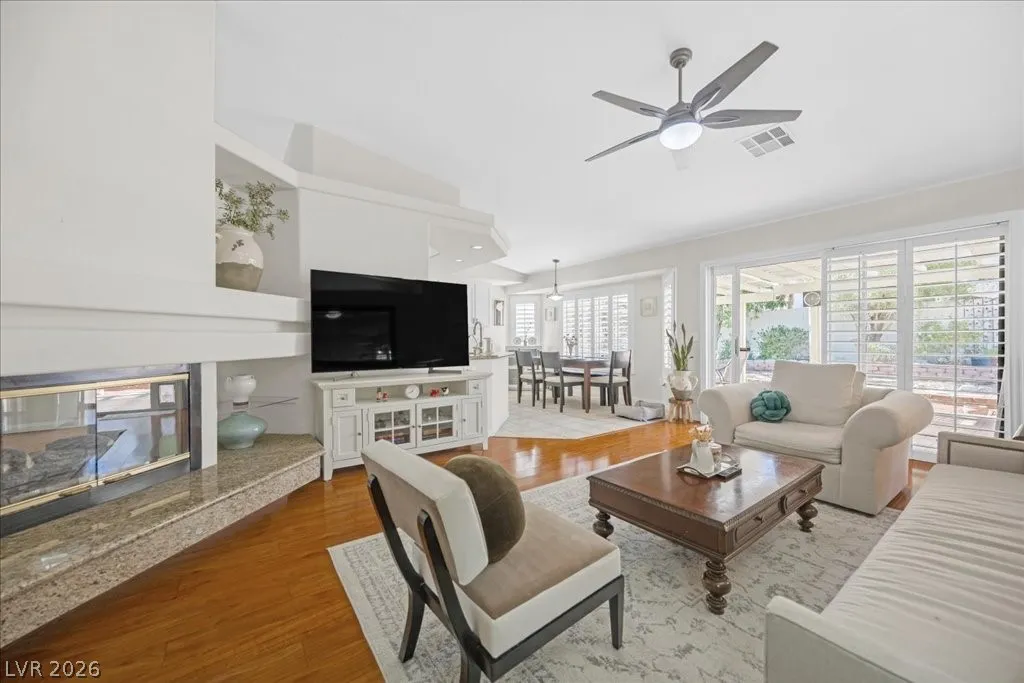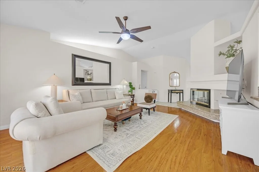 Exquisitely well-kept single-story home blends comfort with refined character and thoughtful design. Meticulously cared for by the original owners, the entry features a front door embossed with decorative glass, custom wood shutters, and a multi-way fireplace. Rich wood laminate flooring, vaulted ceilings, and built-in speakers create a ambiance throughout. The kitchen features granite countertops, stainless steel appliances, recessed lighting, and a deep-set sink. A new high-end HVAC system, new water heater, and a quality water softener ensures year-round comfort. The newly remodeled primary suite offers large bay windows, customized spacious walk-in closet, dual vanities, and a sit-down glass-enclosed shower with premium fixtures. Lush front yard adds curb appeal and the vibrant backyard has mature landscaping—the home is ready for you to move in and enjoy!