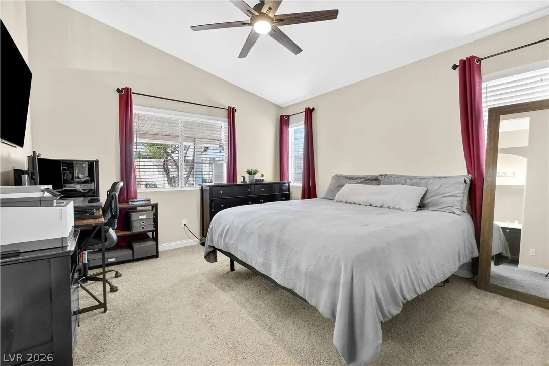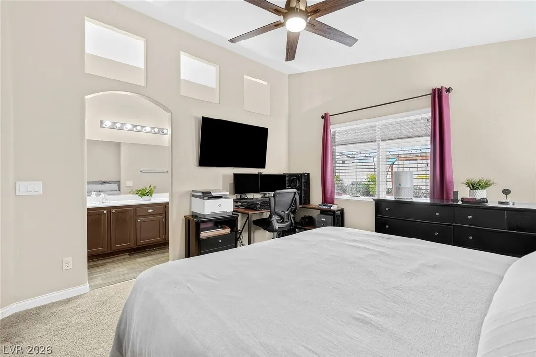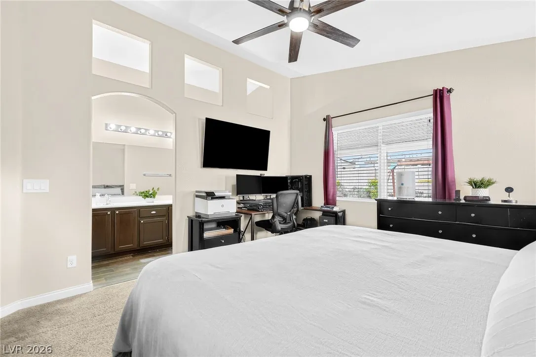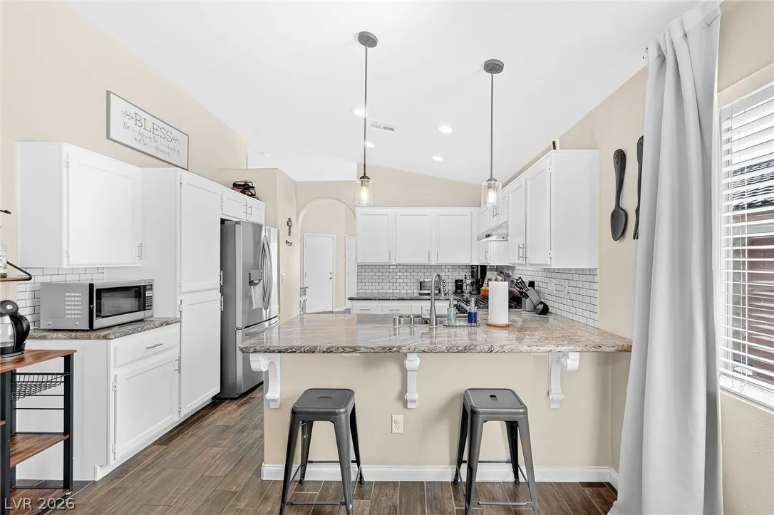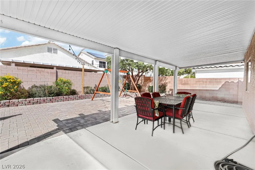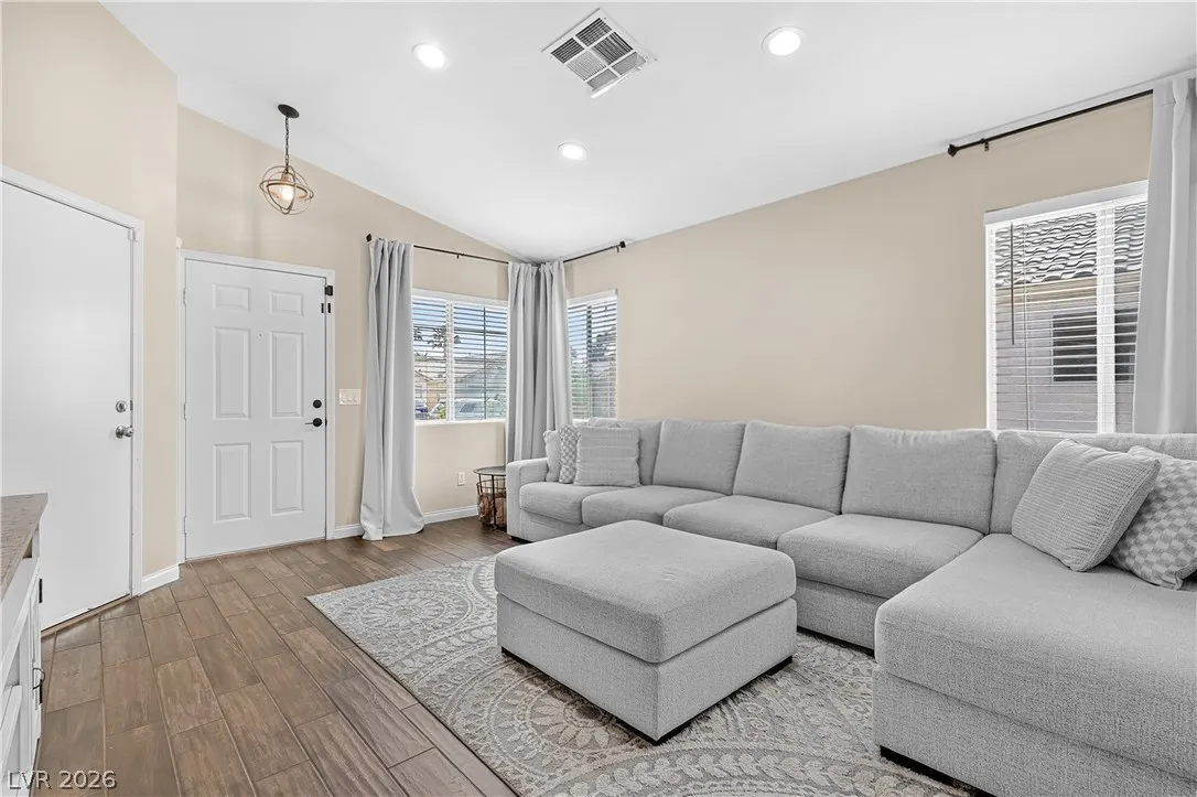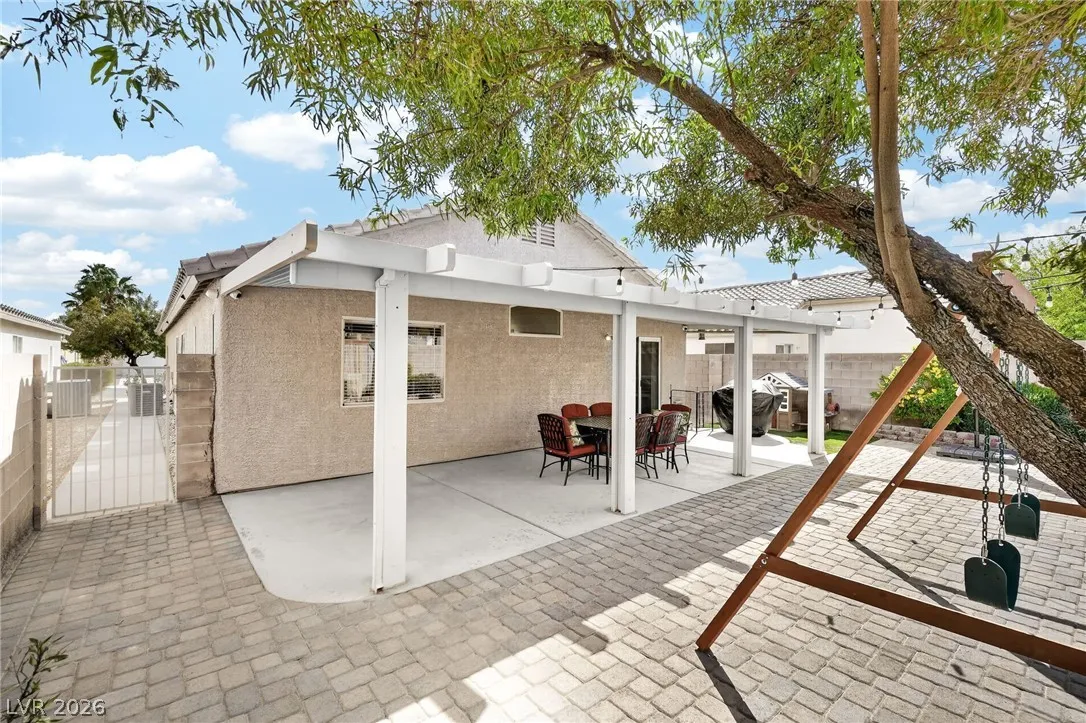 This stunning single-story residence blends modern comfort with sophisticated design, offering an expansive open-concept layout ideal for today’s lifestyle. Inside elegant wood-look tile flooring, soaring vaulted ceilings, and abundant natural light create a bright and inviting atmosphere, complemented by a neutral color palette throughout. The beautifully updated kitchen features crisp white cabinetry, premium granite countertops, a classic subway tile backsplash, stainless steel appliances. Upgraded recessed lighting and new ceiling fans have been installed throughout the home. Exterior improvements include fresh exterior paint, a new garage door, and upgraded landscaping in both the front and backyard, creating a polished modern look that immediately stands out. Step outside to a meticulously maintained backyard designed for relaxation and entertaining, complete with a large covered patio, stylish paver stones, and a versatile play area, all surrounded by a private block wall.