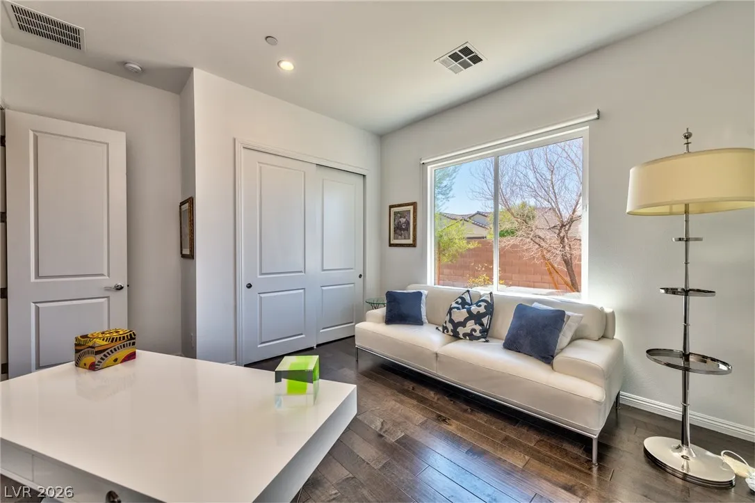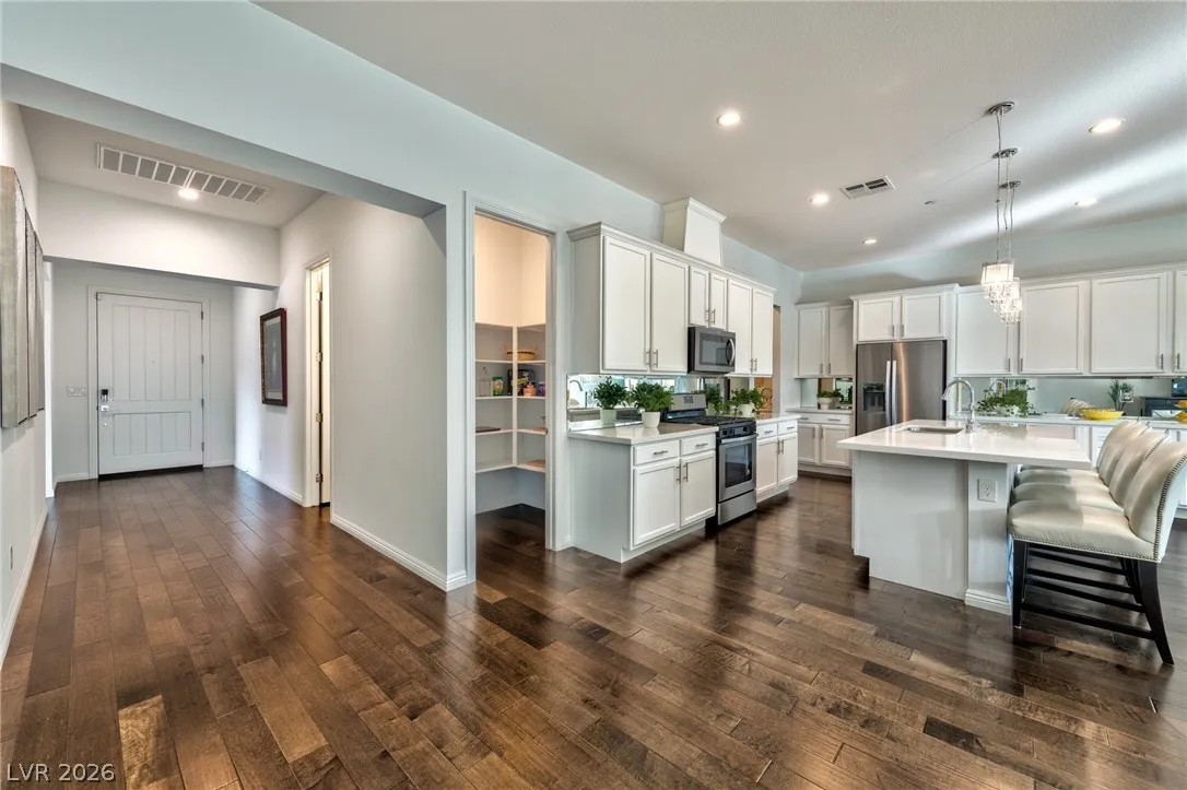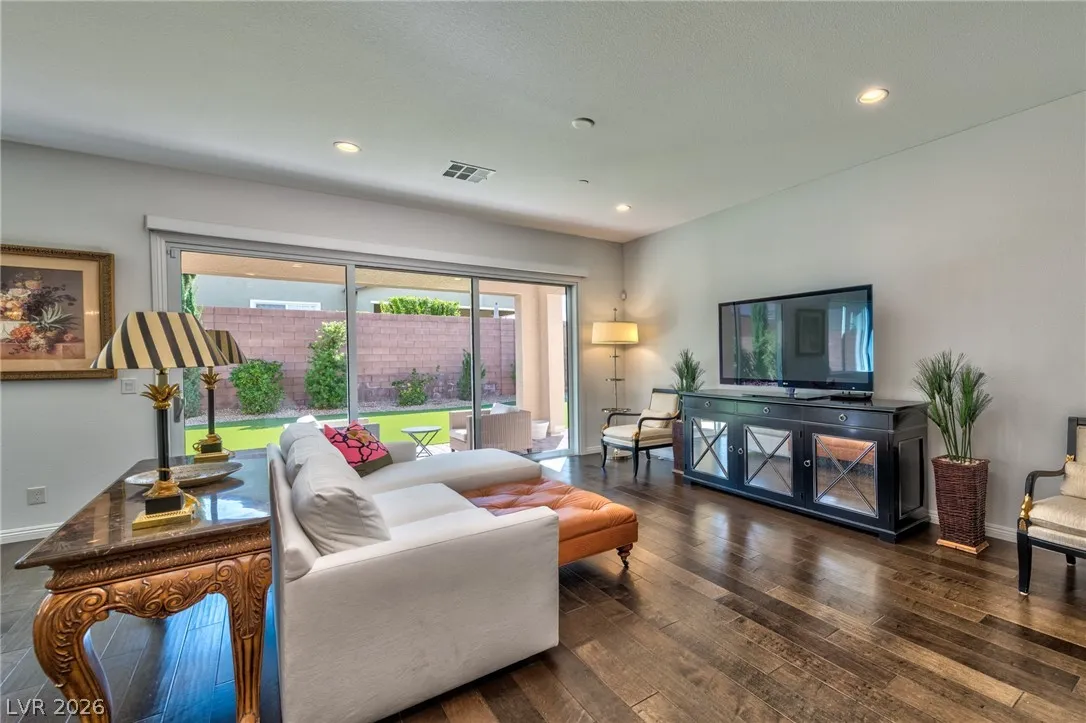 Stunning Toll Bros Hillcrest model on highly desirable model home cul de sac. Absolutely pristine condition inside & out w/extensive upgrades throughout features spacious, open concept kitchen, living room, & dining room w/ 12′ glass multi sliding door, high end real wood flooring throughout, upgraded cabinetry, countertops, faucets, sinks, electrical/lighting, auto shades and kitchen backsplash. Primary bedroom opens to the backyard w/extended glass shower &b large walk-in closet. The over-sized corner lot provides a large backyard and side yard w/ room for a pool. This amazing home includes a 3 car garage w/epoxy flooring, Rinnai tankless water heater, ADT alarm system w/integrated electronic front door lock & all appliances. Located across from Aventura Park and is walking distance to Starbucks, Albertsons, restaurants, gym and shopping. Inspirada features 7 parks, 5 pools, year-round activities & events for all ages, extensive walking trails and hiking in nearby Sloan Canyon.