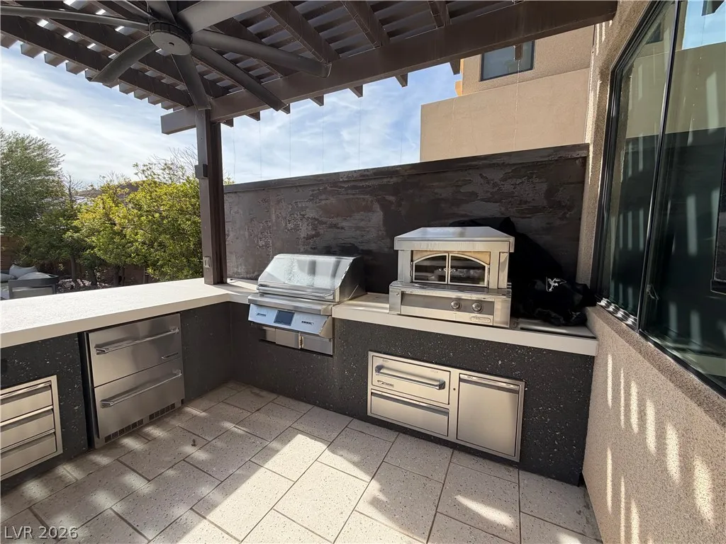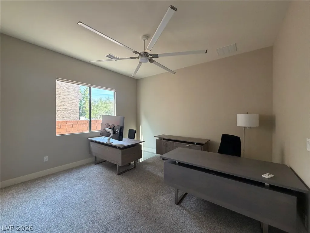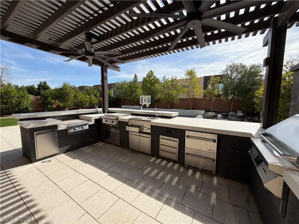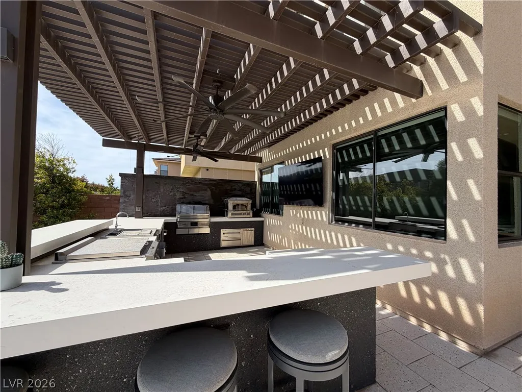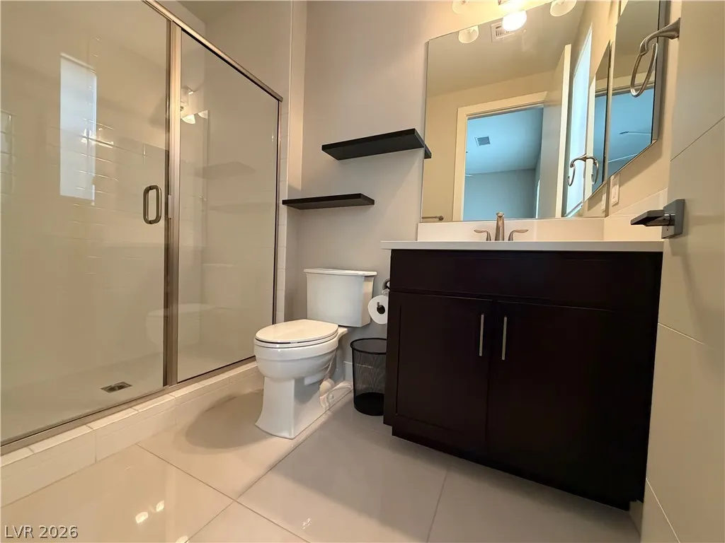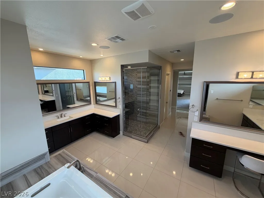 4-bedroom home in the Ridges community of Summerlin, located in Sterling Ridge. Each bedroom includes an en-suite bathroom and walk-in closet, plus an additional half bath. The primary suite features a private balcony and bathroom with dual sinks, separate tub, and walk-in shower.