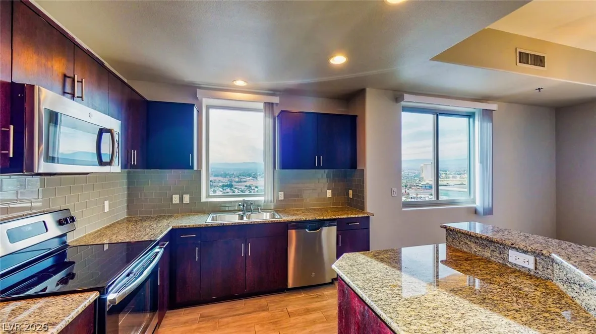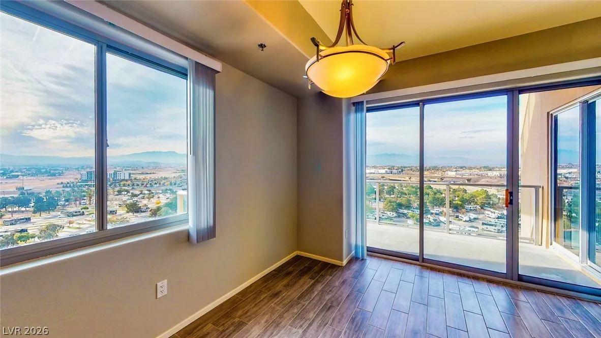 One Las Vegas – Very spacious and open layout with 2 bedrooms, 2 1/2 baths and a den! What a view from this corner unit with wrap around double balconies. Granite counters and stainless appliances. 2 parking spaces. Wood like tile. Community