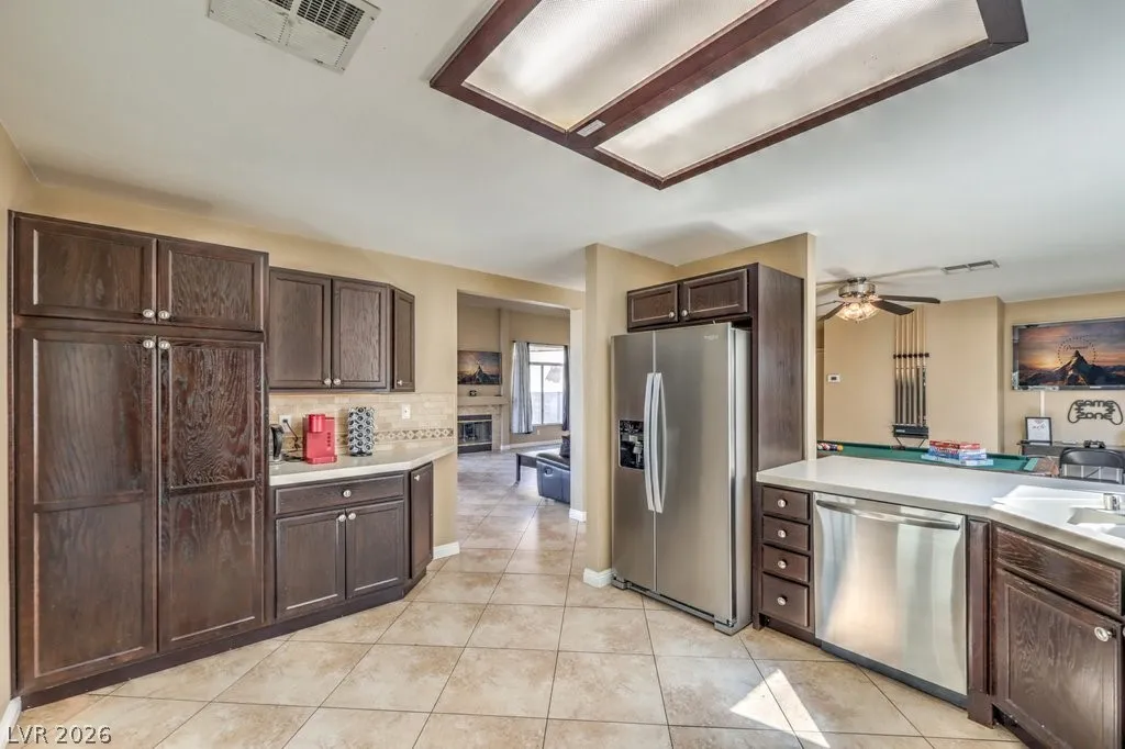 The open-concept main living area includes a cozy fireplace and smart TV, seamlessly connecting to a fully equipped kitchen with modern appliances and a dining area. A dedicated game room with a pool table adds a fun and unique touch, perfect for entertaining guests.