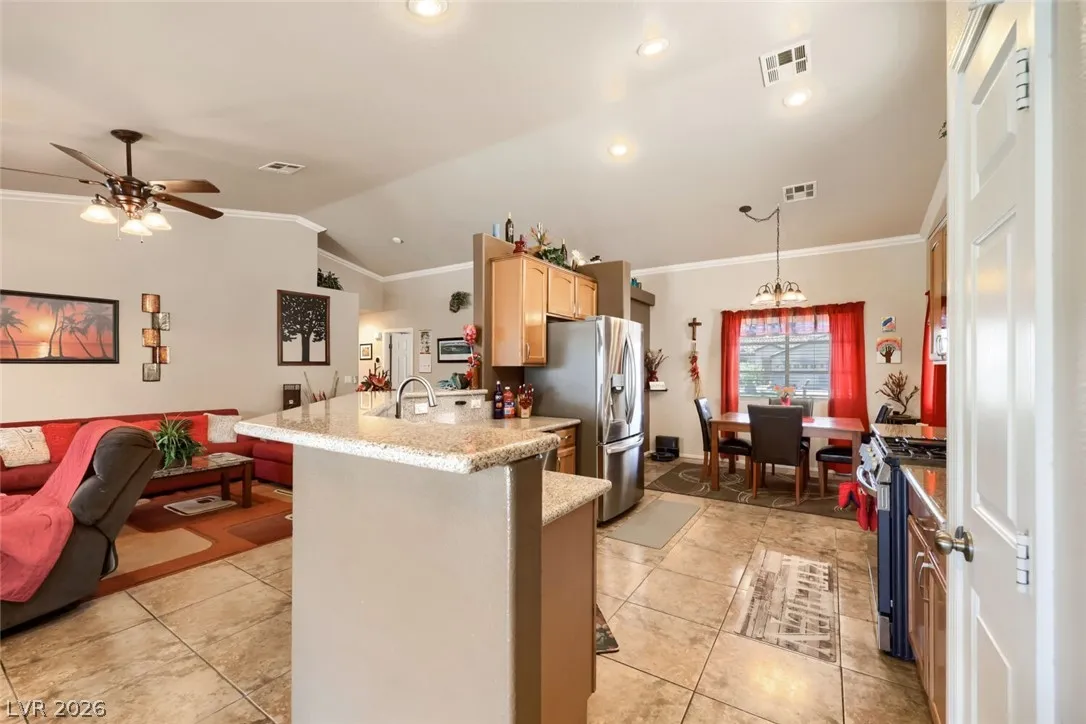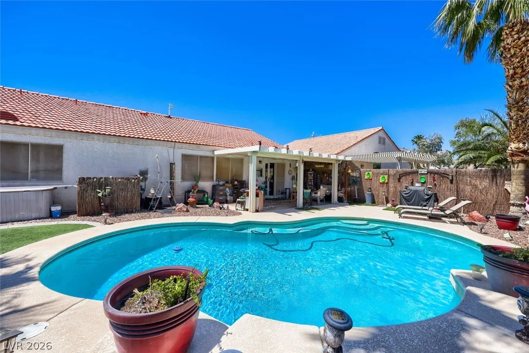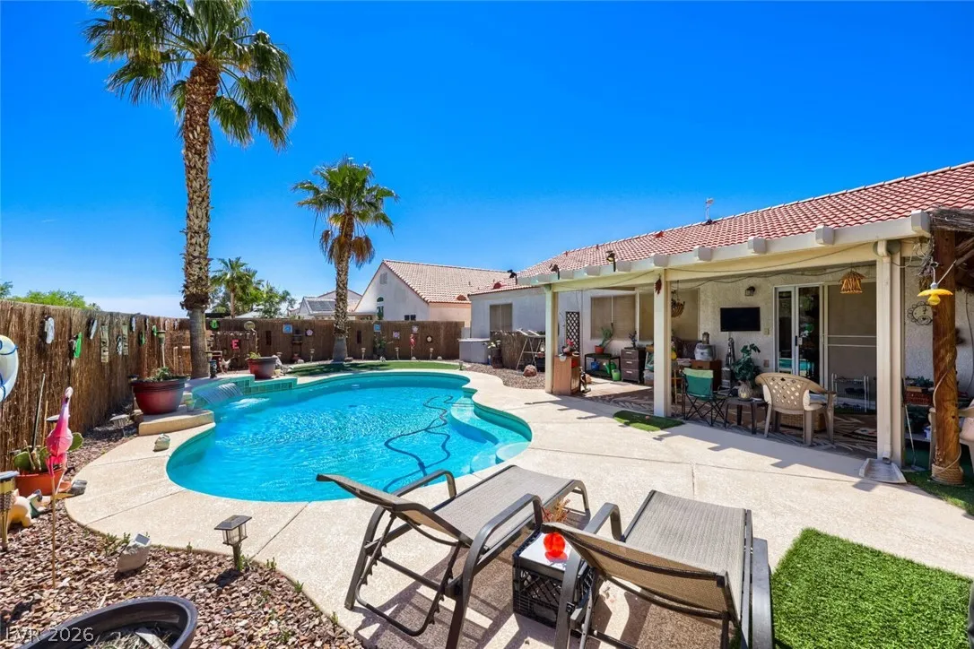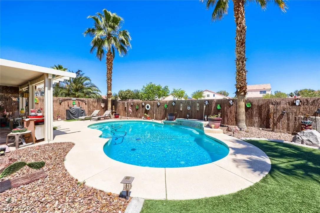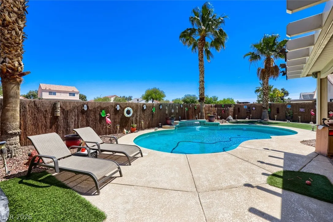 GORGEOUS SINGLE-STORY HOME WITH 3 BEDROOMS, 2 BATHROOMS, NO REAR NEIGHBORS, & A SPARKLING POOL! BRIGHT, OPEN, AIRY FLOOR PLAN WITH A FRONT LIVING ROOM FILLED WITH NATURAL LIGHT & VAULTED CEILINGS. 20-INCH TILE FLOORING THROUGHOUT THE MAIN LIVING AREAS. KITCHEN FEATURES A BREAKFAST BAR/COUNTERTOP, GRANITE COUNTERTOPS, BUILT-IN MICROWAVE, LOW-MAINTENANCE TILE FLOORING, & APPLIANCES THAT ARE LESS THAN 2 YEARS OLD. SEPARATE DINING AREA WITH A SLIDING GLASS DOOR LEADING TO THE BACKYARD. SPACIOUS PRIMARY SUITE FEATURES A WALK-IN CLOSET. PRIMARY BATHROOM INCLUDES A CUSTOM WALK-IN MASSAGE BATHTUB & SEPARATE SHOWER. SECONDARY BEDROOMS OFFER AMPLE CLOSET SPACE. ADDITIONAL FEATURES INCLUDE A NEWER HOT WATER HEATER & WATER FILTRATION SYSTEM. LARGE BACKYARD OASIS FEATURES A POOL, COVERED PATIO, ARTIFICIAL TURF, & LOW-MAINTENANCE LANDSCAPING. CONVENIENTLY LOCATED NEAR SHOPPING, DINING, ENTERTAINMENT, & FREEWAY ACCESS.