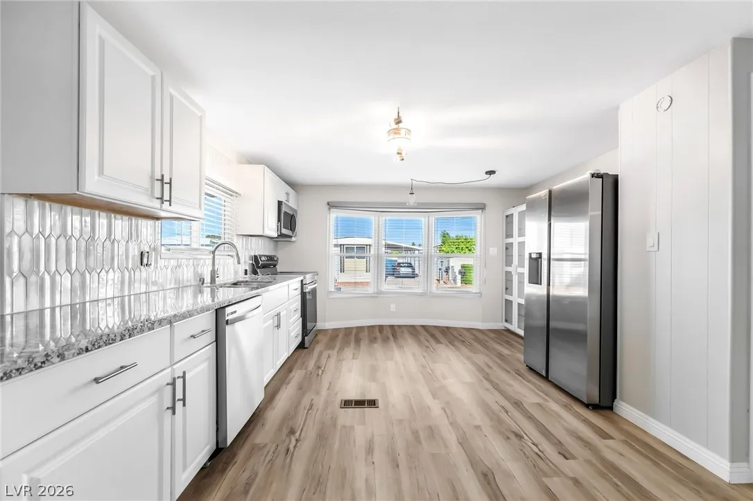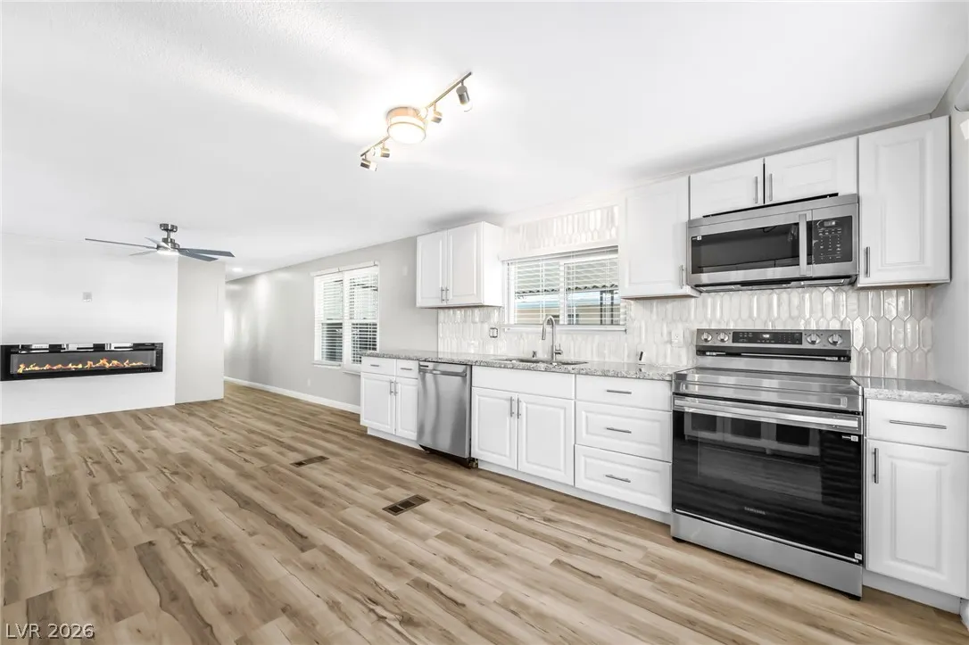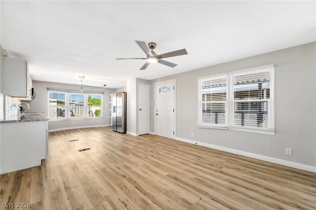 STUNNING FULLY RENOVATED HOME WITH NO LAND LEASE. CONVERTED TO REAL PROPERTY No expense spared! 3 remodeled Bedrooms, 2 newly remodeled bathrooms with new custom tile, new cabinets, mosaic designs, and quartz countertops. Open floor plan with Family room. LED FIREPLACE WALL. Kitchen and bathrooms all have beautiful Luxury Vinyl Plank, new tile in bathrooms, new carpet in bedrooms and new baseboards Throughout. Freshly painted inside and out. Open kitchen to the family room with New STAINLESS STEEL STOVE, DISHWASHER, MICROWAVE AND REFRIGERATOR! Front and back yard landscaping have low maintenance synthetic grass with rock. Home is in DESERT INN MOBILE ESTATES TRACT so one owner must be over the age of 55. This property is one of a kind and will not last long!!