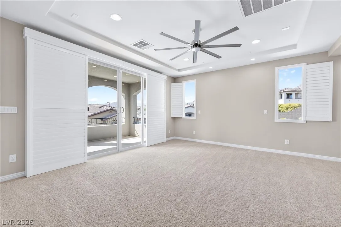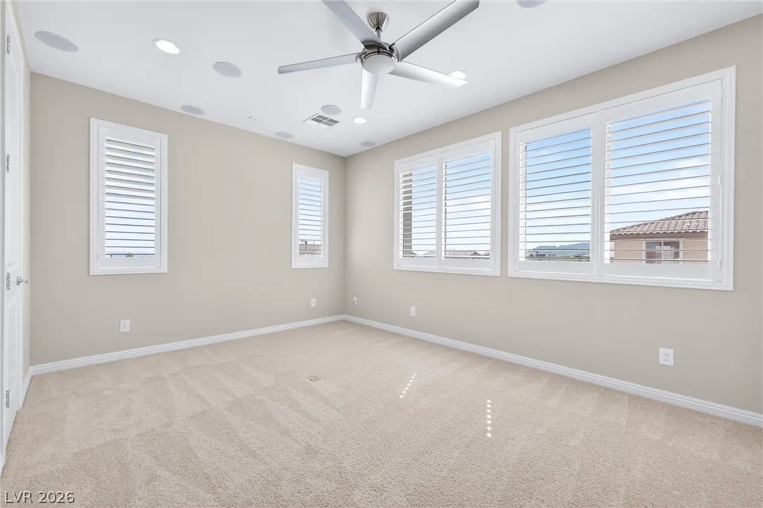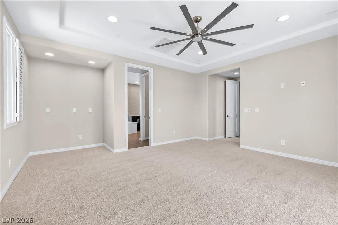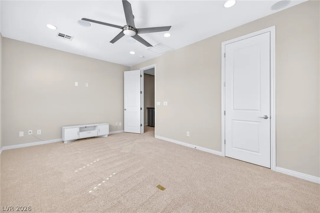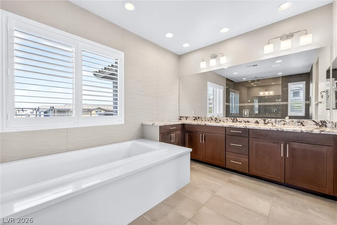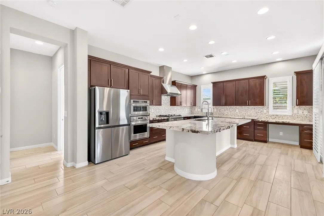 Spacious 5 bedroom, 4 bathroom home situated on a cul-de-sac with a 3-car garage and private courtyard entry. The kitchen showcases stainless steel appliances, a brand-new refrigerator, dual sinks, and a statement island, opening to the main living area and covered patio for seamless indoor-outdoor living. One bedroom and a 3/4 bath are located downstairs, ideal for guests or multigenerational living. Upstairs, the primary suite features a private balcony with Strip views, custom closet, and an oversized bathroom with walk-in shower and separate soaking tub. One secondary room is wired for surround sound. All secondary bedrooms include walk-in closets, with one offering an ensuite bath. Oversized laundry room with brand-new washer and dryer. Backyard designed for resort-style living with raised pool and spa, covered Alumawood patio with misting system, BBQ stub, artificial turf, and mature fruit trees.